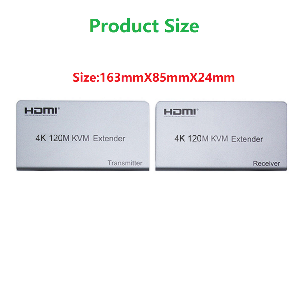 4K 120M HDMI KVM Extender over RJ45 Ethernet Cat5e/6 Cable HDMI USB extender Transmitter Receiver kit Support USB Mouse Keyboard Specifications: Length of CAT5e/CAT6 cable between Rx and TX: 120 meters HDMI Input: 4k 30hz/1080p/720p/576p/576i/480p/480i HDMI Output: 4k 30Hz/1080p/720p/576p/576i/480p/480i Max bandwidth: 340MHz Max baud rate: 3x3.4Gbps Input video signal: 0.5~1.5Volts p-p Output DDC signal: 5Volts p-p (TTL) Input HDMI cable distance: ≤10m AWG26 HDMI standard cable Output HDMI cable distance: ≤10m AWG26 HDMI standard cable TX Max working current: 350mA RX Max working current: 200mA Power Supply: DC5V/1A Operating Temperature range: 0°C to +55℃ Operating Humidity range: 10% to 80%RH (No Condensation) Storage temperature range: -10°C to 70°C Storage temperature range: 5% to 90% RH (No Condensation) Dimension (L x W x H): 163x85x24 (mm) Audio format: Stereo TX Weight: 499g RX Weight: 494g Features: *Support HDMI 1.4/HDCP1.4; *Support local loop-out ; *Support 120m long distance transmission. *Low power consumption, low temperature and high safety; *Both the TX and RX support 3.5MM left and right audio output; *Support IR control; *Support USB mouse and keyboard extension; Package includes: 1x Transmitter 1x Receiver 1x USB cable 1x IR-RX cable 1x IR-TX cable 2x DC 5V/1A selectable Power adapter 1x User manual