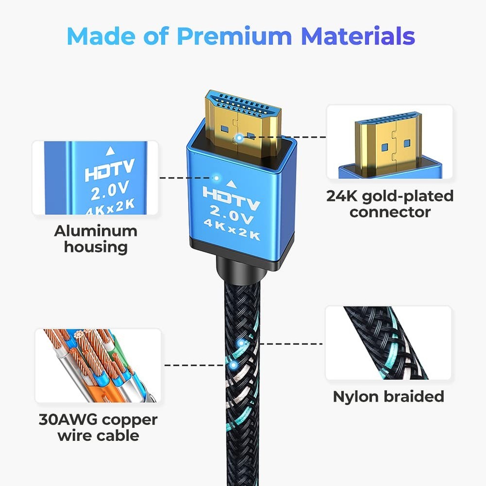 4K High Speed HDMI Cable, Aluminum Shell & Braided Nylon & Gold Connectors, 4K@60Hz UHD HDR HDMI 2.0 Cable, Compatible with Ethernet, PS4, Bluray, Projector, Monitor, HDTV - 10 Feet Meet HDMI specifications: Male to Male HDMI 2.0 Cable with ethernet supports 4K Video at 60Hz, 48 bit/px color depth HDR, Audio Return Channel(ARC), Dolby True-HD, DTS-HD and CEC. It's backwards compatible with earlier versions of HDMI cable (1.4/1.3/1.2/1.1) NOT for 8K. Superior Compatibility: Compatible with all of your HDMI devices DVD/Blu-ray players, Computer, Laptop, Monitor, Projector, Apple TV, PS4, PS3, XBOX One, XBOX 360, Nintendo Switch and more. Made of Premium Materials: The 30AWG copper wire for highest compatibility and transmission performance with modern equipment. Jacket connector part is made of 24K gold-plated material for accurate signal transmission and anti-corrosion. Premium aluminum housing for better thermal insulation. Nylon braided cable for maximum durability. Rigorously Testing: Each cable has been passed signal test, bend test, electromagnetic interference (EMI) test. We ensure that each cable meets the standards to provide high speed and reliable transmission performance. Cable length: 3 feet (0.9 meters) / 6 feet (1.8 meters) / 10 feet (3 meters) / 15 feet (4.6 meters) / 20 feet (6.1 meters) / 25 feet (7.6 meters) / 30 feet (9.1 meters)