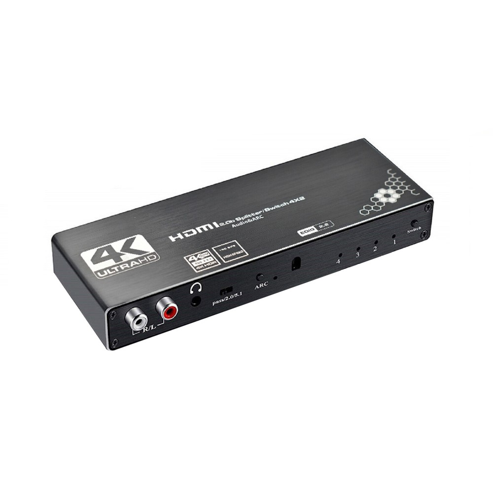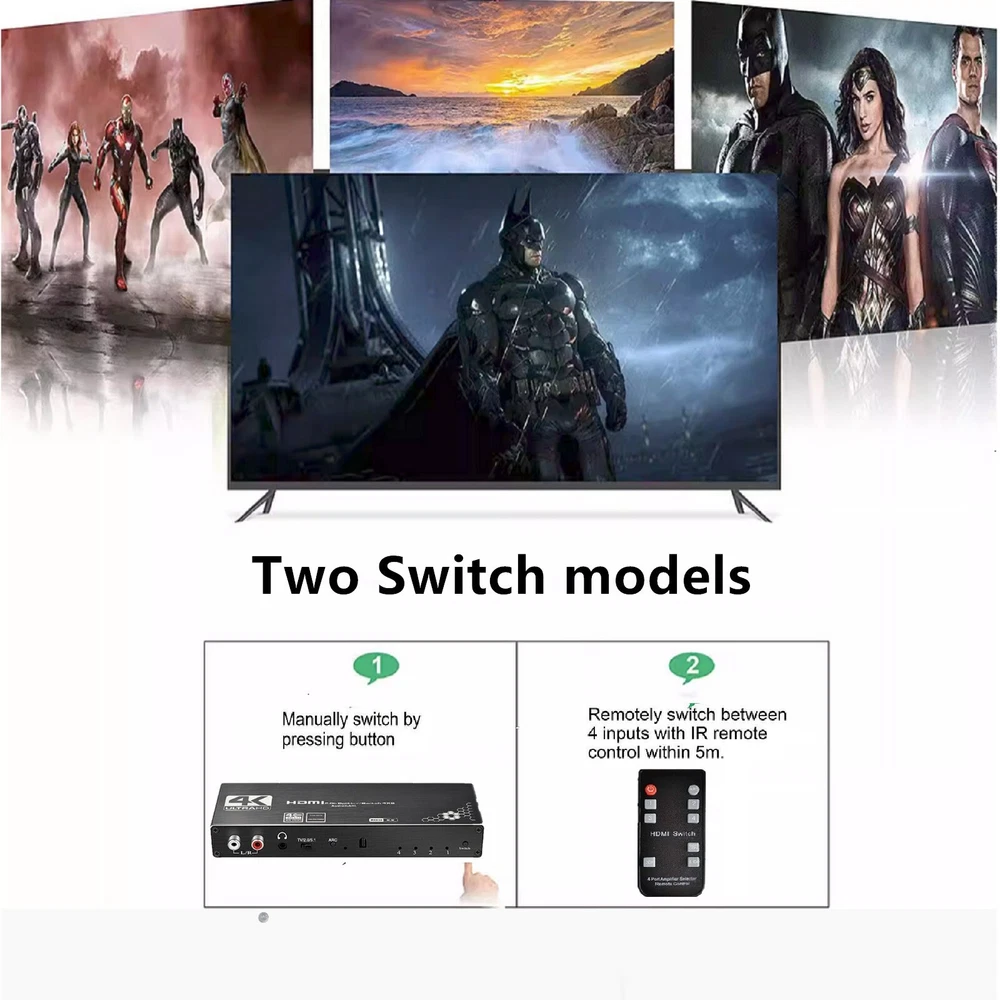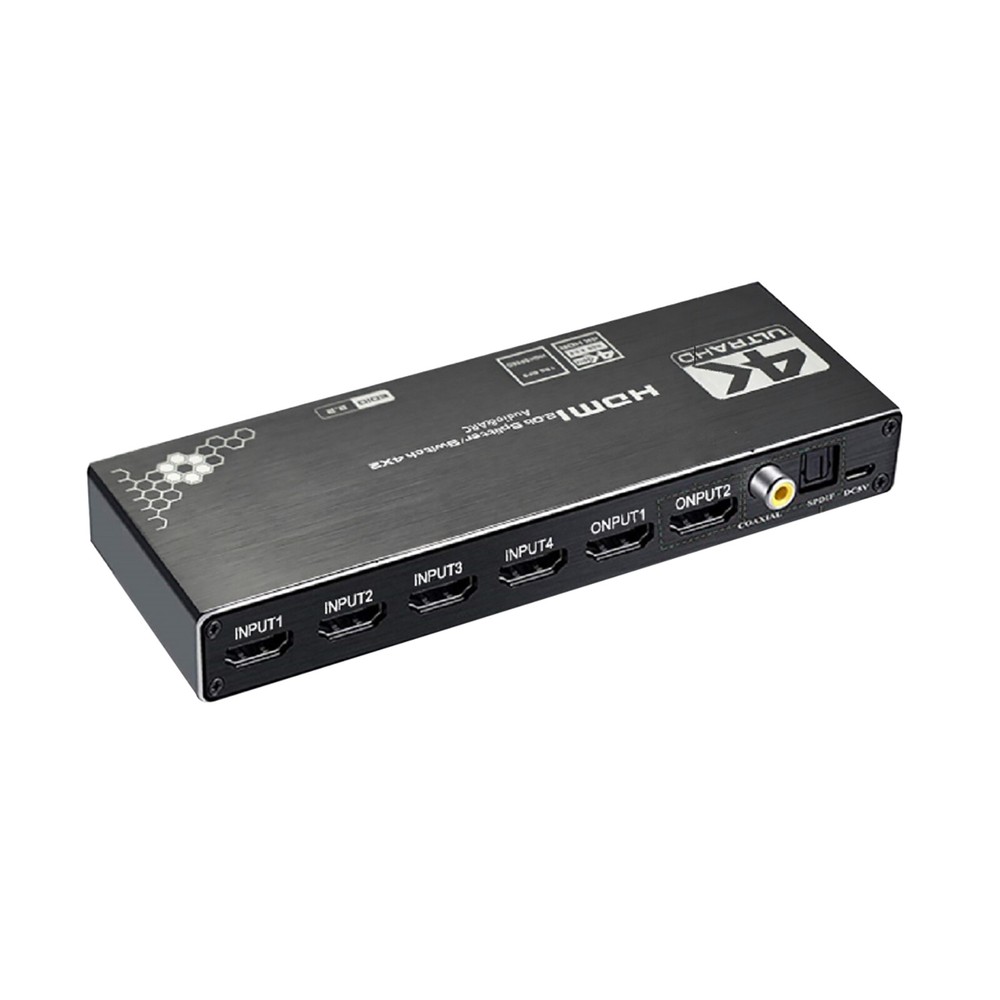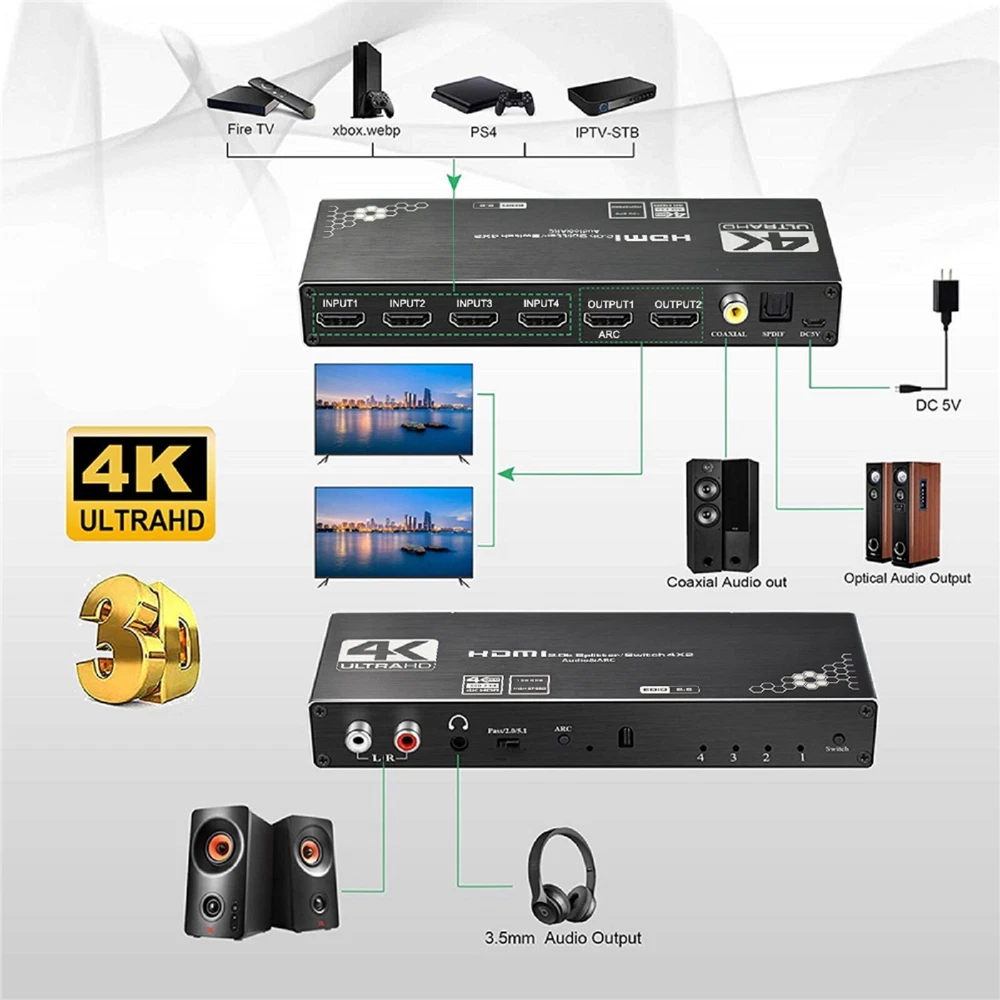 Product Description HDMI Switch 4X2 With Audio separation 4 in 2 out 4K@60Hz HDMI Switcher with ARC Function Specifications: Supports full HD, 1080P, full 3D, 4K * 2K 2160 Supports 24 bit, 30 bit, 36 bit, and 48 bit dark colors. Compatible with HDCP1.2/1.4, 2.0, supporting 36 bit true color 64 bit HDMI input supports any HDMI signal processing, output parameters: 3860 * 2160p HDCP 2.2 HDR 4K * 2K Support for Blu ray DVD24/50/60fs/HD.DVD Supports audio formats DTS.HD/Dolby.trueHD/LPM7.l/DTS/Dolby.AC3/DSD Support signal timing recombination and automatic recovery recognition Supports 1080P, 4K, YUV4:2:0 RGB 8.8.8 4K60Hz Supports HDR (limited to 1080P 4K60HZ) Power supply: DC5V/2A Features: 1. 4 in 2 out HDMI Switch: 4x2 HDMI switch splitter allow four HDMI devices to be switched or split easily to two HD-MI compatible monitors or projectors, Ideal solution for home theater, office, school, conference room, shopping mall, hotel or museum. 2. 4k@60HZ Resolution: Supports a multitude of video resolutions, including 4K x 2K, 1080P, Ultra HD, 3D, HD audio and etc, Supports HDR for 2K, HDCP1.4, HDMI 2.0 Support HD-MI Resolution up to 4K@60hz, 12bit per channel(48bit all channels)Deep Color. 3. Multi-audio output with ARC: With Optical Tolink SPDIF+L/R+3.5mm Jack+Coaxial audio out,Supports LPCM/Dolby/DTS 5.1 channel.Supports ARC (Audio Return Channel),Extractor the Audio from TV to speak, Sound bar or Amplifier. Connect your TV HD-MI (ARC) Port to this switch HD-MI Output Port with HD-MI Cable,then using optical/Coaxial /R/L cable or 3.5mm headphone to the sound bar, Speaker, home theater, A/V receivers etc.No distortion of audio or video. 4. When restarting or resetting, the input signal HDMI 1 will be defaulted Package included: 1x 4K HDMI switch 1x IR Remote Control 1x Micro USB Power cable 1x DC 5V/2A power adapter 1x User Manual Shipping Returns Contact Us Payment 1. Items sent from US warehouse. 2. Receiving time = Processing time + Shipping time. 3. Pro cessing Time: Around 1-2 business Days. 4. Shipping Time: 3-5 business day. it may have a little delay during some holiday (such as Christmas), any problem, please feel free to contact. 1. 30 days warranty from the purchased date. Please contact us via email before returning the defective item. 2. Our warranty does not extended to any product that are physically damaged or that are not under normal operating conditions as result of misuse or improper installation on the buyer/user's part. 3. Return items should include the original packaging and all accessories. buyers MUST contact us for the returning address. 4. In all cases, buyers pay shipping fees at their own cost to return products for exchange or refund. We will be responsible for the postage of replacements. Refund will be made upon receipt of the returned item. If you have any question, please e-mail us immediately, we will reply you as quickly as possible. We care about our valued customers, and will always try to help you. We accept all verified payment from eBay. Shipping 1. Items sent from US warehouse. 2. Receiving time = Processing time + Shipping time. 3. Pro cessing Time: Around 1-2 business Days. 4. Shipping Time: 3-5 business day. it may have a little delay during some holiday (such as Christmas), any problem, please feel free to contact. Returns 1. 30 days warranty from the purchased date. Please contact us via email before returning the defective item. 2. Our warranty does not extended to any product that are physically damaged or that are not under normal operating conditions as result of misuse or improper installation on the buyer/user's part. 3. Return items should include the original packaging and all accessories. buyers MUST contact us for the returning address. 4. In all cases, buyers pay shipping fees at their own cost to return products for exchange or refund. We will be responsible for the postage of replacements. Refund will be made upon receipt of the returned item. Contact Us If you have any question, please e-mail us immediately, we will reply you as quickly as possible. We care about our valued customers, and will always try to help you. Payment We accept all verified payment from eBay. You may also like 5/16" Line Fuel Filter Replace Part For Mercury For Quicksilver Marine Engine 12.33 USD Metal Bead Eyeglass Chain Glasses Strap Holder Lanyard Sunglasses Non-slip 8.93 USD 1.99 USD Telecom Single Mode Fiber Optical PLC Splitter SC/UPC 1*4 1x4, 1 to 4 Module 8.58 USD 1.8mm Thickness Quick Release Watch strap Band Spring Bar Repairing Tool 17.53 USD 1.99 USD New MB-D18 Vertical Multi-Power Battery Grip Replacement For Nikon D850 Camera 55.93 USD 1.99 USD Black Silicone Cover Pad With Strap For JBL Charge 5 Bluetooth Speaker 16.93 USD powered by