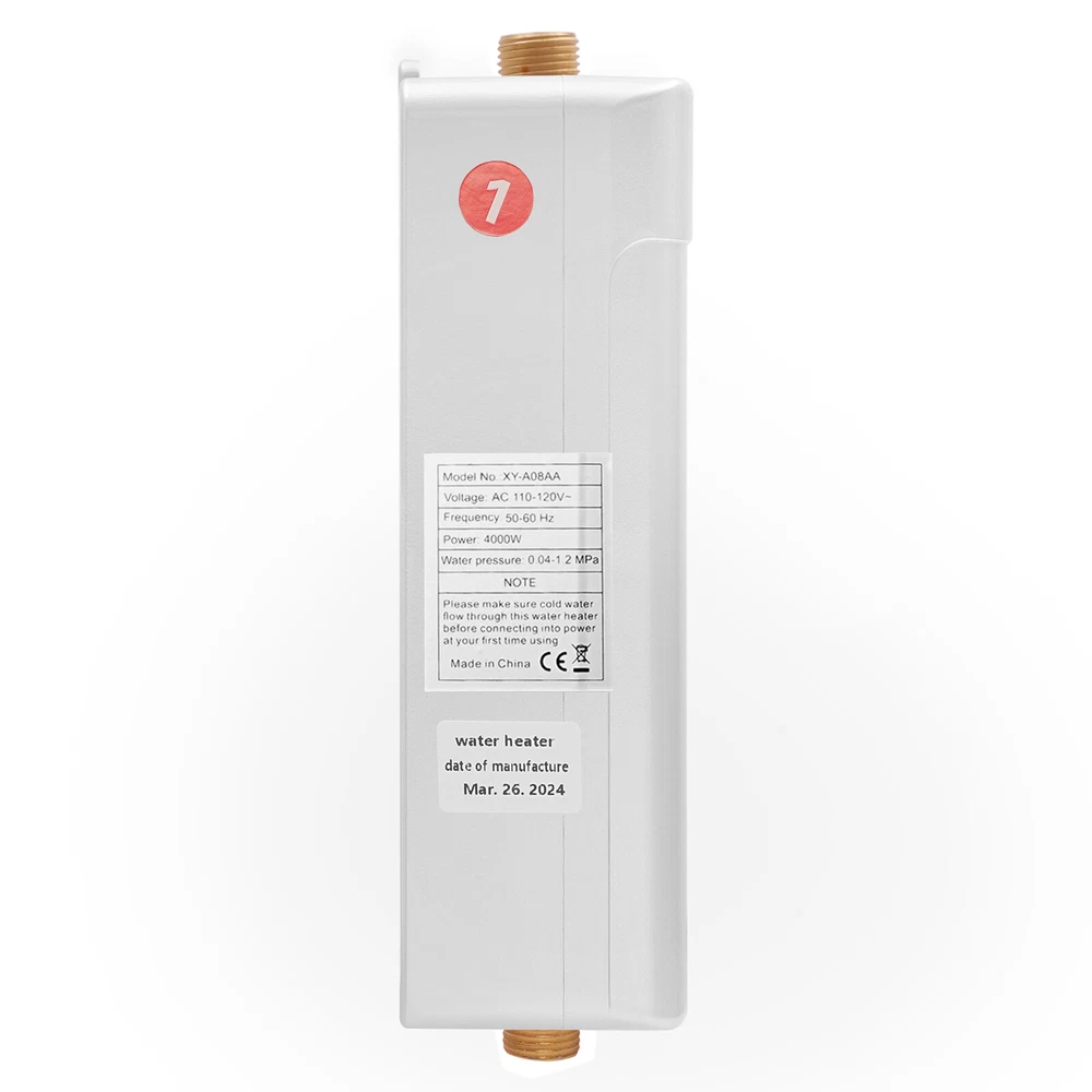 Package Included 1* Electric Water Heater 1* Remote Control 1* English Manual All Accessories for Assembly ❤❤❤Welcome to royalfeatured ❤❤❤ Description The exquisite electric water heater can bring you luxurious and comfortable water enjoyment, elevating your daily water use to a realm of elegance and convenience. Its streamlined design is ergonomic and blends seamlessly with the aesthetics of the kitchen, reflecting the ideal harmony between form and function. Its advanced heating technology ensures a steady supply of water at your desired temperature. Key Features Build to Last: It is mainly made of high-quality ABS and aluminum, making it insulating, strong, solid, wear-resistant, and not easy to deform, ensuring a long service life. High Efficiency: The 4000W of power and the fast heat-conducting aluminum heating tubes provide you with hot water in short time without storing water and preheating, avoiding long waits. The AI intelligent thermostat chip will quickly match the heating power required for washing according to the inlet temperature, outlet temperature, and water storage volume without having to endure hot and cold fluctuations. Safety First: It has IPX4 waterproof rating, anti-electricity wall protection, water and electricity separation technology, high-temperature dry burning, fault alarm, anti-high voltage protection, leakage detection, which ensures the safety of use. Thoughtful Design: The included remote control allows you to switch on and off and set the temperature(82.4-131°F) within 3.28-6.56ft , and the temperature can also be adjusted by touch screen on the body, plus it has a temperature memory function to meet your usage habits. Energy-saving: It uses an electric water heater with an inverter design that automatically adjusts the power input based on flow rate and temperature settings. When the water flow is reduced, the system consumes less electricity for energy-saving. Compact and Space-saving: With its compact size (5.31*2.56*9.45 inches) and simple structure, you can mount it vertically on the wall or under the sink/cabinet without taking up too much space. Ideal Gift: Thanks to its excellent performance, you can give it as a holiday, birthday, or housewarming gift to your family and friends. Protective Package : We have used a sponge to wrap this product, designed to minimize damage to the product during shipping. Details LCD Screen: It shows the temperature clearly and makes it easy for you to see. Cold and Hot Water Inlets: They make it easy for you to link water pipes, faucets or shower heads. Pre-drilled Holes: They make it easy for you to install the product. Application It can be used in homes, schools, hospitals, offices, bars, kitchens, bathrooms, public restrooms and laundries, etc. Specifications Color: White Style: Modern Shape: Rectangular Assembly Required: Yes Mount Type: Vertical Power Source: Corded Electric Material: ABS and Aluminum Model: XY-A08AA Voltage: AC 110-120V Frequency: 50-60Hz Power: 4000W Pressure: 0.04-1.2MPa Waterproof Level: IPX4 Screen Type: LCD Pipefittings: About 2cm/0.787in Temperature Adjustment Range: 28-55°C/82.4-131°F Operating Temperature: 30-50°C/86-122°F Remote Control Range: 1-2m/3.28-6.56ft Remote Control Battery Type: 2*AAA Batteries(Not Included) Product Size: 13.5*6.5*24 cm/5.31*2.56*9.45 in Package Size: 31*22.5*10.5cm/12.2*8.86*4.13in Gross Weight: 1.8kg/3.97lbs Net Weight: 1.6kg/3.53lbs Package Included 1* Electric Water Heater 1* Remote Control 1* English Manual All Accessories for Assembly Notes Please note this product is suitable for sinks but not for showers. Please note that this product must first run water before electricity. It is advisable to install this element vertically to ensure a long service life. The heating temperature depends on the flow rate and incoming water temperature. Please read the English manual and the label on the body of the product carefully before use and pay particular attention to the safety instructions contained therein. Please allow the slight color difference caused by the shooting light and 1-3cm error due to manual measurement, and make sure you do not mind before ordering. Payment Delivery details Terms of sales About us Contact us Payment We accept ebay payment 。 Fees such as import duties, taxes are not included in the item price or shipping costs. These charges are the buyer's responsibility. Delivery details Shipping: 2-9 working days to: USA Terms of sales We maintain high standards of excellence and strive for hundred percent customer satisfaction. Feedback is very important to us. We hope that you contact us immediately before you give neutral or negative feedback, so that we can address your concerns. It is impossible to address issues if we do not know about them! About us Your satis faction is our ultimate goal. We work hard to earn your trust and future business. Our certified technicians have tested each item before shipping. The unit comes with 1 year limited warranty on all manufacturing defects. a) If you receive a defective item, you may return it or ask for a discount. Please contact us within 14 days after you receive the package. b) What you returned must be intact and in its original packaging as re? u. Customer is responsible for shipping costs of the returned item. c) We will cover the cost of shipping back t with the shipping rate indicated in the registration page. We will send you a new unit or refund the full payment you paid. Thank you. Contact us Business Hour Business Hour: Monday To Friday: 8:30 AM to 5:00 PM (Beijing China time) Due to time zones, our reply to your questions may not be immediately. But within above working time, we will reply your email within 24 hours. If it's non-workdays, please kindly be patient and wait till Monday. Please contact us with ebay message. Please feel free to contact us if you have any questions. Monday To Friday: 8:30 AM to 5:00 PM (Beijing China time) Due to time zones, our re