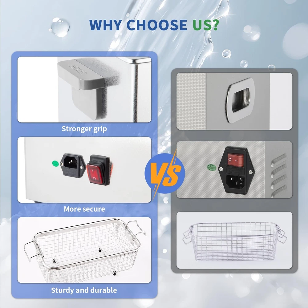 is a professional manufacturer of ultrasonic cleaners and has focused on the R&D of ultrasonic cleaners for more than 10 years. always bears in mind the "quality first, credit first" principle and tries to provide perfect products and great after-sales service. Specifications Control Mode: Touch Control Tank Material: Stainless Steel SUS304 Heating Power: 200W Ultrasonic Power: 120W Frequency: 40kHz&33kHz Power Supply: AC110V/60Hz Tank Capacity: 4L Time Setting: 1~99 Minutes Temperature Setting: Temp Settings within 0~80℃ Transducer Quantity: 2 sets Tank Size (L x W x H): 300*152*100 mm/11.8*6*3.9 in Product Size (L x W x H): 330*180*240 mm/13*7.09*9.45 in Package Contents 1 x Ultrasonic Cleaner 1 x Cleaning Basket 1 x Stainless Steel Cover 1 x Power Supply 1 x Instruction Manual Multiple Cleaning Modes for an Extensive cleaning Range: Fullwave,Semiwave,Degas,Power Sweep Cleaning Modes based on 40KHz ultrasonic frequency make the device applicable for rough surface cleaning and intensive rinse. Generally, fullwave and power sweep cleaing modes are used for making intensive rinse, while semwave is used for rough surface cleaning Touch Control Panel with LED Display and Memory Function: Touch control panel can make the device be operated without any big force and therefore make the device have a long service life; especially the preset cleaning time and heating temperature can be memorized by the device even after power-off unless it is reset manually Die-casting SUS304 Stainless Steel Tank: The inner cleaning tank of the devices is made with SUS304 stainless steel materials, and it makes the device be resistant to weak acid and weak alkali SUS304 Stainless Steel Drain Valve and Die-casting Tank: Both the cleaning tank and drain valve of the device are made with SUS304 stainless steel materials, and it makes the device be resistant to weak acid and weak alkali 0~80°C Heating Range for Degreasing and Dewaxing: Heating function is helpful for reducing the adhesion strength of oil and wax so as to improve the cleaning effect, and generally the best cleaning temperature is among 40~60°C, i.e. 104~140°F