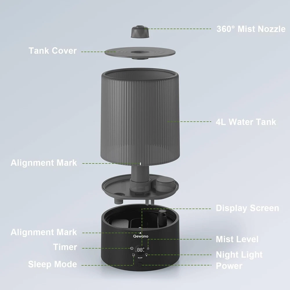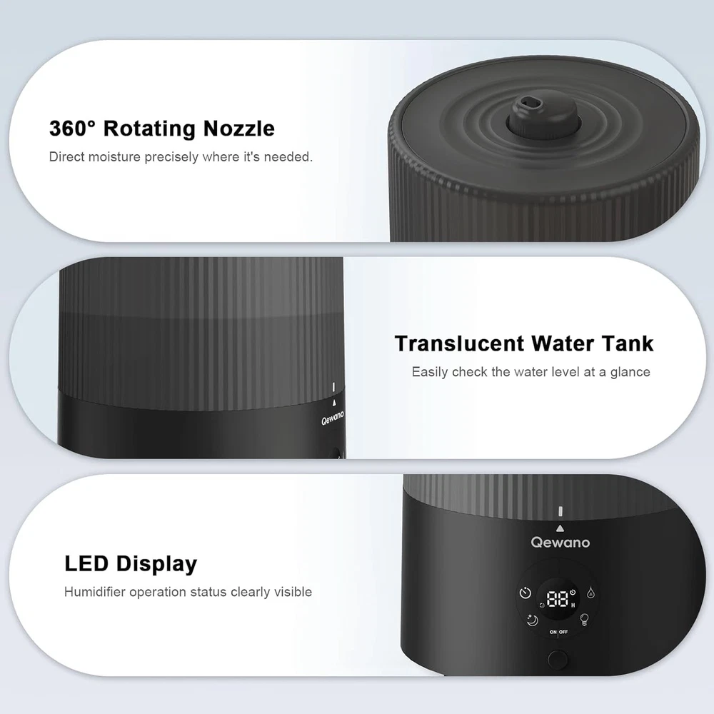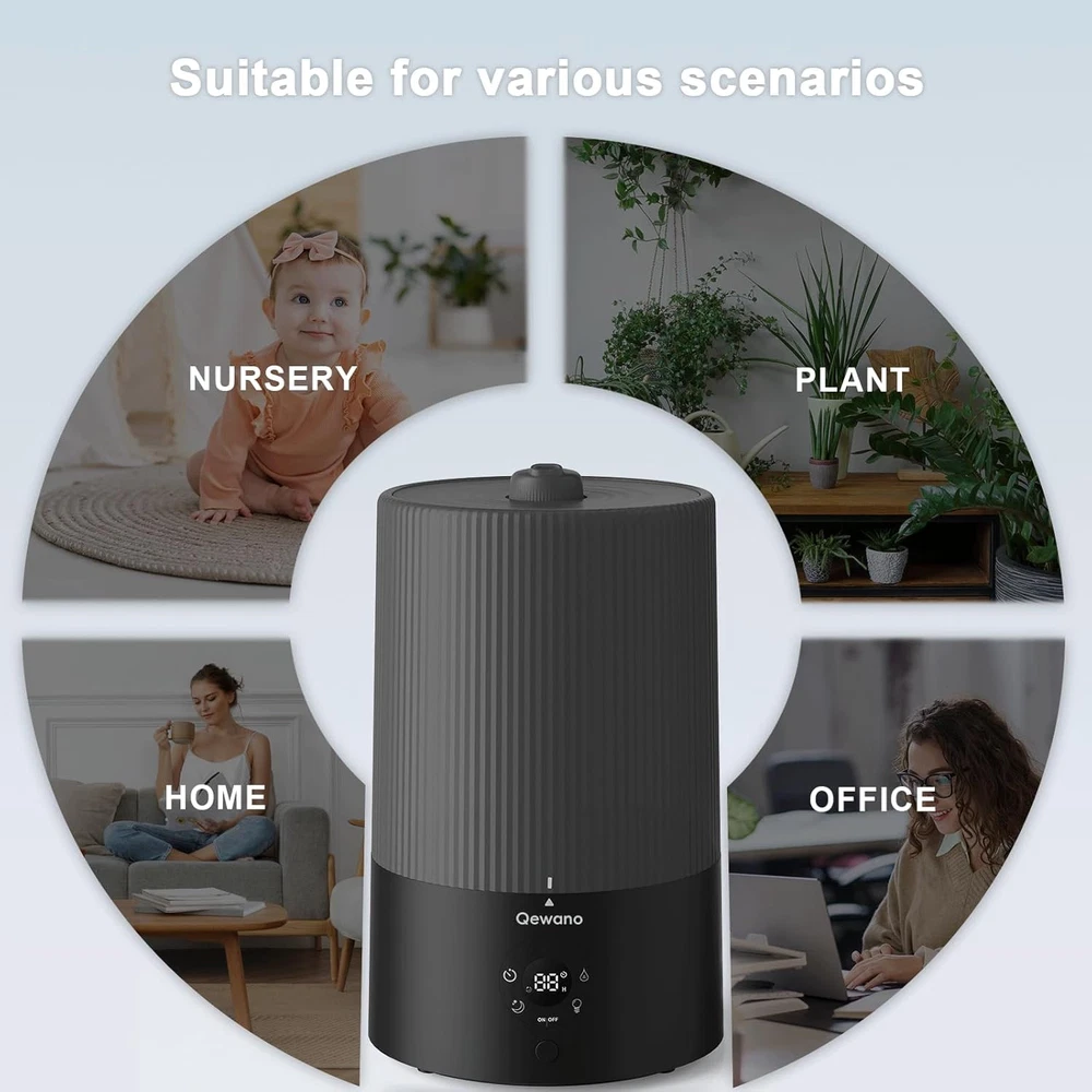 Humidifiers for Bedroom, 4L Top Fill Cool Mist with Oil Black Product Details Brand: Qewano Color: Black Recommended Uses For Product: Home Material: Polypropylene (PP) Special Feature: Night Light, Digital Display, Timer, Auto Shut Off, Aroma Diffuser Power Source: ac Capacity: 4 Liters Floor Area: 415 Square Feet Model Name: TOP FILL HUMIDIFIER Coverage: 415 square feet Runtime: 50 hours Wattage: 18 watts Shape: Round Auto Shutoff: Yes Number of Items: 1 Manufacturer: Qewano Item Weight: 2.2 Pounds Product Dimensions: 7.71 x 8.03 x 12.51 inches Item Weight: 2.2 pounds Country of Origin: China Item model number: TR-4001 【Powerful and Efficient Humidification】 The cool mist humidifiers for bedroom creates a mist at most 250ml/h to humidify quickly and ease dryness and discomfort. With a 4L capacity, the humidifier functions up to 50 hours on a setting for low mist, covering a zone of 415 square feet to give you the ideal humidity level suitable for you. 【Easy Top-Fill Design】 The humidifiers for bedroom home with a top-fill feature has a convenient design. It has a big opening that makes it easy to refill and clean without taking off the water tank. You can say goodbye to leaks that cause trouble. 【Peaceful Sleep】 When in sleep mode, the cool mist humidifier large room noise as low as 26dB and the display light is off. An night light provides a soft glow to create a soothing and quiet sleep environment. You can programme the humidifier for 2/4/6/8/12 hours to suit the varying humidity needs of your family, pets, and plants. 【2-IN-1 DIFFUSER&HUMIDIFIER】 Experience the benefits of both aromatherapy and humidification with a air humidifiers for bedroom. Simply add your preferred essential oils to create a soothing and relaxing atmosphere in your home. 【Use with confidence】The easy to clean humidifier features a 360° rotating nozzle, allowing for effortless adjustment of the mist direction to balance indoor humidity. It automatically shuts off when water reaches a low level, avoiding potential risks and damage. Rated as low as 18 watts, humidifier large room can run continuously, and the energy-efficient design keeps the monthly electric bill under $7.