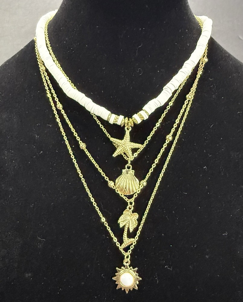 4-Layer Beach Ocean Charm Pendant BOHO Necklace Gold Tone Polymer Clay Beads 17”-19” Pre-owned. Excellent condition. Photos are part of the description. If you purchase more than one fashion jewelry from my shop please message me so I can adjust the shipping fee. Thanks
