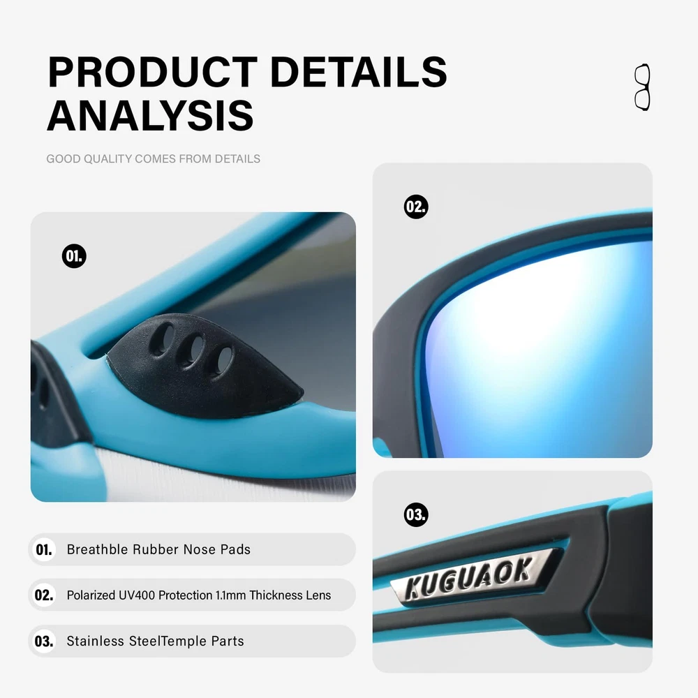 This men's polarized sunglasses are specially designed for outdoor activities such as sports, cycling, and fishing. They combine multiple excellent functions to provide all-round protection and high-quality visual experience for your eyes. Outstanding Ultraviolet Protection: Ultraviolet rays emitted by the sun can cause great harm to the eyes. Long-term exposure to ultraviolet rays may damage the eyes. Men's polarized sunglasses for sports, cycling, and fishing usually have good ultraviolet blocking ability. They can effectively block harmful ultraviolet rays such as UVA and UVB and protect the eyes from ultraviolet damage. Adapt to Various Environments: There are a variety of lens colors to choose from. Different colored lenses are suitable for different environments and lighting conditions. It maintains natural color perception and is suitable for cycling and fishing in various weather conditions. It can also provide clear vision, enabling men to find suitable lens colors in different sports and fishing scenarios to meet diverse usage needs. Lightweight Material: This kind of sunglasses is generally made of lightweight materials and is relatively light in weight. Wearing it for a long time will not cause excessive pressure on the nose bridge and ears, allowing men to maintain a comfortable wearing state during long outdoor activities such as sports, cycling, or fishing. Face-fitting Design: The design of the frame is usually ergonomic and can fit closely to the face. It is not easy to shake or slip during exercise, ensuring that the glasses always stay in the correct position and providing stable protection for the eyes. Moreover, good wrapping can also effectively block side light and wind-blown sand, providing more comprehensive protection.