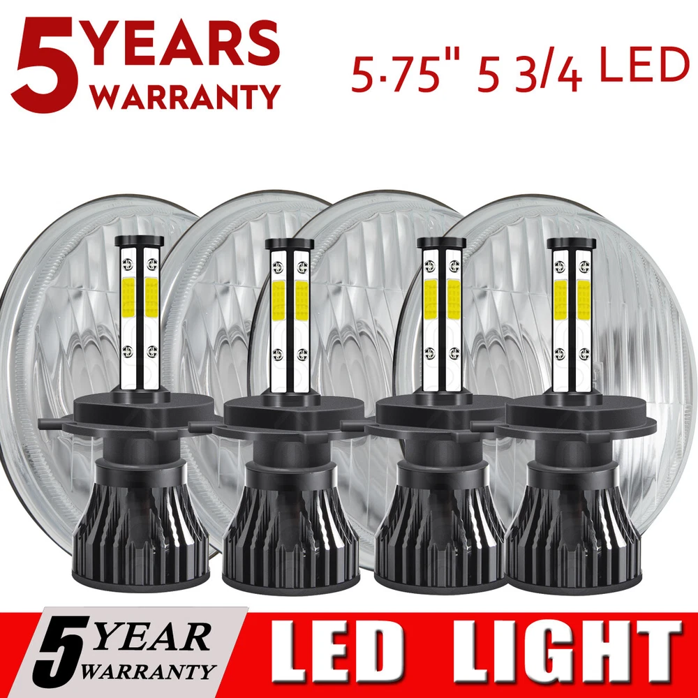 5-3/4"5.75 Round Stock Style H4 Conversion Headlights with Super Bright White LED Light Bulbs. Keep the Classic Look with Modern Light Brightness! Plug And Play! This listing is for a new set of 5 3/4" stock style glass lens - metal back headlight bulbs. This set includes (4) low/high beam headlights with high intensity LED light bulbs (no wiring or bucket modification needed). These have the original shaped prongs on the back so they will plug right into your original wiring harness plugs. These will fit any car or truck that has 4 round glass headlights. Will fit into stock buckets. Each bulb is 5 3/4 inches in diameter. These are glass and we will take extra care in packaging. Product Features: Dimension: 5.75 inch Housing Color:Black LED Type: White Material: Aluminum Housing, PMMA Lens Voltage: 10V-30V DC Color Temperature: 6000K Working Temperature: -40°C- 85°C Waterproof Protection: IP67 Interchange: H5009 / H5006 / H5506 / H5001 / 4001 Specification: 100% Brand New in the box with manufacturer packaging, never been installed before. LED LIGHT BULB Specifications and Features: Product Name: LED Headlight Bulbs Luminous flux: 10000LM Working voltage: DC9-32V IP rate: IP67 Wattage:55W Connector: H4 / 9003 (Low Beam and High Beam) Life Span: Above 50,000 Hours Color temperature: pure white 6000K Materia:Aviation aluminum profile Package Included: 4pcs 5.75" 5-3/4" headlight Housing 4pcs H4/9003 High & Low Beam LED Bulbs Note: 1. Please check the size of your bulbs on your vehicle before purchasing. 2. Please make sure the headlight housing has enough space for installation before purchasing.