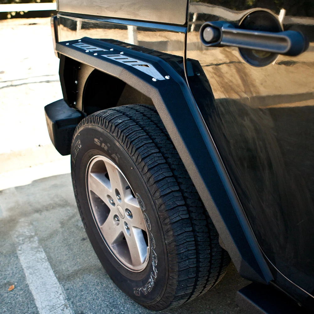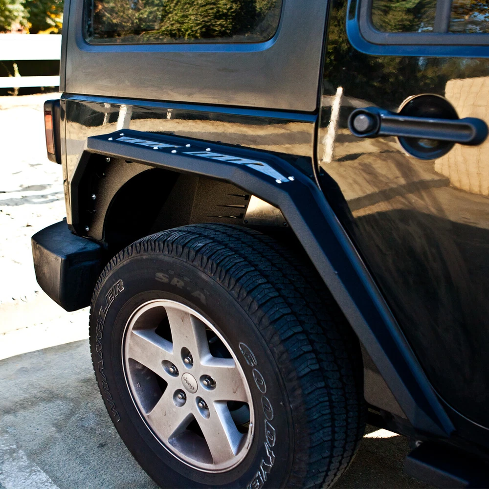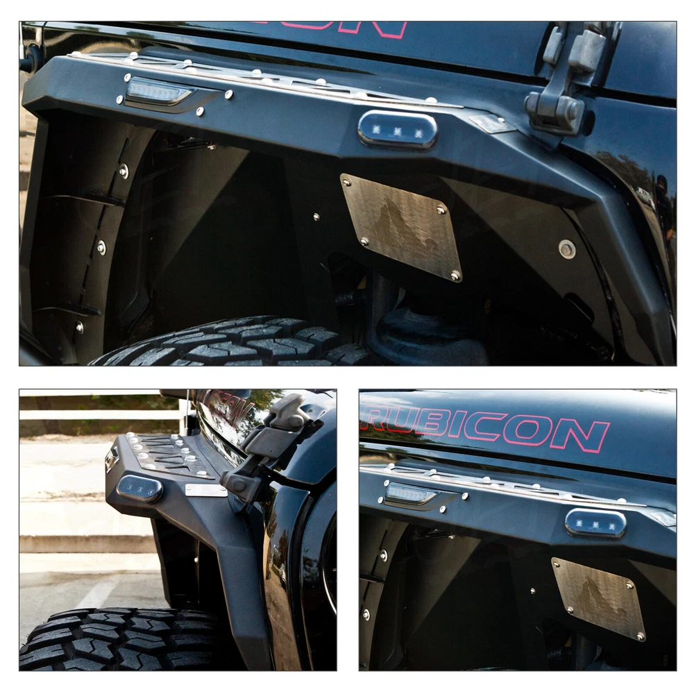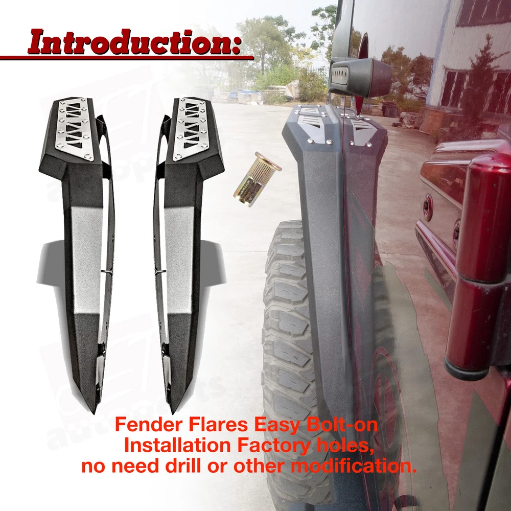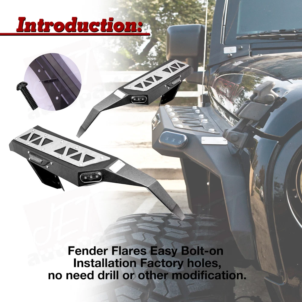Features Functional design - Equipped with LED turn signal lights & LED side marker lights . 1 pair of Front and Rear - a full set of fender flares for your Jeep Wrangler JK. Heavy duty build - Heavy Duty Rock Solid Design and Welded Strong Steel Build, Anti Rust Powder Coated. Easy installation - OE fitment direct bolt-on installation. 1 year manufacturer warranty. 60-Day return policy. Fitment For 2007-2018 Jeep Wrangler JK / JKU Package Includes 1* pair of Front Fender Flares 1* pair of Rear Fender Flares On Aug 4, 2024 at 19:42:23 PDT, seller added the following information: On Aug 5, 2024 at 21:41:43 PDT, seller added the following information: