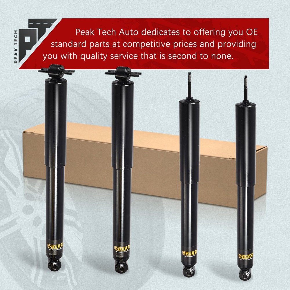 Please kindly know that Peak Tech is a certified distributor of Oredy products. Item in this listing is from brand Oredy. Store Home New Arrival View Feedback Contact us Add to Favourites 4PC Front & Rear Shock Absorbers for 2007-2017 Jeep Wrangler & 2018 Wrangler JK Items Description Package Includes: 1x Front Driver Side Complete Shock Absorber + 1x Front Passenger Side Complete Shock Absorber 1x Rear Driver Side Complete Shock Absorber + 1x Rear Passenger Side Complete Shock Absorber Compatibility: For 2007 - 2009 Jeep Wrangler (Sahara, Unlimited Sahara, Unlimited X, X) For 2010 Jeep Wrangler (Sahara, Sport, Unlimited Sahara, Unlimited Sport, Unlimited X, X) For 2011 - 2017 Jeep Wrangler (Sahara, Sport, Unlimited Sahara, Unlimited Sport) For 2018 Jeep Wrangler JK (Sport) Shipping Payment Return Warranty About us Shipping All orders in the continental 48 States will be shipped free of charge. Orders placed before 12pm (Eastern Standard) will be shipped the same business day of purchase. We only ship to the address provided to us at the time of checkout. Please verify the shipping address before making any payment. We do not ship to Hawaii, Alaska, Puerto Rico, APO/FPO/PO Boxes. Payment Paypal, Visa, and MasterCard are accepted forms of payment. Please use eBay checkout system when place your order. Immediate payment is required for all orders. Return Buyer has 30 days to return the items after receiving packages. Please note we only accept return for brand new products. When the return mistake is made on seller, we will provide a free return. Or, customer will be charged for return shipping fee. We will issue a refund to buyer after receiving and checking return packages. Warranty Peak Tech provides a Lifetime Warranty for original purchasers. If an auto part is defective, Peak Tech will provide ONE-Time replacement. Buyer needs to pay for the shipping cost of replacements occurred in warranty process. Buyer needs to provide Pictures or Video of damaged goods. About us Peak Tech focuses on auto parts and provides struts and shock absorbers suitable for a wide range of applications. Peak Tech products deliver the look, feel, fit and performance of OE. We provide buyers with professional customer service, and hope to offer buyers a better shopping experience. You May Also Like for Honda Accord 2008 - 2012 2.4L 2x Struts + 2x Sway Bars Front Right Left Side for Honda CR-V 2002 2003 2004 2005 2006 2PCs Struts Coil Spring Front Right Left for Honda CR-V CRV 2007 2008 2009- 2014 2PCs Struts Coil Spring Front Right Left for Honda Accord 2008 - 2012 2.4L 2PCs Struts Coil Spring Front Right Left Side for 2006 - 2011 Honda Civic 1.8L Sedan & Acura CSX 2PCs Struts Front Right Left Copyright © 2024, peak-tech-autoparts All Rights Reserved