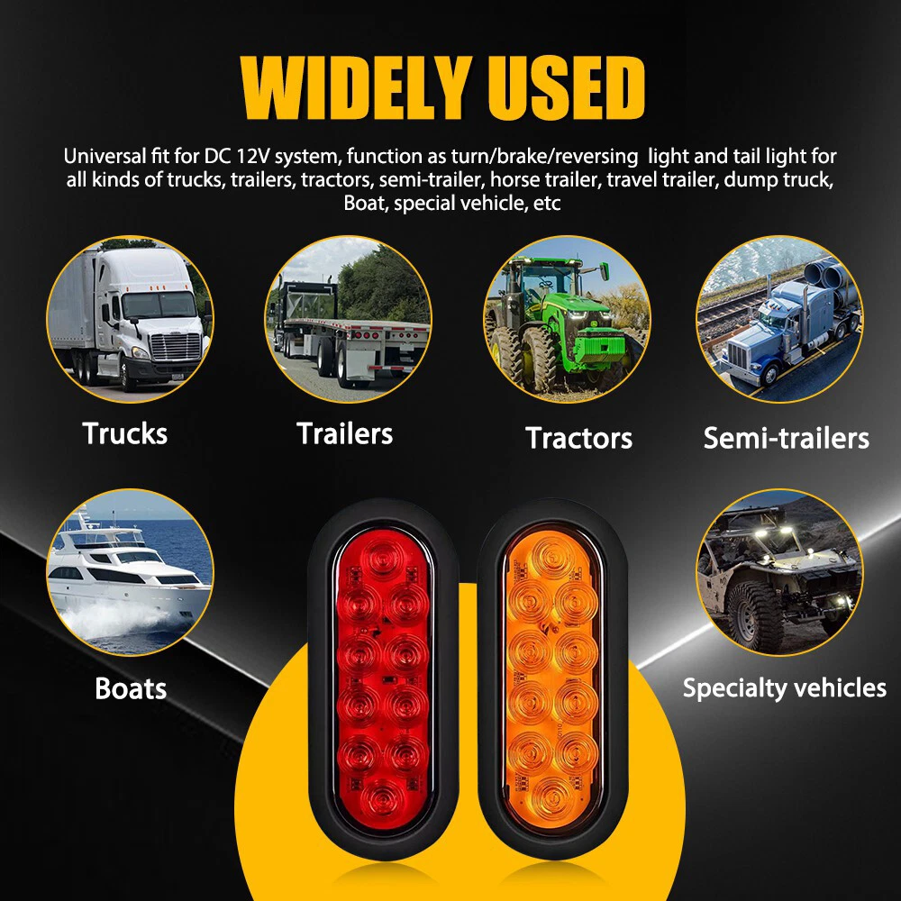 Specification Light color: Amber / Red Shell diameter:6 inches Material:ABS+PC+Rubber+Metal LED quantity:12LED Voltage:12v Waterproof grade:IP67 Service life:50000h+ Features: *Upgraded LED: Each lamp consists of 3030 SMD LED chips with wider lighting angle and better heat dissipation. It is 3 times brighter than other products. *Waterproof: The tail light is highly silicon sealed with an IP67 waterproof rating, which works even under extreme conditions such as rain and snow. *Easy to install: Easy installation with direct replacement, other modifications are not required. *Unique design 4PCS 10LED Amber Red Oval 6Inch Tail Lights w/ Mounting Bracket Trailer Truck Specification Light color: Amber / Red Shell diameter:6 inches Material:ABS+PC+Rubber+Metal LED quantity:12LED Voltage:12v Waterproof grade:IP67 Service life:50000h+ Features: *Upgraded LED: Each lamp consists of 3030 SMD LED chips with wider lighting angle and better heat dissipation. It is 3 times brighter than other products. *Waterproof: The tail light is highly silicon sealed with an IP67 waterproof rating, which works even under extreme conditions such as rain and snow. *Easy to install: Easy installation with direct replacement, other modifications are not required. *Unique design The groove inside the ring has been upgarded, adding three bumps to make the connection between the ring and the taillight tightly.These help the tailights not to fall out and can be firmly fixed the seal ring installed on the mounting bracket.You don't need to worry about the loose lights or wires anymore! *Connection White wire connects to negative. Red wire connects to red / amber light with high brightness Black wire connects to red / amber light with low brightness *Functions It can be used as running lights, brake lights, taillights and so on???/span> *Wide application: Universal Fits All vehicles with 12V Power Supply such as car, truck, trailer, Semi Trailer, Semi Trucks, boat, flatbed, bus, lorry, van, caravan, camper, RV Jeep etc. Note: Please check the detail information carefully before purchasing. Your satisfaction is our utmost concern, please feel free to contact us for any questions and concerns. Package Include: 6Inch Tail Lights w/ Mounting Bracket*4 Item Specifics Brand AUXITO Performance Part Yes Brand AUXITO Lens Color Amber / Red Light Color Amber / Red Manufacturer Part Number Does Not Apply Material ABS PC Placement on Vehicle Rear Diameter 6 inches Voltage 12 V Warranty 1 Year Waterproof IP67 Package Include tail light*4 Lighting Technology LED Housing Color Black Type Tail Light Assembly Items Included Bulbs Features Sealed Assembly Vintage Car Part No Mounting Style Screws Performance Part Yes Universal Fitment Yes Manufacturer Warranty 1 Year Finish Smooth Functions running lights, brake lights, taillights and so on Model Fits All vehicles with 12V Power Supply Payment We can accept payment by credit, debit, and gift cards; Apple Pay, Google Pay, PayPal, and PayPal Credit. Shipping 1. All items will be shipped in 24 hours after receiving your payment . 2. We ship this item to US only via USPS first class mail. It usually takes 3-5 working days to deliver. Returns 1. We offer 60 days return policy. 2. Please contact us within 60 days from the date you receive your package if you have any questions with the products . 3. Refund will be sent after we got your returned package. 4. All returned items should be in the original packaging with tracking number. Contact Us We work from Monday - Saturday 9:00AM - 6:00PM PST, but we will reply you once we get your message .There will be some delay on response if you send message or E-Mail on Sunday. DESCRIPTION PAYMENT SHIPPING RETURN POLICY CONTACT US Hot item Help & Info Payment Policy Shipping Policy Return Policy FAQ About Us 4PCS 10LED Amber Red Oval 6Inch Tail Lights w/ Mounting Bracket Trailer Truck Specification Light color: Amber / Red Shell diameter:6 inches Material:ABS+PC+Rubber+Metal LED quantity:12LED Voltage:12v Waterproof grade:IP67 Service life:50000h+ Features: *Upgraded LED: Each lamp consists of 3030 SMD LED chips with wider lighting angle and better heat dissipation. It is 3 times brighter than other products. *Waterproof: The tail light is highly silicon sealed with an IP67 waterproof rating, which works even under extreme conditions such as rain and snow. *Easy to install: Easy installation with direct replacement, other modifications are not required. *Unique design The groove inside the ring has been upgarded, adding three bumps to make the connection between the ring and the taillight tightly.These help the tailights not to fall out and can be firmly fixed the seal ring installed on the mounting bracket.You don't need to worry about the loose lights or wires anymore! *Connection White wire connects to negative. Red wire connects to red / amber light with high brightness Black wire connects to red / amber light with low brightness *Functions It can be used as running lights, brake lights, taillights and so on???/span> *Wide application: Universal Fits All vehicles with 12V Power Supply such as car, truck, trailer, Semi Trailer, Semi Trucks, boat, flatbed, bus, lorry, van, caravan, camper, RV Jeep etc. Note: Please check the detail information carefully before purchasing. Your satisfaction is our utmost concern, please feel free to contact us for any questions and concerns. Package Include: 6Inch Tail Lights w/ Mounting Bracket*4 Payment Shipping Returns Contact Us We can accept payment by credit, debit, and gift cards; Apple Pay, Google Pay, PayPal, and PayPal Credit. 1. All items will be shipped in 24 hours after receiving your payment . 2. We ship this item to US only via USPS first class mail. It usually takes 3-5 working days to deliver. 1. We offer 60 days return policy. 2. Please contact us within 60 days from the date you receive your package if you have any questions with the products . 3. Refund will be sent after we got your returned package. 4