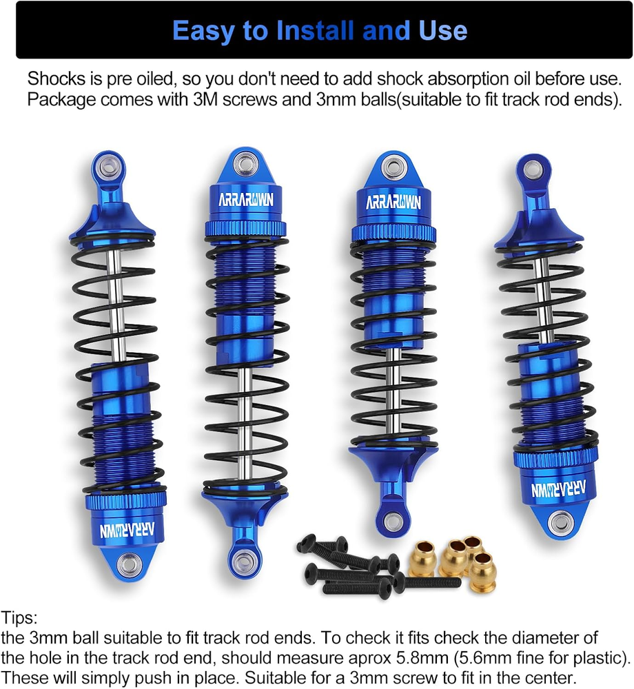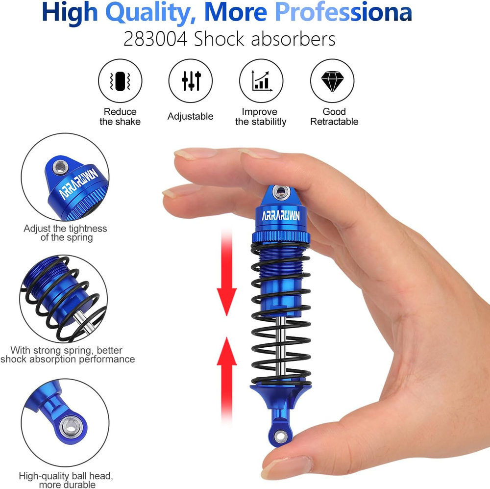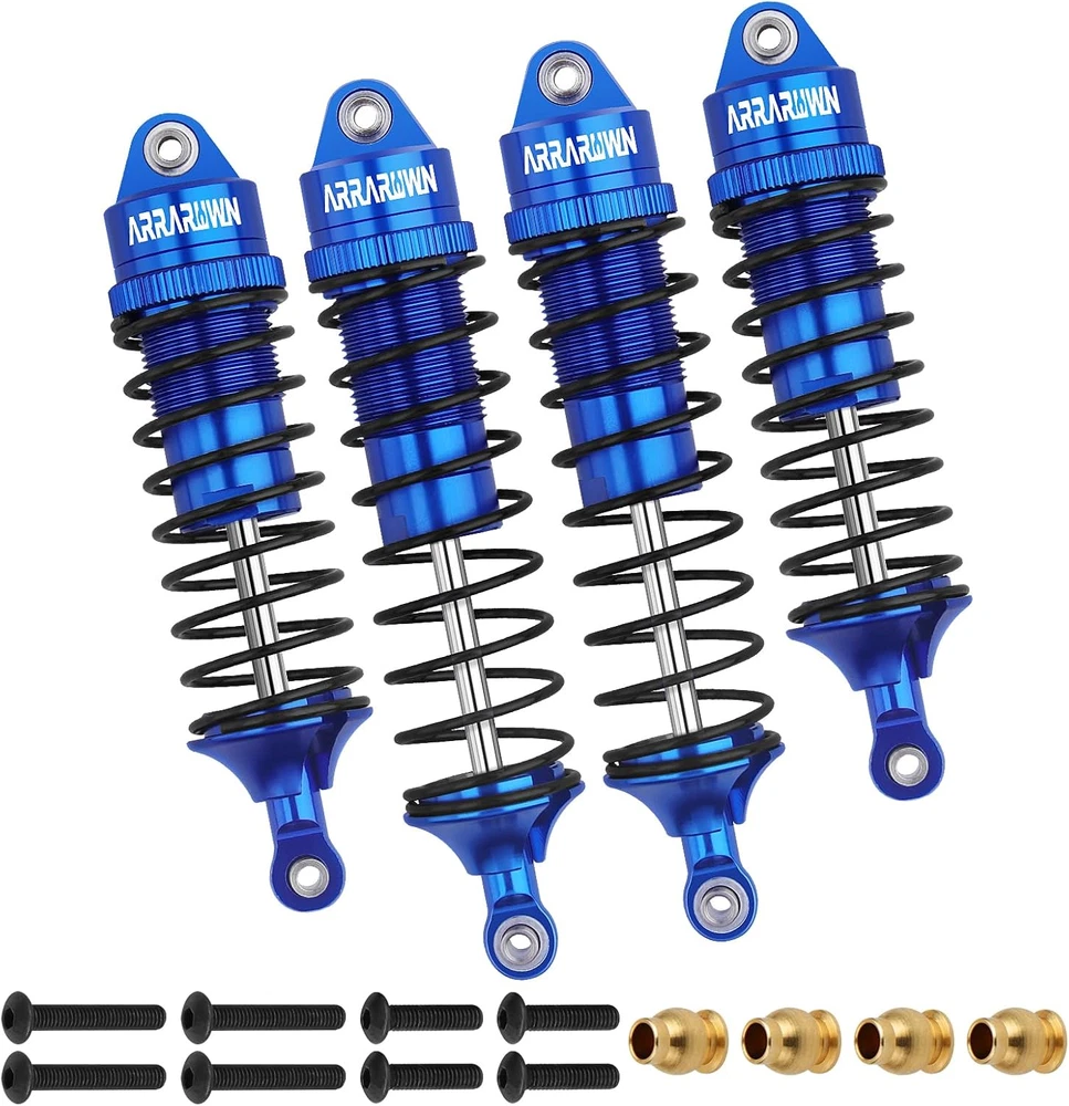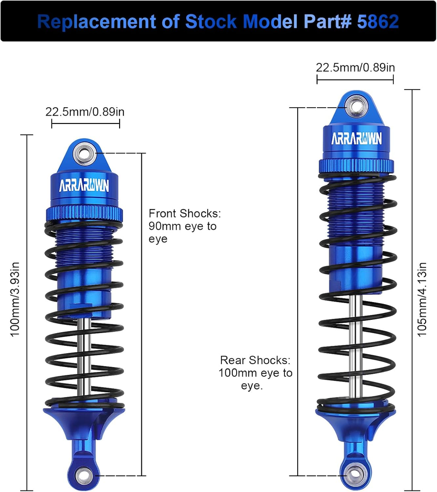Store New Arrivals Add to Favorite View Feedback Contact Fast deliveries to the customer's home Quality customer service John Make the customers happy! 4PCS 1:10 Scale RC Car Shock Front & Rear Shock Absorber Assembled Set Compatible with 1/10 Traxxas Slash/Rustler/Stampede 4X4 4WD Upgrade Replacement Parts#5862(Blue) Description Compatible with:1/10 Scale Traxxas Slash 4x4 / Stampede VXL 4x4 / Rustler VXL 4X4 VXL / Hoss 4X4 VXL / Rally 4X4 ,etc Replacement of stock parts# 5862. it also fits for ARRMA ARA4305V3T1 VORTEKS 1/10 Monster truck 3S. (Notice: These shocks is not compatible with Slash 2WD, Stampede VXL 2WD, Rustler VXL 2WD, Ford F-150 Raptor, Bandit) Shock Size: 2x Alloy front shock absorber (Total length:approx 100mm, eye to eye approx 90mm), 2x alloy rear shock absorber (Total length:approx mm 115mm,eye to eye approx 100mm), w/screws High Quality: Made of lightweight alloy material, CNC machined for precision, full metal, which is durable and improves the performance of your rc cars Professional: Replacement of stock parts# 5862, equipped with high-quality springs, professional shock absorption performance, heavy duty good for big jumps Tips: There is a small amount of lubricating oil inside the shock absorber, and they can be used directly. Also, please note that the spring diameter of the 4x4 diagonal shock absorber is 22mm when installed. You need to use long screws and washers to assist in installation (hole spacing is 3mm) 4PCS RC Car Shocks 1:10 Scale Front & Rear Shock Absorber Assembled Set Compatible with 1/10 Traxxas Slash /Rustler/Stampede 4x4 4WD Upgrade Replacement Parts (Blue) Features: CNC machined for precision. Heavy duty good for big jumps. Replacement of stock parts# 5862. Compatible with 1/10 Scale Traxxas Slash 4x4 / Stampede VXL 4x4 / Rustler VXL 4X4 VXL / Hoss 4X4 VXL / Rally 4X4 , Platinum/Ultimate VXL 4x4 4WD etc. and also other compatible with 1/10 scale Arrma Redcat ZD Racing HSP LRP HPI Hongnor Model Note: Check your specific model's manual for compatibility, If you have any question, pls contact us. Specification: Item: 4Pcs Alloy Front & Rear Shock Absorber for 1/10 RC Car Item Type: RC Accessory Color: Red, Blue Dimension: Front Shock Absorber: Total Length : 100 mm Hole center to hole center : 90 mm Diameter: 22 mm Rear Shock Absorber: Total Length : 115 mm Hole center to hole center : 105 mm Diameter: 22 mm Package Include: 2x Alloy Front Shock Absorber 2x Alloy Rear Shock Absorber Style Heavy Duty Color Blue Set Name 4-Piece Front & Rear Shock Absorber Set Material Type Metal Manufacturer Part Number A-SK-04 Model Number SK-04B Vehicle Service Type Car Compatible with Vehicle Type Car Manufacturer Warranty Description Manufacturer warranty for 90 days from date of purchase. Extended Length 115 Millimeters Auto Part Position Front Automotive Fit Type Vehicle Specific Fit Item Type Name NO Exterior Finish Polished Style Name Heavy Duty Included Components NO ABOUT US We offer the best prices around on high quality products. Our E-store includes media such as books, movies, music and games while offering electronics, toys, sporting apparel, clothing, tools, general home, garden items and more. SHIPPING We are always working hard to ensure your package arrives as soon as possible. Please understand that some factors like weather, high postal traffic, and the performance of shipping companies are outside of our control. We offer free shipping to the lower 48 states and ship within 2 business days of payment, usually sooner. We do not accept P.O. Boxes. Please provide a physical address. For shipping outside of the continental USA, we only use eBay's Global Shipping Program. The item is shipped to KY and then sent to the rest of the world. International customers are responsible for all duties and taxes. Continue to 'check out' to calculate costs for shipping the item to your country. Messages regarding eBay's Global Shipping Program MUST be directed at eBay EXCLUSIVELY. RETURNS We offer a 30-Day Return Policy on items in which you are not completely satisfied with. You have the option of a full-refund or an exchange of the item. No returns are available on items shipped outside of the USA PAYMENT We accept PayPal. CONTACT US This page content is yet to come Please ad us to your favorite seller and visit again later Thank You CUSTOMER SATISFACTION We try our very best to make sure every customer is completely satisfied. If there's a problem, message us! We're happy to help. WE ACCEPT