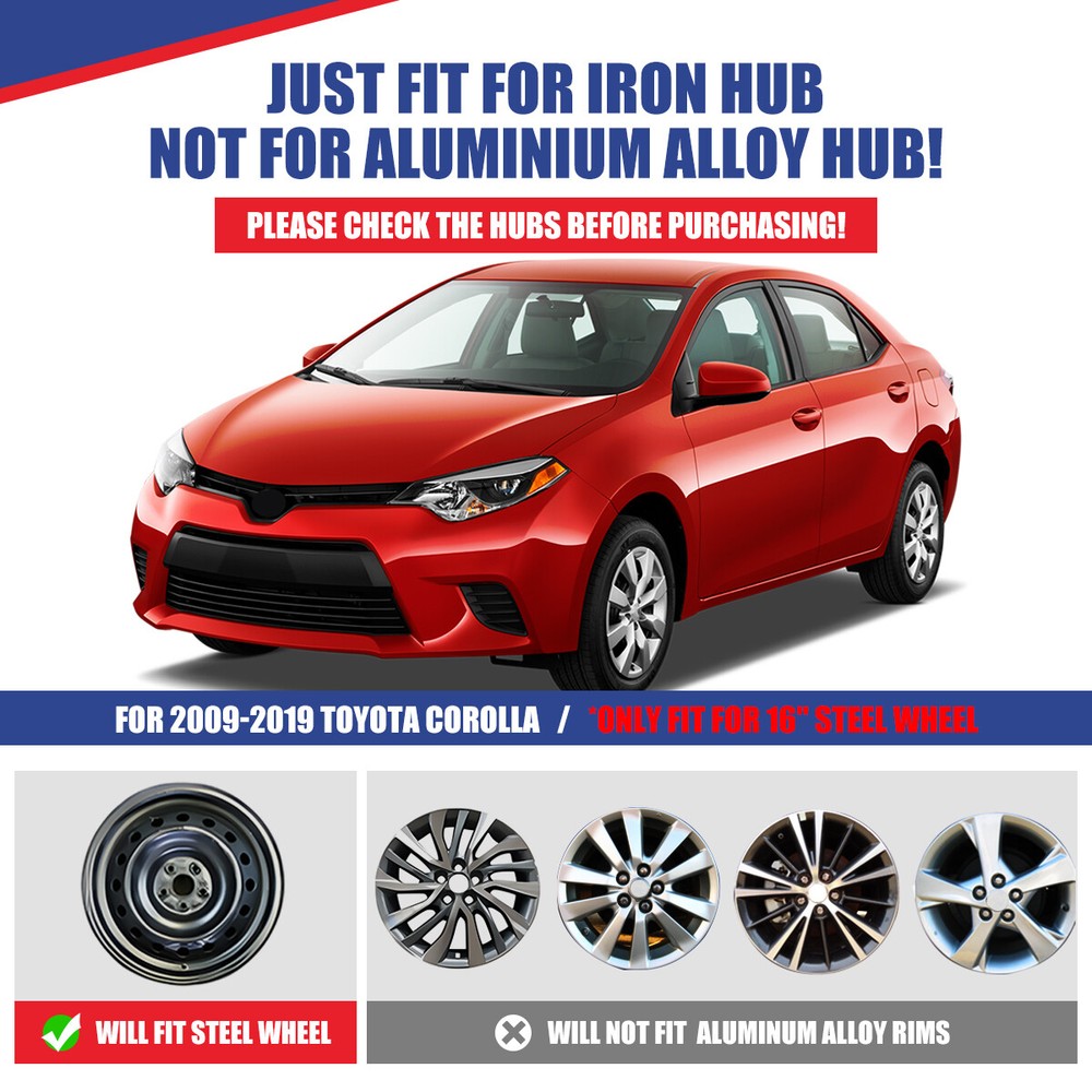 Title Other Head Lights For Jeep For Ford For Dodge For Chevy/GMC For Honda For Toyota For Nissan For Subaru For Mazda For Acura For Mitsubishi For Audi For MINI Tail Lights For Jeep For Dodge For Chevy/GMC For Toyota For Nissan For Honda For Volkswagen For Mazda For Subaru For Isuzu For Mitsubishi For Cadillac For MINI Fog Lights For Jeep For Ford For Honda For Dodge For Toyota For Chevy/GMC For Nissan For Mazda For Subaru For Infiniti For Cadillac For Scion For Lincoln For Acura For BMW For Hyundai For Volkswagen For Buick For Chrysler For Lexus For Mercedes Benz For Kia For Audi For MINI Turn Signal Lights For Jeep For Ford For Dodge For Chevy/GMC For Toyota For BMW For Subaru For Nissan For Cadillac For Lincoln 16" Set of 4 Chrome Wheel Covers Snap On Hubcaps For 2014-2016 Toyota Corolla Specification: Type: Wheel Hub Caps Color: Chrome. Compatible Wheel Diameter: 16 inch Features:Car Wash Safe, Easy to Install, No Tools Required Material: ABS Number in Pack: 4 Wheel Type: Steel Placement on Vehicle: Front, Left, Rear, Right Steel Wheel: 42611-02A00 Wheel Cover: 42602-02430 Features: ✅Fit For 2014-2016 TOYOTA COROLLA / 2009-2013 TOYOTA COROLLA / 2009-2014 TOYOTA MATRIX / 2017-2019 TOYOTA COROLLA - Design for 16" wheel hubs. Please know that and check your wheel before purchase to ensure fitment. ✅ Protect Your Wheels - Keep your vehicle looking sleek and new with these universal-fit hubcaps that offer reliable protection against scratches, dings, and other types of damage. ✅ Easy to Install - Designed to fit most standard wheel size, these hubcaps can be quickly and easily snap on your wheels without the need for special tools, making them a great choice for busy vehicle owners. ✅ Durable - Made from high-quality ABS materials, these hubcaps are built to withstand the rigors of daily use, keep your vehicle looking great for years. ✅ Stylish - Upgrade the look of your car or truck with these sleek hubcaps to enhance the appearance of your vehicle. Package Includes : 4PCS Wheel Cover Hubcaps Payment Delivery details Terms of sales About us Contact us Payment 🤟 We accept PayPal (Recommended), credit card, VISA, Google Pay & Discover etc. 🤟 Please submit your payment within 7 days after your purchase. 🤟 If not, eBay will automatically open an Unpaid Item Dispute on our behalf if the item(s) are not paid within 7 days. Delivery details 🤟 Please double check your delivery address and contact information. 🤟 All items will be shipped within 1 business days after payment received. 🤟 Tracking numbers will be easily accessible ASAP they are created and processed. Terms of sales 🤟 Free 60 days Return, we will cover the return post fee. 🤟 If a defective product was received, please do not hesitate to message us via eBay message. 🤟 We will response in 24 hours in business to resolve the problem 🤟 We stand behind our products. Items can be returned for exchange or full refund within 60 days from the date you receive. About us 🤟 Winjet has a huge warehouse and office located in the United States. 🤟 All US domestic 48 states customers are able to benefit from the FREE SHIPPING services. 🤟 Our experienced, professional customer service representatives offers prompt and courteous service. 🤟 Best quality products, outstanding services and professional experience keep our customers. Contact us 🤟 Please feel free to contact us if you have any problems. 🤟 Emails will be replied within 24 hours in working days. 🤟 After hours emails will be replied on the next business day. Country/Region of Manufacture United States OE/OEM Part Number "Steel Wheel: 42611-02A00, Wheel Cover: 42602-02430" Type Hub Cap Features Easy to Install, Lightweight, No Tools Required, Unique design Manufacturer Part Number 5110 Placement on Vehicle Front, Left, Rear, Right Brand Winjet Manufacturer Warranty Yes Material ABS, Plastic Installation Type Snap-On Finish Glossy Fitment 2 For 2009-2013 TOYOTA COROLLA Fitment 1 For 2014-2016 TOYOTA COROLLA Fitment 3 For 2017-2019 TOYOTA COROLLA Fitment 4 For 2009-2014 TOYOTA MATRIX Color Chrome Number in Pack 4 Compatible Wheel Diameter 16 in