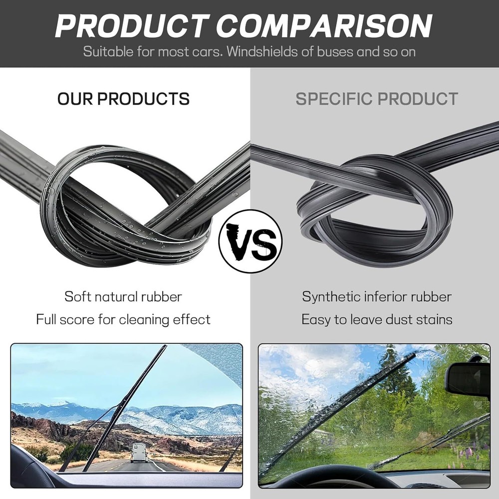 Free eBay listing template designed by dewiso.com 4PCS Car Windshield Wiper Blades Refills, 26" Adjustable Size of Universal Replacement Frameless Wiper Rubber Strips for Most Vehicle Front & Rear Windshield Wiper Blades FREE AND FAST SHIPPING! About this item 【Durable Material】: This product is made of natural high quality rubber. It has been finely treated with SPSN technology, so it is windproof and rainproof for use in various weather conditions. It can also withstand a temperature range of -40°C to +60°C and always maintain functionality. 【Practical Function】: The problem of blurred windshield can be solved with this wiper replacement rubber strip. It can effectively scrape away water and fog from the glass in rainy or snowy days without leaving water stains, making the windshield clearly visible and improving driving safety. 【Soft & Flexible】: It is soft and not too hard, so it fits well on the windshield surface when in use. It works quietly and efficiently without making noise or scratching the surface. In addition, it is also tough, which makes it very durable as it does not break easily. 【Quantity & Installation】: You will receive 4 rubber windshield wiper blades in sufficient quantity to meet your needs for use and replacement. You can easily replace the old wiper bar with it, both installation and removal are very convenient. 【Universal Fit】: This wiper strip is 6mm wide and 26 inches in length, it is cuttable and you can cut it to the right length as needed. Therefore, it is suitable for most vehicles, but it is still recommended that you check that our product matches the specification of your original wiper strip before purchasing. 【Note】: The product may be two strips together, you need to separate them manually. Please rest assured that manual separation will not affect the effectiveness of the product. Product We offer a 30-Day Return Policy on items which you are not completely satisfied with. You have the option for a full-refund or an exchange of the item. No returns are available on items shipped outside of the US . Shipping We offer Free Shipping to the US and ship within 2 business days of payment, usually sooner. We use UPS express shipping. That's why your products are usually delivered within 3 days . Contact We try our very best to make sure every customer is completely satisfied. If there's a problem , message us! We're happy to help. 24/7 live chat available.
