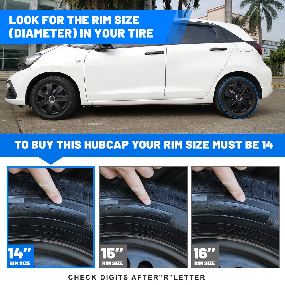 Head Lights Tail Lights Fog Lights Turn Signal Bumper Fender Flare Inner Fender Hubcaps Refrigerator Other Items for sale Head Lights Tail Lights Fog Lights Turn Signal Bumper Fender Flare Inner Fender Liners Portable Refrigerator 4PCS Black Matte 14'' Hubcaps For Toyota Nissan Chevy Wheel Covers Snap On R14 Features: Universal Fit - Design for 14" wheel hubs. Please know that and check your wheel before purchase to ensure fitment. Protect Your Wheels - Keep your vehicle looking sleek and new with these universal-fit hubcaps that offer reliable protection against scratches, dings, and other types of damage. Durable - Made from high-quality ABS materials, these hubcaps are built to withstand the rigors of daily use, keep your vehicle looking great for years. Stylish - Upgrade the look of your car or truck with these sleek hubcaps to enhance the appearance of your vehicle. Easy to Install - Designed to fit most standard wheel size, these hubcaps can be quickly and easily snap on your wheels without the need for special tools, making them a great choice for busy vehicle owners. Specification: Type: Wheel Hub Caps Color: Black Matte Compatible Wheel Diameter: 14 inch / R14 Features:Car Wash Safe, Easy to Install, No Tools Required Material: ABS Number in Pack: 4 Wheel Type: Steel Placement on Vehicle: Front, Left, Rear, Right Package Includes: 4* Wheel Cover Hubcaps Payment Shipping Return About us Contact us Payment Appreciated for the prompt payment, Contact us if bid by mistake, system open unpaid item automatically. Payment must be complete within 3 days from the date you purchase or after the end of auction. Items unpaid within 3 days of the auction end will be forfeited. We reserve the right of cancel the order and re-selling the items. Shipping All shipment will ship by UPS or USPS . All items will be ship within 1 working days , and we will ship out all orders as soon as possible after payment verified, please allow up to 1-4 business days for delivery. CANADA & International customers please note: your government might charge a duty tax (brokerage fees). We do not responsible for any custom duty or import tax. Why Choose the US Stock? 1. Us Local Shipping, No Extra Customs Cost to the US. 2. Fast Delivery: 1-4 Working days Delivery. 3. Best After-Sales Service!!! Return The buyer is responsible for all return shipping including a result of customer error or defective item. 1) If you received an incorrect, damaged, defective, or item not as described, contact us for full refund or replacement on our cost. 2) If you want to return the item, please contact us within 60 days after package received. Return products must also be in its original condition: including box, packaging and all other accessories. About us We are the best auto parts, we have been pursuing excellence, continuous exploration as the slogan, let customer satisfaction is our purpose! We adhere to the United States local delivery, one year warranty! Welcome! Contact us How Should You Contact us? Please Read The Item Description And See if The item Fits Your Vehicle Exactly. If You Found Any questions, Feel Free to email us by "Ask a question" Our Office Hours Are Monday - Friday 8:00am - 5:00pm PST / 11:00am - 8:000pm ET, We Do Not Answer Any E-Mails On Weekend, And We Will Reply All E-Mails In The Order It Was Receive. All E-Mail Take Us Around 24 Hours To Respond To Any E-Mail. We Are Close During The Weekends And We Do Not Answer Any E-Mails During That Time. Brand AUTOWIKI Type Hub Cap Features Easy to Install, Lightweight, No Tools Required, Unique design Compatible Wheel Diameter 14 in Number in Pack 4 Placement on Vehicle Front, Left, Rear, Right OE/OEM Part Number Does not apply Color Sliver & Black Manufacturer Part Number Does not apply Material ABS Plastic Manufacturer Warranty 1 Year Country/Region of Manufacture United States Finish Lacquer Performance Part Yes Universal Fitment Yes Installation Type Snap-On Model 14 in Universal Hubcap