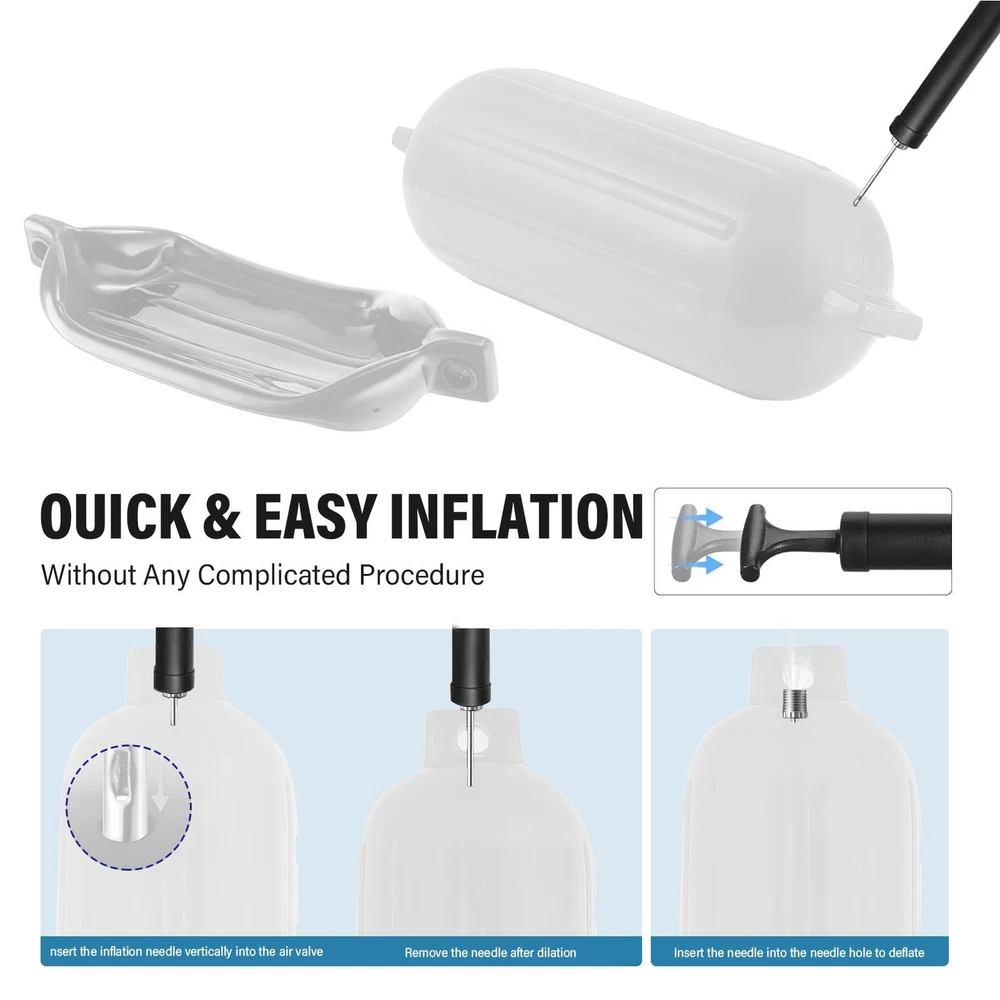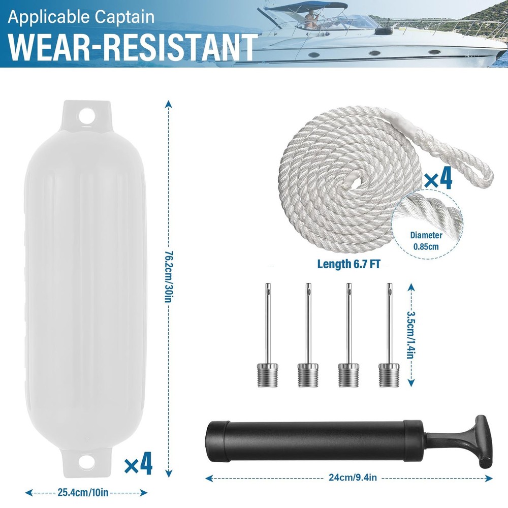4PCS Boat Fender10x30'' Marine Inflatable Buoys Vinyl Ribbed Dock Bumper White Bullet Points: Reduce Damage Risk: Guard your boat against unwanted scratches and dents with our boat bumper. Equipped with 4 fenders and lines, it provides added defense against impacts when tied to the dock or other boats, reducing the risk of damage Easy Docking: Say goodbye to the hassle of inflating boat bumpers. Our easy-to-inflate and deflate design makes it a breeze with any air pump and included inflation needles. Modernize your docking process and protect your boat with these 4 sturdy bumpers and ropes Vast Application: These boat bumpers are not only ideal for secure docking of yachts, speedboats, sailboats, and pontoons, but also serve as life-saving tools in various ship types and areas. With versatile applications, they ensure safe and stable boating experience Excellent Strength: Crafted with high-quality PVC material and a vertical rib design, these boat bumpers for docking provide excellent strength, good airtightness, and UV resistant for extended performance. Expect long-lasting defense against impacts and tears Center Hole Design: Our boat bumper features a seamless one-piece structure and adopts center hole design for horizontal or vertical hangings with a rope. This design avoids splitting and prolongs service life, providing improved protection against docking impacts Our boat bumpers fenders are the perfect protects against dings and scratches when tied to the dock and around other boats. With a tear-resistant and seamless one-piece structure, they provide maximum protection for boats such as yachts, speedboats, sailboats, docks, and pontoons. Inflating our fenders is made simple with air pumps. Ensure your boat stays protected with our top quality boat bumpers fenders. Specification: Product name: Boat Fenders Color: White Material: PVC Scope of application: Yacht fenders Function: Reduce and cushion the ship yacht docking Packing List: 4 x boat fenders 1 x pump 4 x ropes 4 x air needles We accept PayPal payment,PayPal Credit,Credit card or debit card and so on. Payment should be completed within 4 (Four) days of auction closing. Or unpaid dispute will be filed for closing auction. We will leave a positive feedback immediately after payment is received. We appreciate a positive feedback as much as you do. If for some reason there is any issue with the purchase, please contact us prior to leaving feedback, we will be glad to work together and provide a satisfying solution. 1.Delivery Time: Ship from US via FedEx or UPS 2-8 business days with tracking number 2.Ship within 1-2 business day once payment completed;Orders placed on weekend will be shipped within 3 days. 3.If you want to chose another address, please leave us a message on ebay.Please check your shipping address carefully before checkout, it can't be changed if order completed. Please be aware that PO Box cannot receive items,please DO NOT fill in the PO Box address Seriously promise: Refund or resend will be offered if item still not arrive in 7-10 business days. Just send us an email,we will give you a satisfied solution as soon as possible. · Welcome to our eBay store. As a leading and emerging company in manufacturer and exporting business, we are specialized in Business and Industrial Products, Sporting Goods, Pet Products, Home and Garden products for more than 10 years. We believe that it is our vision and mission to provide innovative products with best service and competitive price to satisfy you. Our goal is to make sure that you can find exactly what you are looking for and make it easy for you to place your orders. · Email Customer Support: · 9:00am-2:00am PST Sunday-Friday All emails will be responded to within 12-24 hours