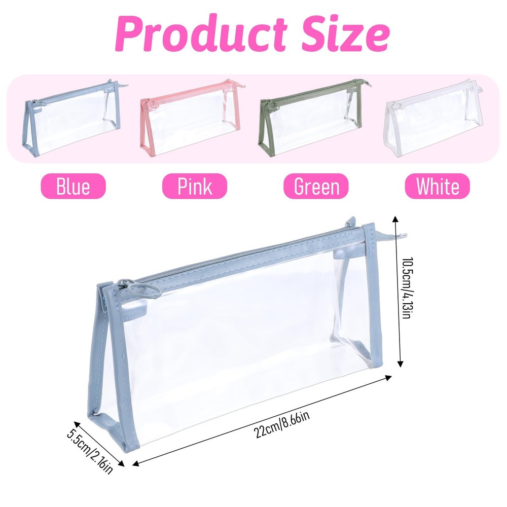 4PCS Clear Pencil Cases, Waterproof Pen Pouch with Zipper, Portable Travel Cosmetic Makeup Pouch, Stationery Toiletries Organizer, Multi-function Storage Organizer for Home Office Vacation Accessories 【Value Pack】You will get a sufficient number of marker bags for four (blue, white, pink, green), enough to meet your needs for different uses. The clear material organizer bags make it easy to see what's inside and help distinguish items. 【Premium Material】The pen cases for adults are made of high quality PVC materials, waterproof and easy to dry, the surface can be cleaned with just a light wipe. The smooth, sturdy zipper closure of the clear pouch secures contents in place, preventing spills or losses, while enabling hassle-free access. 【Easy to Carry】Our portable clear travel case each measuring about 22 x 5.5 x 10.5 cm (8.7 x 2.2 x 4.1 inches), enough to satisfy your daily use. Compact and lightweight, the clear cosmetic bag effortlessly fit into handbags, providing convenient organization without occupying excess space. 【Multifunctional Storage】Our small storage bag can not only hold pens, pencils, erasers and other stationery, but also can be used as a travel bag, toiletry bag, makeup bag, coin wallet, cable accessories bag. The makeup brush bag is suitable for office, home, travel use, to maximize your daily basic needs. 【Thoughtful Gifts】Our clear pouches with zipper is designed to be transparent, easy and quick to view and access the items you need, save you time. These waterproof zipper pouches make for a thoughtful and practical Christmas gift choice, enhancing convenience and efficiency in daily routines. Features: Do you often spend time searching for things? Do you worry about your belongings being too cluttered? Take a look at our exquisite zipper bags! This PVC organiser includes pink, green, blue and white, simple and practical styles to help you organize your stationery, cosmetics and small items, enough for your daily needs. Small size, large capacity, very lightweight and convenient, can be easily put into your clearbag, backpack or handbag, easy to carry. Ideal gifts for artists, writers, or anyone in need of organizational assistance. Specifications: Materials: Polyester + PU leather + PVC Colors: Blue, White, Green, Pink Dimensions: 22x5.5x10.5cm/8.66x2.16x4.13in Packaging contents: 1 x Blue Storage Bag 1 x White Storage Bag 1 x Green Storage Bag 1 x Pink Storage Bag Note: 1. Please check if it is the size you need before purchasing. 2. Please allow slight differences due to manual measurement. 3. Due to light and screen difference, the item color may be slightly different from the pictures. Please understand. Shipping We offer FREE shipping on all orders! We ship within Three business days of payment, usually sooner. We use a selection of shipping services such as UPS, FedEx, USPS etc. We only ship to the lower 48 states, no APO/FPO addresses or PO Boxes allowed. Local pickups and combined shipping options are not provided at this time. Return You can return a product for up to 30 days from the date you purchased it. Any product you return must be in the same condition you received it and in the original packaging. Please keep the receipt. Payment We accept payment by any of the following methods: PayPal Please pay as soon as possible after winning an auction, as that will allow us to post your item to you sooner! Feedback Customer satisfaction is very important to us. If you have any problem with your order, please contact us and we will do our best to make you satisfied. Contact Us If you have any queries, please contact us via ebay. We usually respond within 24 hours on weekdays. Please visit our eBay store to check out other items for sale! Thank you for shopping at our store.
