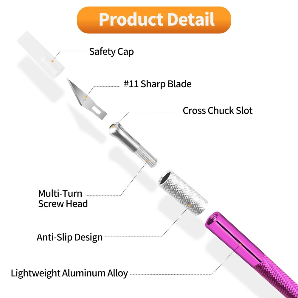 【1】Craft Knife with Extra Blades: Package including 4pcs art knife which is the standard #11 size and comes loaded with a new blade plus 40 more are supplied in four safe storage box. Bright colors (yellow, blue, purple, sliver) makes it easy to find and the tip of the stencil cutting knife is sharp. 【2】Premium Quality: The Aluminum alloy construction is lightweight and robust, ensuring durability even under the pressure of intricate cuts. The handle is ergonomically designed, providing a comfortable grip for extended use. The overall design lends itself well to precision, allowing for controlled and detailed work. 【3】Safely & Portable: 4 Hobby knives each with a safety cap of burin can avoid unnecessary cuts, craft knife cap to prevent scratches. The compact size of exacto knife 4 pack also makes it easy to store in our crafting toolbox or carry with us for on-the-go projects. 【4】Instant Blade Replacement: The blades are very easy to change. We rotate the collar around the blade to loosen the blade, pull the blade out of the handle, insert a new blade in the handle, and tighten the collar around the blade and we're done. 【5】Multi-Purpose Use: Craft knife kit perfect for cutting, carving and trimming, such as cutting thin wood, scrapbooking supplies, cardboard, wallpaper, plastic, cloth, leather and foam board craft, meet our different needs. Great set of exacto blades for hobbiests to proceed all kinds of hobby and craft work.