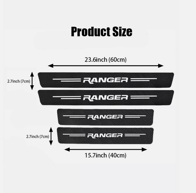 Fitment: For Ford Ranger Feature: 1. Material-Car Door Sill Threshold Stickers are made of carbon fiber leather, which is beautiful, non-slip, wear-resistant and waterproof. 2.Function-Car Door Sill Threshold Stic kers can not only cover car scratches, but also absorb impacts, protect door sill and any surface from scratches, scuffs and chips. 3. Install Easily-Self-adhesive, peel and stick. Easy installation and remove with no residual. Specifications: Material: Carbon fiber (NOT real carbon fiber ) Color: White&Black Size(approx.): L: 60cmx7cm=23.6"x2.7"; S: 40cmx7cm=15.7"x2.7" Installation Tips: 1. Ensure that the surface which the product is to be applied is clean, dry and free of all dust, grease and wax. 2. Determine exact location of product 3. Remove protective film from adhesive, align carefully and then press firmly to insure proper adhesion 4. Do not move the product or wash your car in 24 hours after installation Package: 4X Car Door Sill (2 For Front Door, 2 For Back Door)