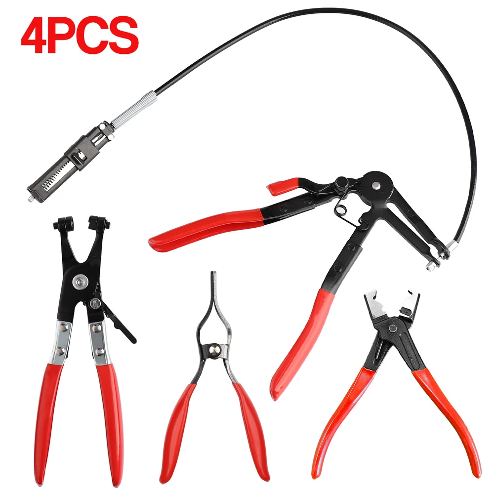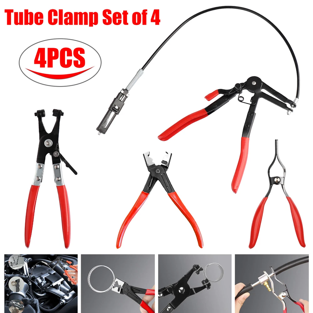 4PCS Hose Clamp Pliers Spring Clamp Pliers Self-Tightening Clamps Remover Tool Product Description Features: Made of high quality alloy steel and coated with black oxide to prevent rust. The ergonomic handles wrapped in non-slip rubber, are designed to prevent hand fatigue during prolonged use. 3 pliers set perfect for cars lower radiator, automobile maintenance, factories, production lines. HOSE PLIERS SET - Packing includes swivel flat band hose clamp pliers, long-reach cabled hose clamp pliers, vice grip, hose remover pliers. All 3 pliers have a locking function, when you open the self-tightening pipe clamp, the pliers can be locked to free your hands and speed up your repair work. Easy to Use - The long reach wire spring hose clamp pliers tip can be rotated allow access to tight spaces and can be used at any angle. The maximum opening is 2 inches, locking ratchet can keep flat-type or ring-type hose clamp open for easy installation and removal. Ideal for opening fuel, oil, water hose or coolant pipe spring clip. Design - Hose clamp pliers have swivel jaw, tip slot and multiple lock stops design for multiple angle access. The handle of plier wrapped in non-slip rubber, which can provide a comfortable grip and decrease hand fatigue during use. High Quality - This hose clamp plier is made up of premium alloy steel, heat-treated and coated with black oxide to prevent rust and corrosion. Sturdy and durable, long service life. GUARANTEE for YOU - We are committed to providing you with first-class quality assurance. If you have any quality problems or damage during transportation, please contact us in time, and we will solve the problem for you as soon as possible. Packing Includes: 1 Pcs Long reach spring wire clip plier 1 Pcs Hose removal plier 1 Pcs Flat band hose vlamp plier 1 Pcs Vice Grip