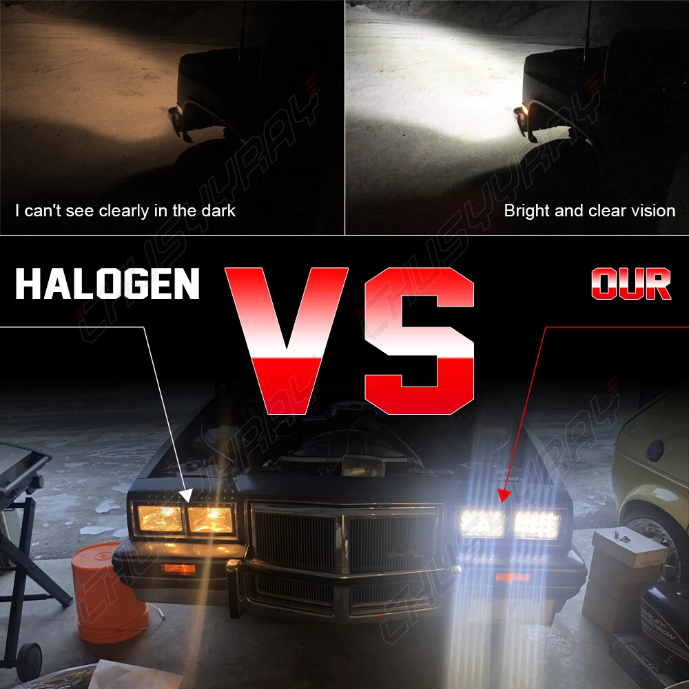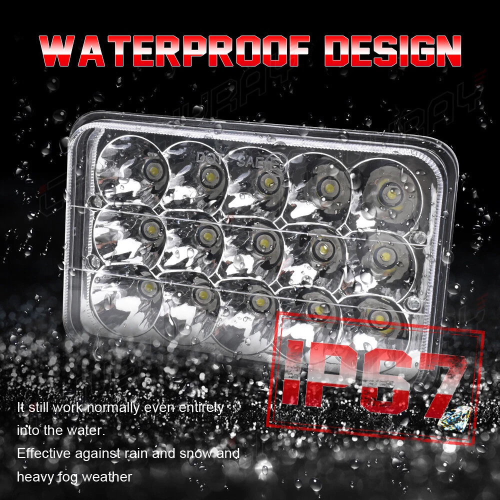 Specification: Beam Pattern: High Beam/Low Beam Plug: Factory H4 Plug With Hi/Lo Beam Function Color Temperature: 6000K~6500K LED Wattage: 45W/PC Light Color: White Working Voltage: 10-24V Operating Amperage: 3A To 12V Moisture Resistance Rate: IP67 Size(Single Work Light): 4"* 6"(170*108*79mm) Features: Average life span more than 50,000 hours of usage. Professional installation is high recommended Vehicle Fitment. Fit for most vehicle with sealed beam headlights(H6014 / H6052 / H6054 / 6054). Simple plug-and-play design. Each piece comes with 15-LED sealed beam light and toughen PMMA lens with H4 plug. Made by high quality black aluminum housing with PMMA lens. Package Includes: 4 × 4"* 6" LED Headlight Fitment: Most vehicles with 4X6 INCH Headlight (H4 Plug) Compatible with headlights: H4651 H4652 H4656 H4666 H4668 H6545