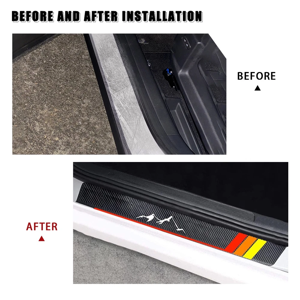 Feature Protective - Prevent scratches and scuffs, and waterproof, non-slip, anti-wear. Eye-catching look - 3D carbon fiber texture + logo image on it, provide the most dramatic effect, make your car look dazzling. Flexible design - you can also cut it to your customizable size to fit your cars. Easy to Install - just peel-n-stick. speical adhesive, no damage to your vehicle. Fitment Universal fit for most toyota vehicles, sush as Toyota Tacoma,Silverado,Camry,Sequoia,Tundra,4Runner, Rav4,Highlander etc. Specification Type: Car Door Threshold Sill Sticker Color: Carbon Fiber Size(approx.): L: 60cmx7cm=23.6"x2.7"; S: 40cmx7cm=15.7"x2.7" Material: 3D carbon fiber (NOT real carbon fiber ) Attachment Method: Self-adhesive Installation Method 1. Pls use alcohol or agent to clean the position of the installation (to make sure it without the grease.Wax or dust etc.) 2. Pls ensure the position of installation can be completely fit the case before install, (Note: if there any questions or misfit , please contact us) 3. Rive the strong double-sided adhesive of the back, if meet the case of a relatively low temperature, please heating it via the hair dryer or lighter 4. According to the comparison stick up it and press about 1-2 minutes (Note:do not wash your car in 24 hours , the adhesive should be fixed after 12 hours ) 5. The installation have been completed.(Easy to install) Package Included 4pcs Door Sill Protectors