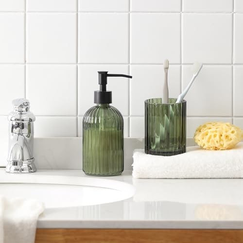 Just got this set and wow - it feels so luxurious! The glass has a beautiful weight to it and the olive green color with that pressed pattern is stunning. Everything arrived quickly and well-packaged. Makes my bathroom look like a fancy hotel!