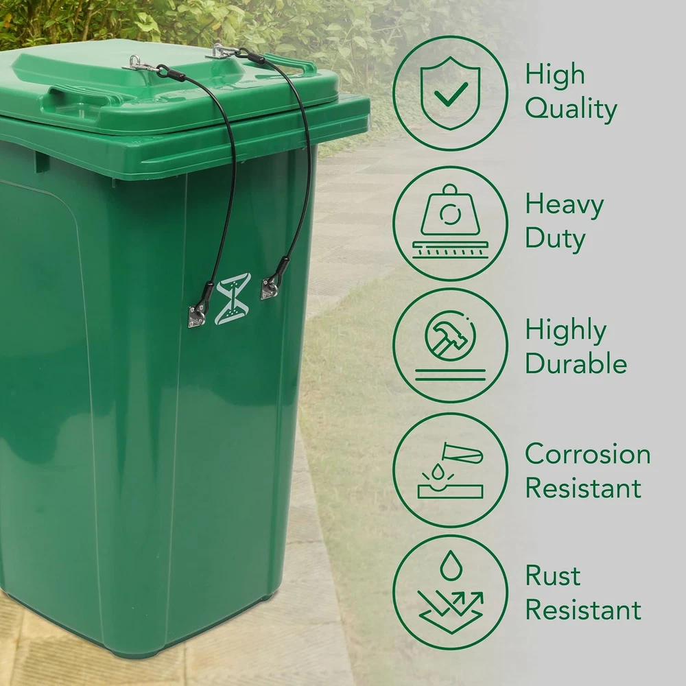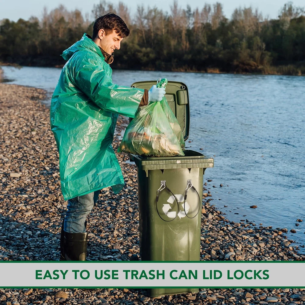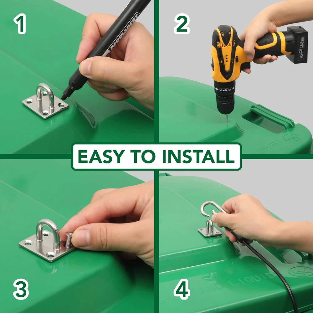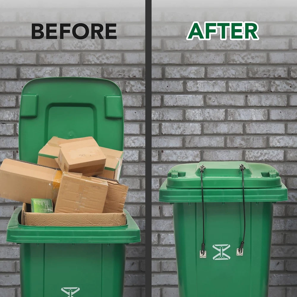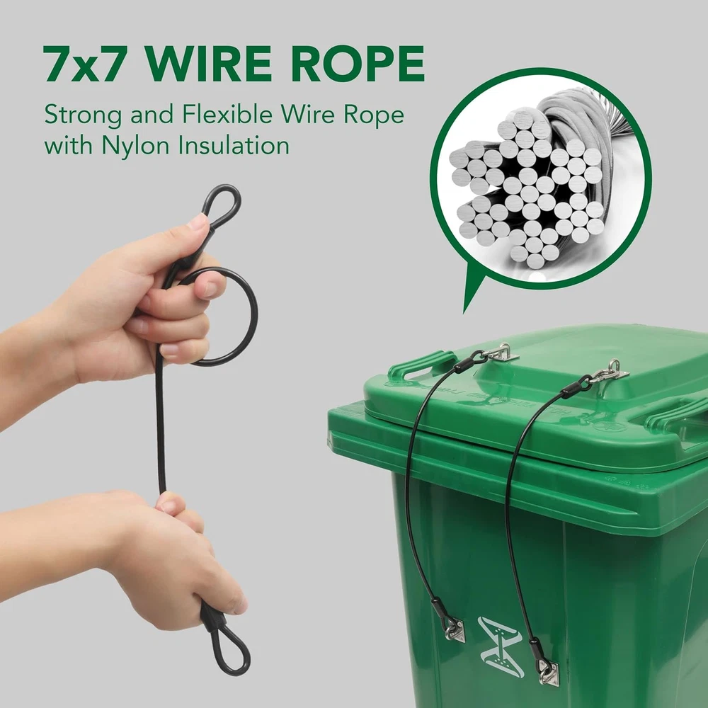 Store New Arrivals Add to Favorite View Feedback Contact (4-Pack, Black Garbage Trash Can Locks with Wire Ropes Stainless Steel Hasps Garbage Can Lid Lock for Squirrel Bear Proof Universal Trash Can Locks for Various Trash Bins Locks for Animals Description Item model number p4 Style Mountaineering Buckle-4pk Capacity 1.3 Pounds Color Black Special Feature Odor Seal Product Dimensions 6.3 x 5 x 2.72 inches; 1.3 Pounds Material Nylon, Stainless Steel Item Weight 1.3 Pounds Shape Rectangular Opening Mechanism Manual-Lift Recommended Uses For Product Transh Can Lid Finish Type Stainless Steel UNIVERSAL FIT TRASH CAN LID LOCK - Designed to fit a wide range of outdoor trash cans with standard hinged lids, including those with flat lids. The adjustable straps can extend up to 19 inches, providing versatility for various trash can sizes. INCLUDES COMPLETE KIT - Each 4-pack of trash can lid locks includes all necessary components for installation: 4 Wire Ropes, 8 Square Eye Plates, 4 Snap Carabiners, 40 Flange Nuts, 32 Long Screws, and 4 Self-tapping Screws, ensuring a hassle-free setup process. DURABLE TRASH CAN LOCKS - Crafted with durable materials built to withstand years of use, these lid locks feature stainless steel hasps, nylon-coated 7x7 wire ropes, and rust-resistant hardware. Their heavy-duty construction ensures resilience against rough handling and harsh outdoor conditions. EASY TO INSTALL WITHOUT A POWER DRILL - Designed for straightforward installation, these lid locks can be easily installed without the need for a power drill. Utilizing self-tapping screws, they create pilot holes and thread into plastic effortlessly, requiring only a screwdriver for installation. MOST EFFECTIVE WAY TO STOP TRASH RUMMAGERS - These trash can lid locks offer the most effective solution for deterring trash rummagers, ensuring your trash cans remain securely closed even in tumultuous conditions. Product Description Trash Can Lid Lock Features and Advantages Sleek and Pleasant to Look At Prevent messes and make your trash cans look presentable. Say goodbye to bulky straps or pavers. These polished black wire ropes with brushed finish hardware will provide a well-put-together look. Highly Secure Lock and Installation Snap carabiners are difficult even for the most dexterous critters. Even the notorious lock-opening raccoons will struggle - they don’t have opposable thumbs after all! And unlike other trash can lid locks, the Tongass trash can lid lock has stainless steel hasps with screws in each corner secured by flanged nuts. Shaking, tipping, or throwing around the trash can won’t budge these locks! Durable and Heavy-Duty Materials Wire Ropes- 7x7 strong and flexible wire rope with nylon insulation. Hasps - Strong and corrosion-resistant stainless steel. Hard to bend, deform, or break. Screws and flanges- Corrosion and rust resistant. These trash can lid locks can withstand all weather conditions and can withstand very rough handling. No-Drill Installation - Easy to Use Trash Can Lid Locks The snap carabiner makes it easy to attach and attach in a matter of seconds! Place the wire rope’s o-ring into the hasp. Insert the carabiner through the hasp hole. Lock in place. ABOUT US We offer the best prices around on high quality products. Our E-store includes media such as books, movies, music and games while offering electronics, toys, sporting apparel, clothing, tools, general home, garden items and more. SHIPPING We are always working hard to ensure your package arrives as soon as possible. Please understand that some factors like weather, high postal traffic, and the performance of shipping companies are outside of our control. We offer free shipping to the lower 48 states and ship within 2 business days of payment, usually sooner. We do not accept P.O. Boxes. Please provide a physical address. For shipping outside of the continental USA, we only use eBay's Global Shipping Program.The item is shipped to KY and then sent to the rest of the world. International customers are responsible for all duties and taxes. Continue to check out in order to calculate costs for shipping the item to your country. Messages regarding eBay's Global Shipping Program MUST be directed at eBay EXCLUSIVELY. RETURNS We offer a 30-Day Return Policy on items which you are not completely satisfied with. You have the option for a full-refund or an exchange of the item. No returns are available on items shipped outside of the USA. PAYMENT We accept PayPal. CONTACT US This page content is yet to come Please ad us to your favorite seller and visit again later Thank You CUSTOMER SATISFACTION We try our very best to make sure every customer is completely satisfied. If there's a problem, message us! We're happy to help. WE ACCEPT Copyright © 2021 AutoDS. | All Rights Reserved