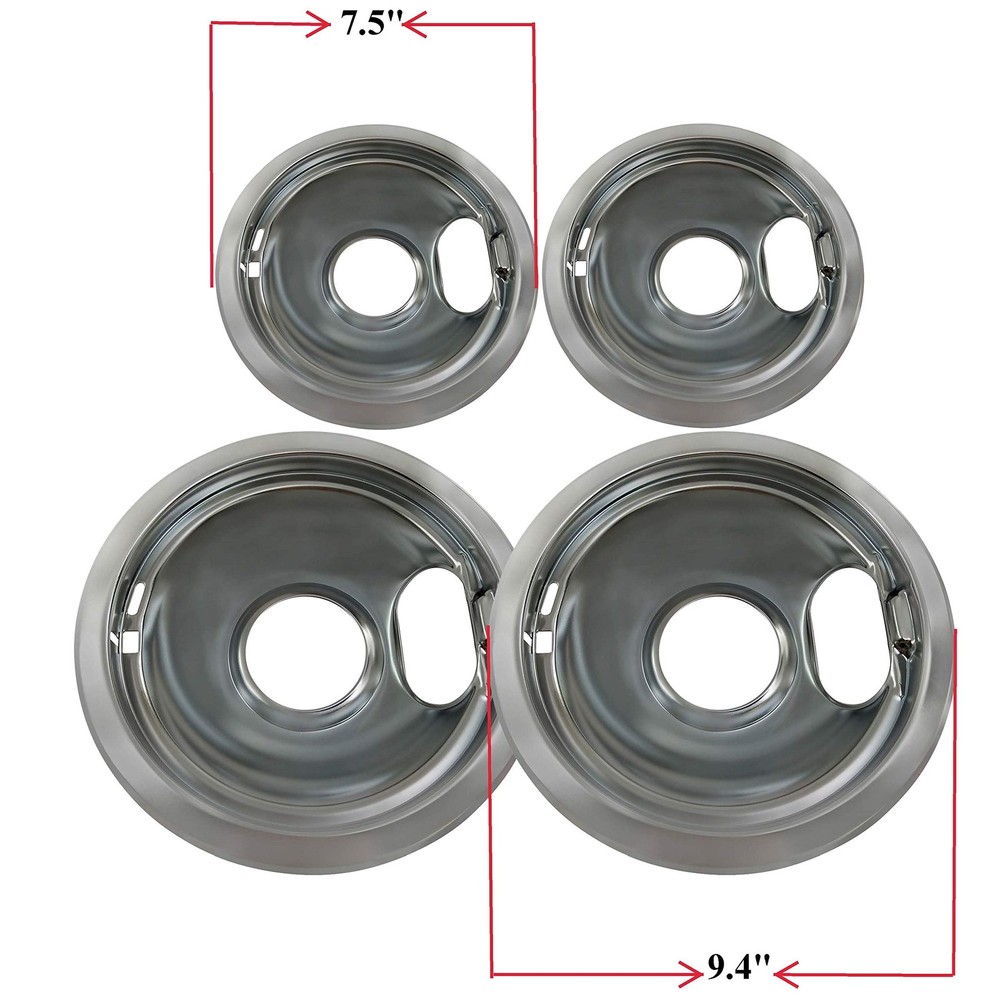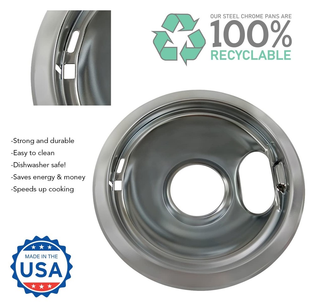 4 Pack (2) 6" & (2) 8" Replacement Chrome Pans fits most Whirlpool, Maytag, Kenmore, Sears, Amana, Crosley, Frigidaire, Caloric, Tappan, Magic Chef, SunRay, Montgomery Ward, Monarch, Admiral. most plug-in electric ranges cooktops. Set consists of: 2 each 6" & 2 each 8". 6" pan compatible with: W10196406, WPW10196406, 101, 101A, 101AM, 1065-207, 1065209, 14200056, 14200209, 14203427, 14205045, 14205549, 14210002, 14211601, 14212298, 14218107, 14219065, 19950014, 229768, 281348, 296481, 308648K, 309427K, 3150246A, 3150246P, 332-180, 7725P002-60, 7725P015-60, 8190674, 93159246B, C2710302, K15017, PS11750108, R0705553, RDP213, W10132136, W10196406BU, W10278125 8" pan compatible with: W10196405, WPW10196405, W10196405, 1065208, 14200090, 14200186, 14202962, 14205069, 14205554, 14210006, 14212235, 14213550, 14217393, 14219066, 19950013, 305839Y, 308649K, 309426K, 3150247A, 332-185, 42142, 52005, 73325-1, 7725P009-60, 7725P042-60, 7725P054-60, C2710601, CPL, L30-004, , R0179034, R0705559, W10126584, W10132135, W10179653, W10196405BU, W10278125 Features element locking slot, genuine quality replacement part. Durable, stick free, easy to clean, dishwasher safe. Proper fit of drip pan/bowl prevents rocking of the element on the drip pan/bowl, therefore preventing cookware from rocking on the stove. Save money and energy! Speeds cooking time saving energy and makes cook top look new again. Replacing chrome drip bowls and pans annually can save the consumer up to $30 per year in energy costs. Updates the appearance of stove. Manufacturers’ part numbers are solely for identification. All materials supplied by us are our replacements for manufacturers’ parts. All product and company names are trademarks or registered trademarks of their respective holders. Use of them does not imply any affiliation with or endorsement by them. [Made in the USA] using eco-friendly plating techniques. Fits most Whirlpool, Maytag, Kenmore, Sears, Amazna, KitchenAid, Crosley most plug-in electric ranges cooktops. Durable, high quality replacements for Whirlpool, Kenmore, Sears oven range or stove. [W10196406 6 inch pan] measures 7.5 inch. Compatible with WPW10196406, 101, 101A, 101AM, 1065-207, 1065209, 14200056, 14200209, 14203427, 14205045, 14205549, 14210002, 14211601, 14212298, 14218107, 14219065, 19950014, 229768, 281348, 296481, 308648K, 309427K, 3150246A, 3150246P, 332-180, 7725P002-60, 7725P015-60, 8190674, 93159246B, C2710302, K15017, PS11750108, R0705553, RDP213, W10132136, W10196406BU, W10278125 [W10196405 8 inch pan] measures 9.4 inch. Compatible with W10196405, WPW10196405, 1065208, 14200090, 14200186, 14202962, 14205069, 14205554, 14210006, 14212235, 14213550, 14217393, 14219066, 19950013, 305839Y, 308649K, 309426K, 3150247A, 332-185, 42142, 52005, 73325-1, 7725P009-60, 7725P042-60, 7725P054-60, C2710601, CPL, L30-004, , R0179034, R0705559, W10126584, W10132135, W10179653, W10196405BU, W10278125 [Package includes] (2) 6" W10196406 and (2) 8" W10196405 chrome pans [W10278125 replaces] AP4453181, 0312850, 1430-279, 1430-282, 1430279, 1430279C, 1430282, 1430282C, 1534557, 332-147, 332-148, 4320687, 4320688, 4363218, 4363219, 4363824, 4396071, 814073, 814078, AH2367458, EA2367458, PS2367458, Y0312850. Compatible with RC8920XAH0, RC8900XAB0, RC8900XAQ0, KECM860TBC0, RC8900XXW0, RS373PXWT2, RC8900XXB0, RS373PXWT1, RS373PXW3, RC8900XAH0, RC8900XAQ1, RC8900XXQ0, RC8950XRH7