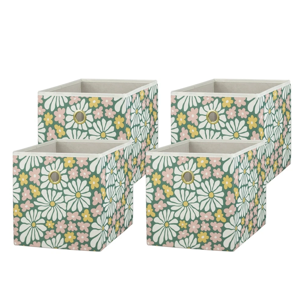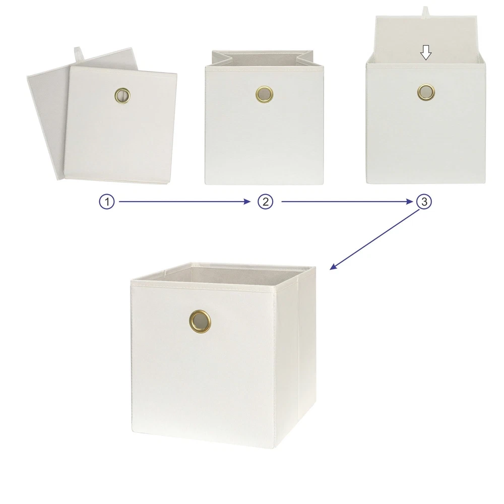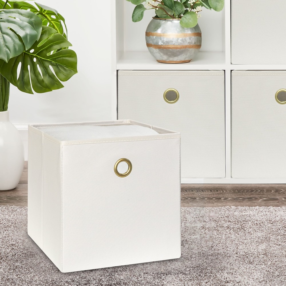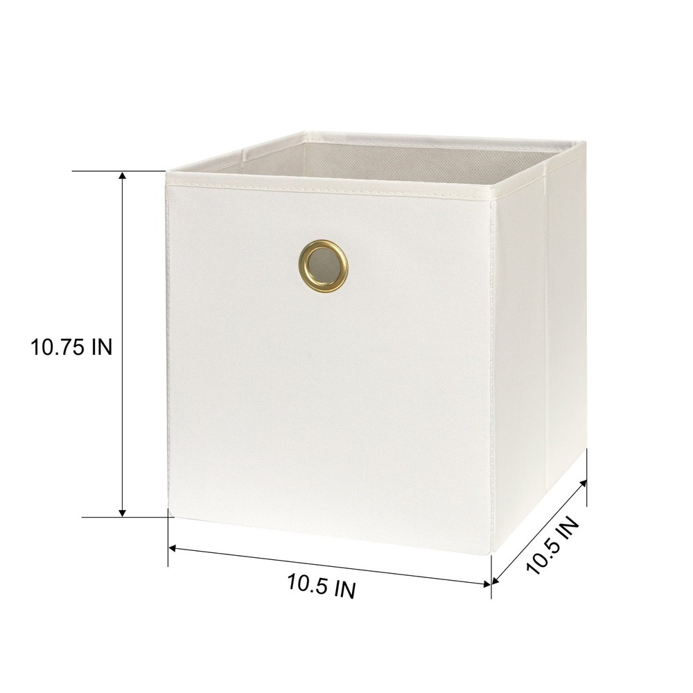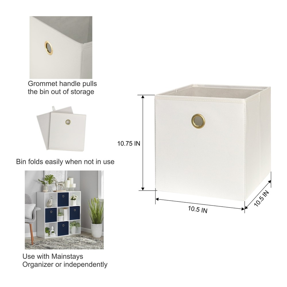 Our Mainstays Vanilla Dream Collapsible Fabric Storage Bins are just what you need to help you create an organized home. Perfect for storing kids to adult clothes, books, electronics and more, these bins' 10.5-inch by 10.5-inch by 11-inch size offers plenty of room to keep a wide variety of belongings neatly tucked away, and their sturdy, round metal handle allow you to pull them off shelves and slide them back in with ease. You can utilize our Mainstays Storage Cube's organizational expertise in your living room, bedroom, laundry room, and dorm room. When not in use, you can easily fold the bin down flat and keep it stored away in your closet for later. The fabric storage cubes are made to fit with our Mainstays Cube Storage Organizers (not included) and are designed with a durable polyester fabric that holds their shape. With a variety of colors to choose from, you'll be able to perfectly match your home decor when you get organized with our Mainstays Collapsible Fabric Storage Bins. Helps you to create an organized and comfortable home Includes 4 off-white cube organizer bins Perfect for pairing with your favorite colors and patterns to mix and match Bin features an easy carry handle on the side that makes it easy to take the bin wherever you need to go Can be used with our Mainstays Cube Storage Organizer units or independently Cubes are collapsible when not in use to maximize your space Ideal for storing books or kids and adult clothing in the bedroom, living room, laundry room or dorm rooms Made of durable polyester fabric that won't crease easily, has good abrasion resistance and holds its shape Dimensions: 10.5" L x 10.5" W x 10.75" H (26.5 cm x 26.5 cm x 27.3 cm)
