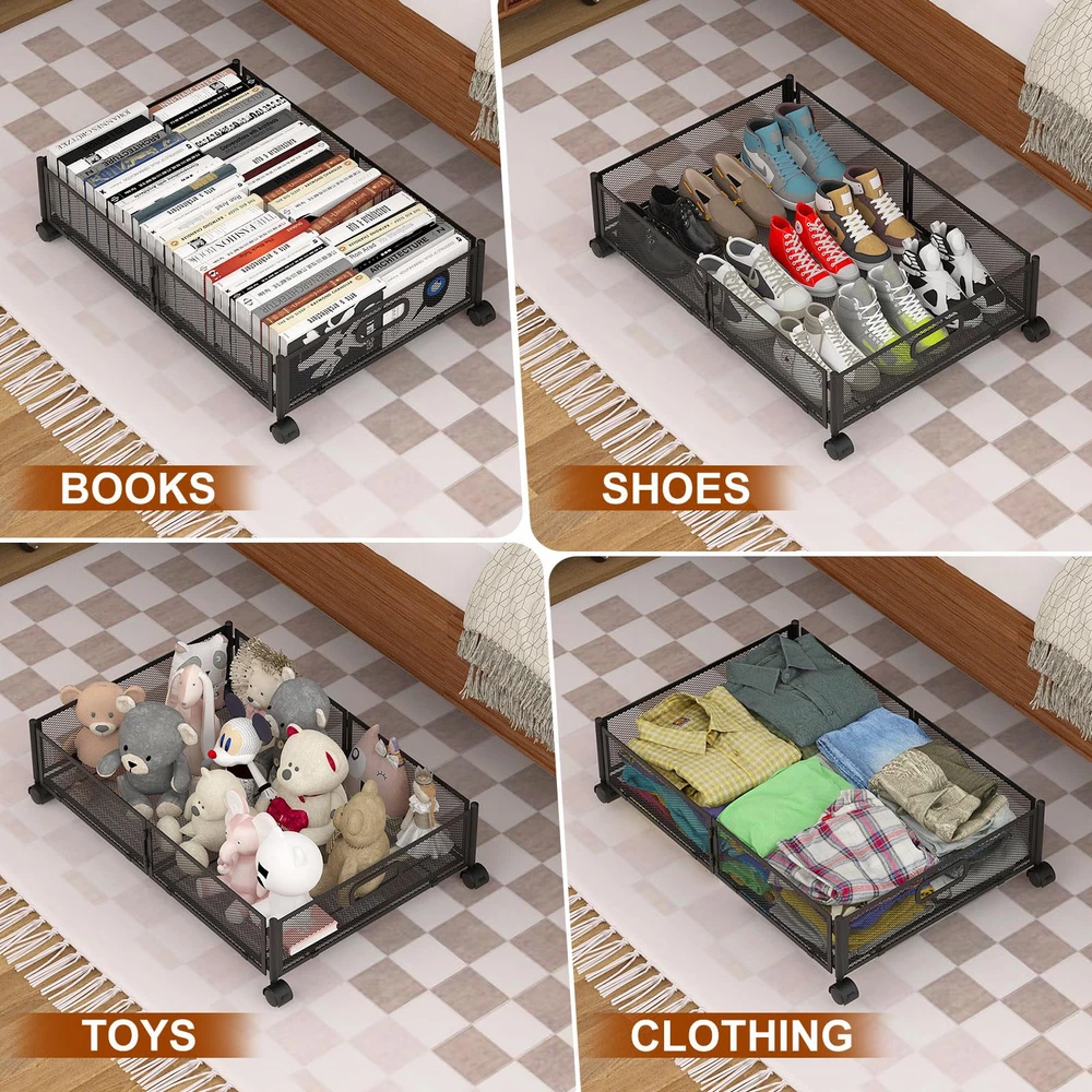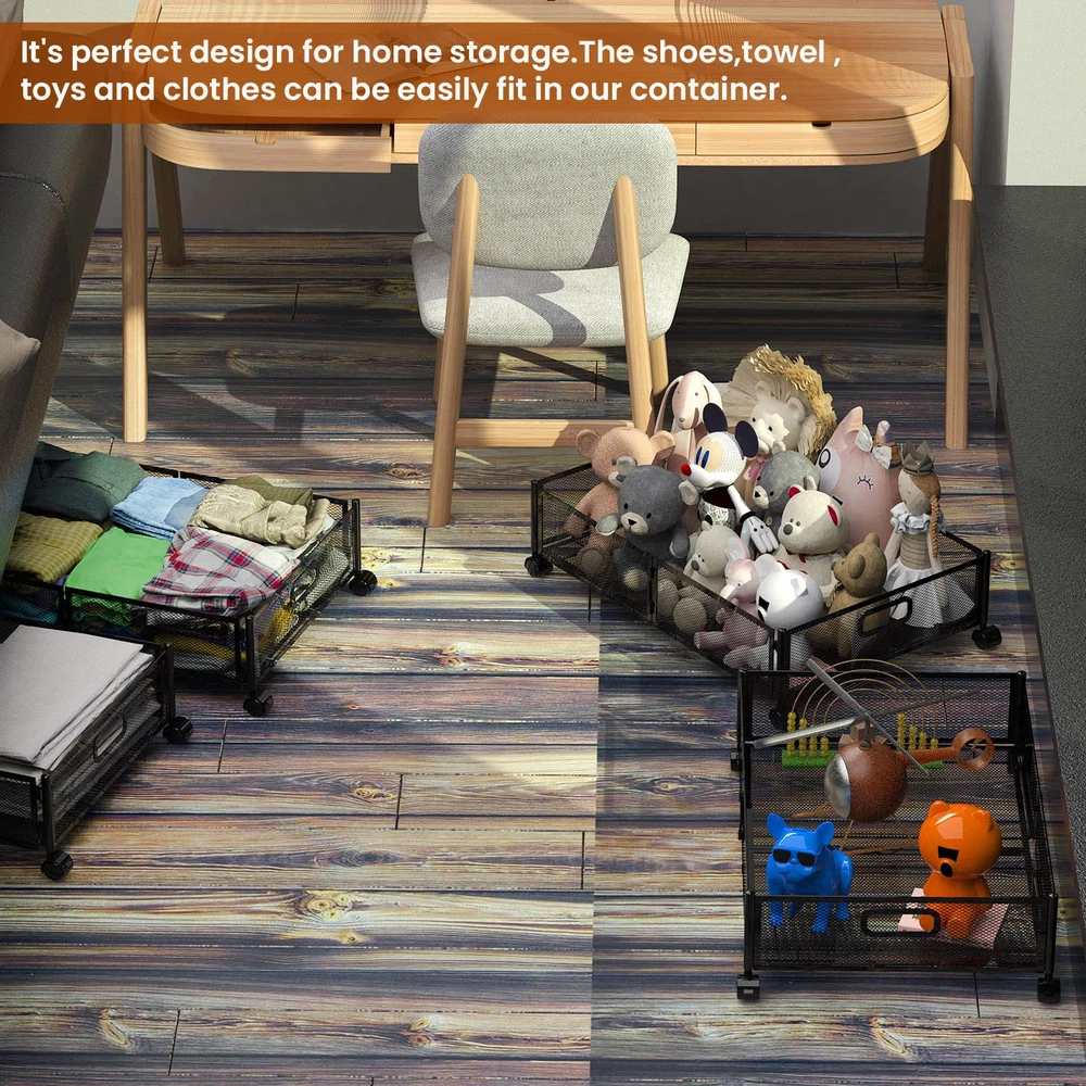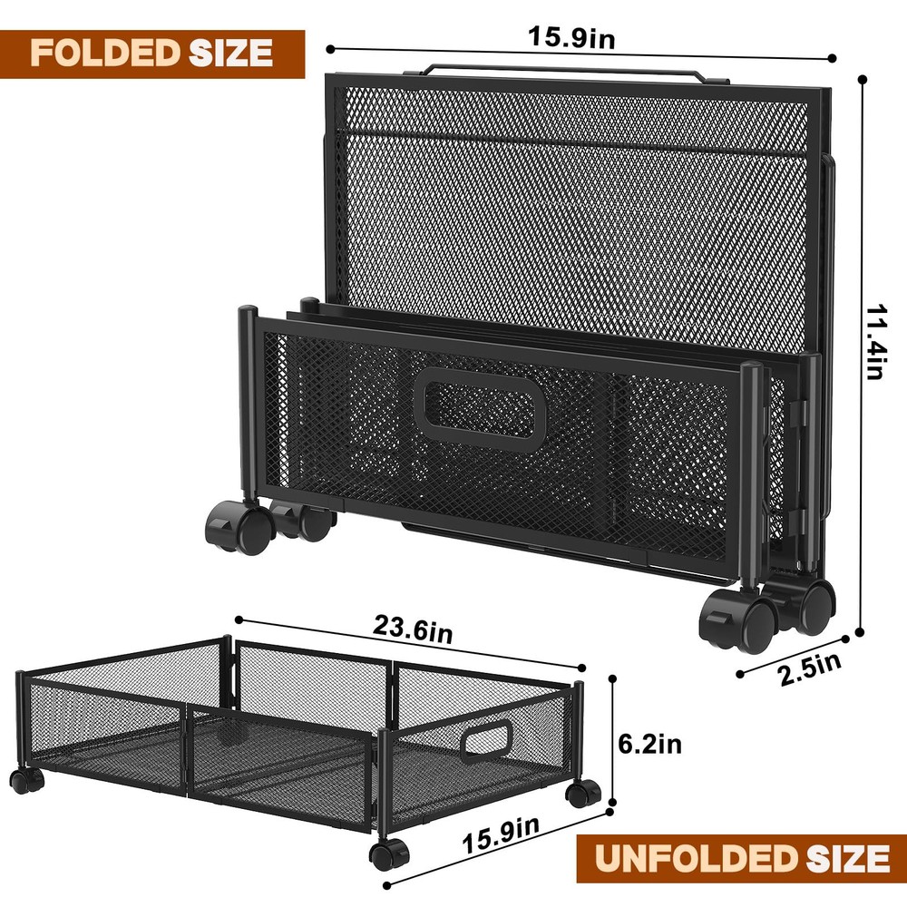 【High-quality Metal Containers】It has 4 Silent Plastic Wheels. The load-bearing capacity of this carbon steel cart is up to 22 pounds, way beyond the traditional plastics carts or non-woven materials carts 【Tool-free Assembly】The installation is so easy that you can install it in less than one minute. Just put the four wheels on the frame and then put the shelf onto it. 【Wide Application】It's great for seasonal under bed clothes and shoe storage, bedding storage and more. because of the rolling design, it can also be used as under bed drawers on wheels.It can to make your tiny space a new look! 【Foldable Design 】 Folded Size: 15.9×11.4×2.4 inches. Unfolded size 23.6×15.9×6.2 inches,No waste of space in use or placement. 【360 DEGREE ROTATING WHEELS】With 4×360-degree swivel wheels, this under-bed storage container moves around the home easily,2 of the wheels have a locking function, when you need it to stay still, you just press the locking mechanism .