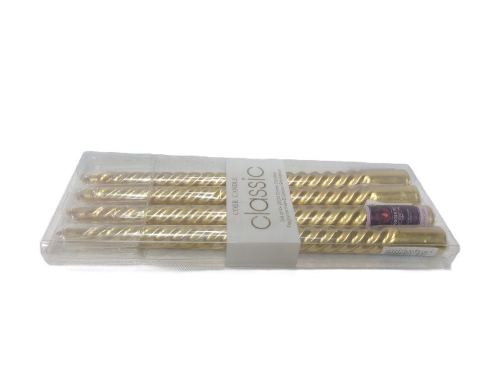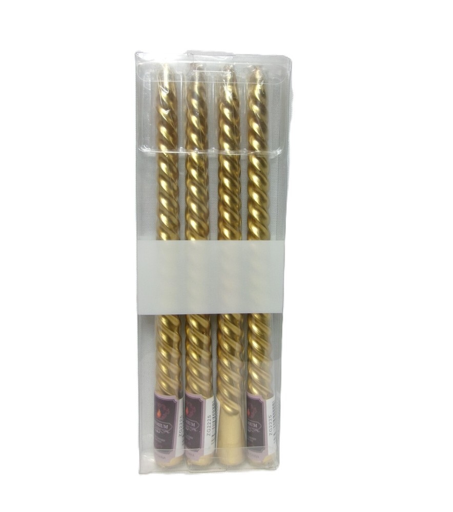 DETAILS · Set of four unique & rare shiny gold swirl spiral twist taper candlestick candles. Retro vintage-style (however these are new) 8-hour candles. Unscented, dripless, and smokeless. Unused and new in package. Very good condition – I found no flaws. Candles are approx. 9 ¾” tall. - VISIT MY EBAY STORE! - I am selling many other vintage items and offer combined shipping; Message me for a quote. _____________________________ If there is any issue you are not happy with, please message me directly. I aim for 100% satisfaction! _________________________________________
