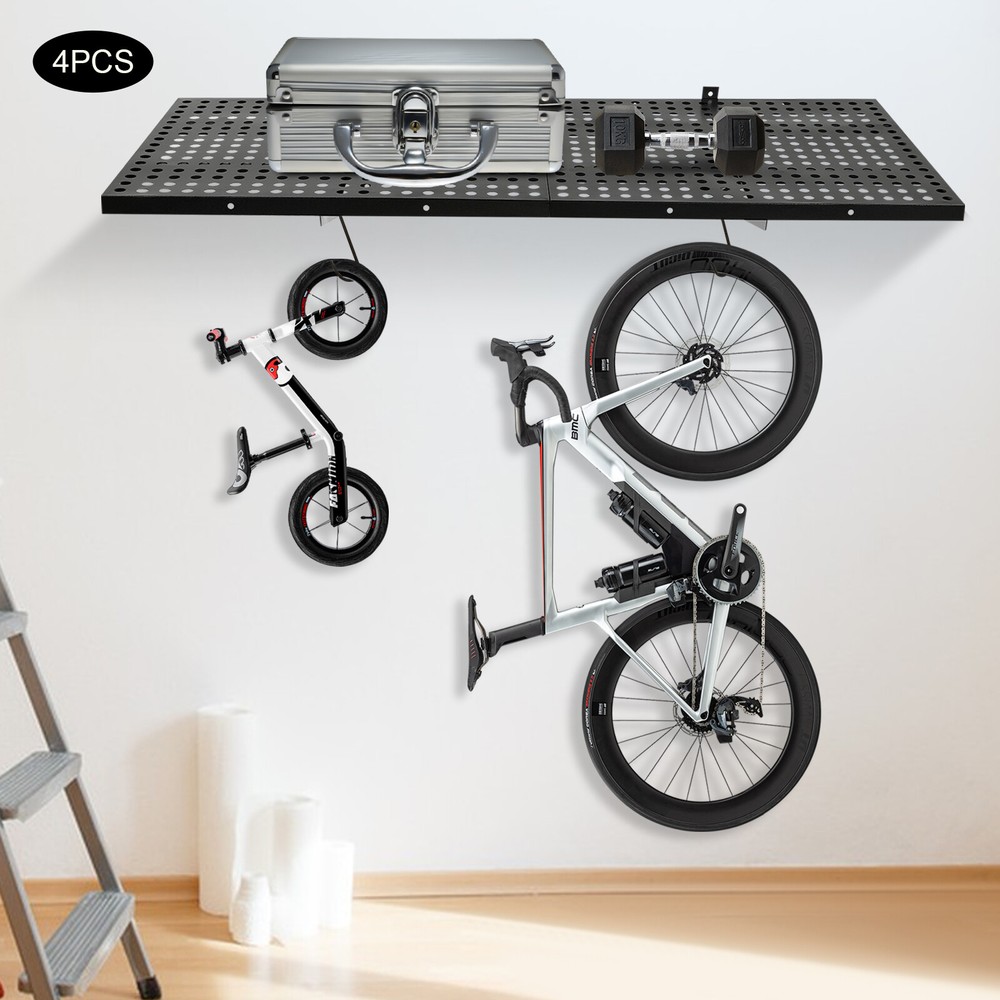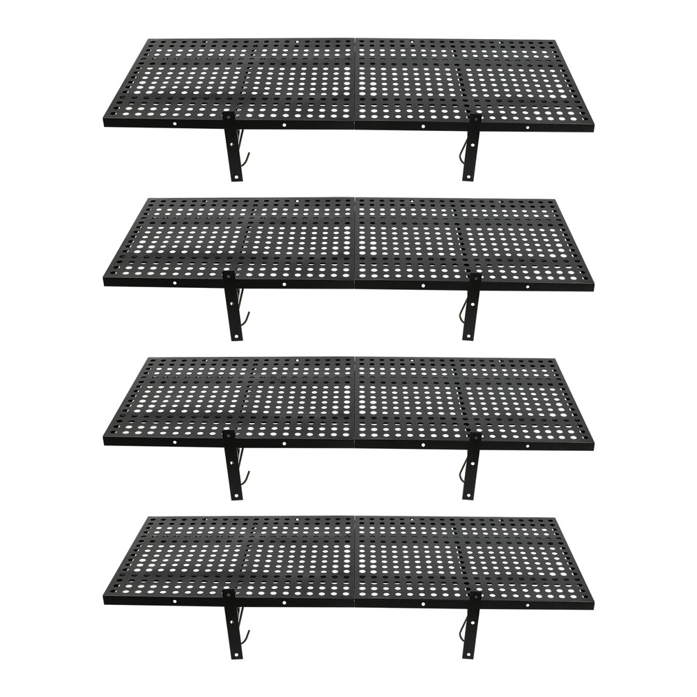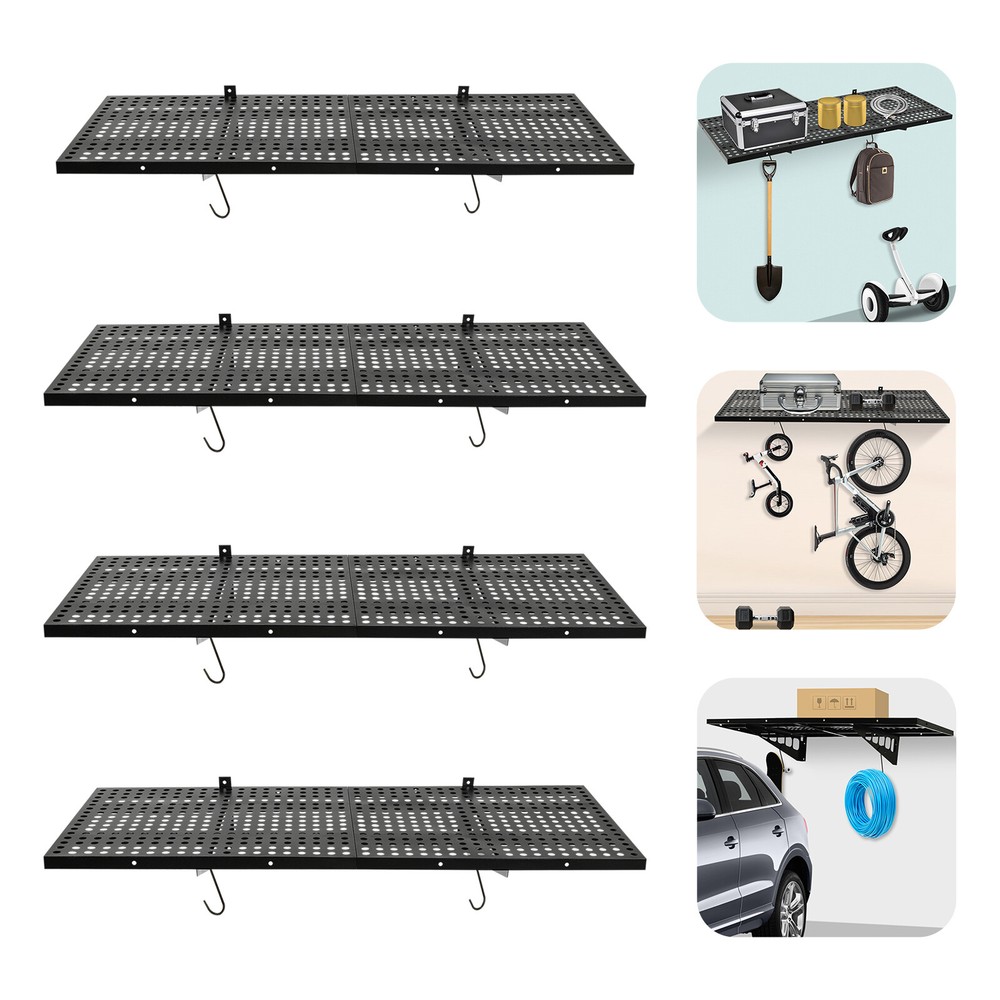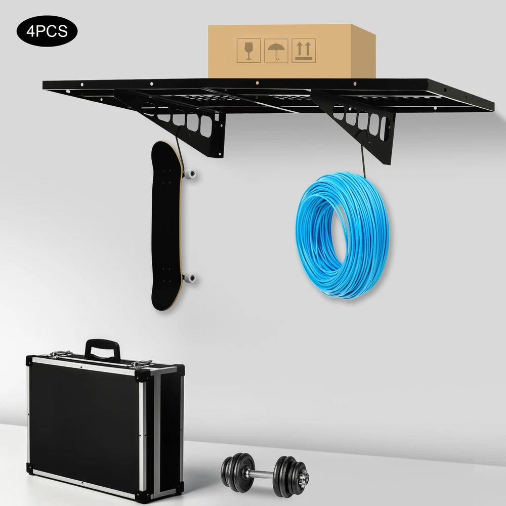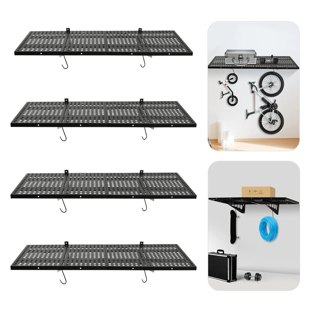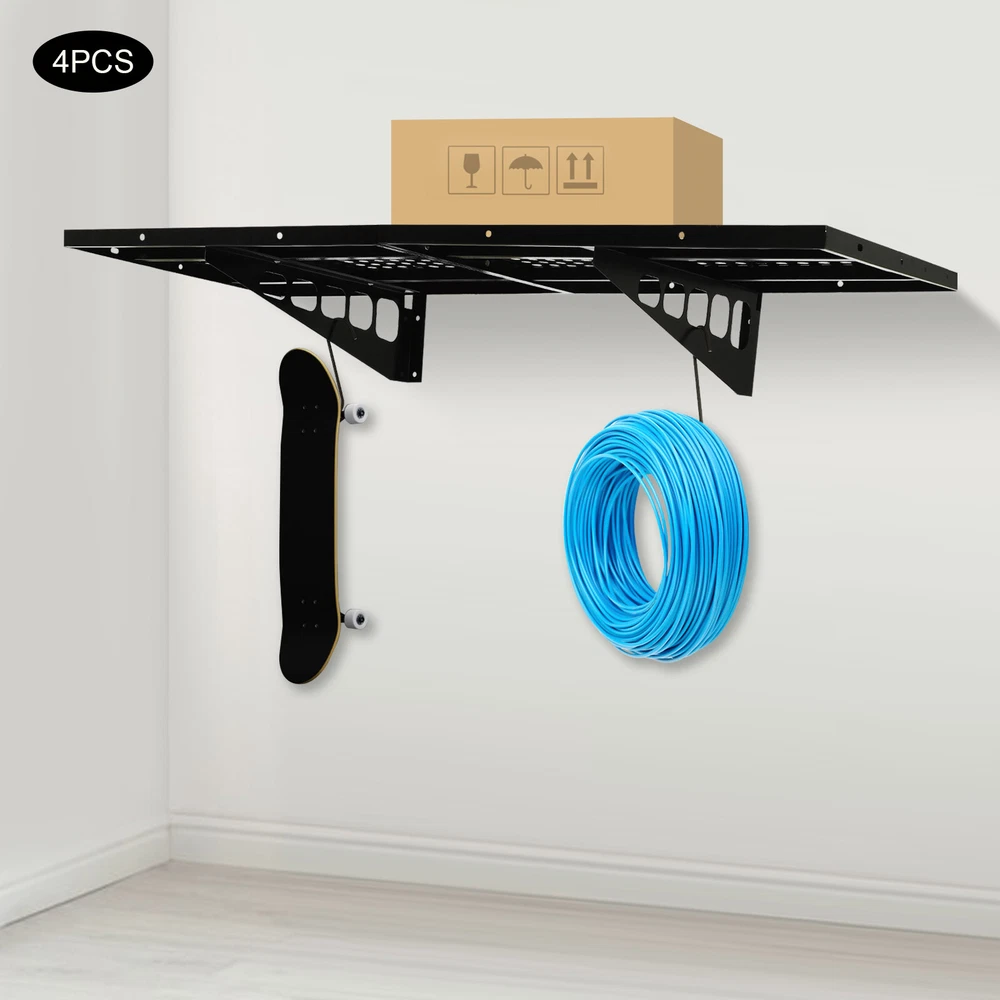 Garage Floating Shelves Shelf Wall Mounted Storage 4pc 4x1.7 ft up to 560lbs Description This set of garage wall shelves is made of high-quality carbon steel, which boasts strong load-bearing capacity, stable structure, rust resistance, and durability. The perforated surface makes it strong and non-slip at the same time, which ensures safety when storing items. Meanwhile, it is able to store a wide range of items with a load capacity of up to 560 lbs, which can help you effectively utilize your garage space and improve storage efficiency, providing you with efficient, safe, and convenient storage solutions. Key Features Sturdy&Durable: It is made of high-quality carbon steel with a plastic spraying surface, which features high hardness, high strength, and high resistance to corrosion and rust, making our products can be used for a long time. Large Capacity: The wall-mounted storage rack is 20*48 inches and the removable storage hooks can be moved to any position, allowing you to store various sizes of items and tools on it and meet your actual storage needs while saving space. Strong Structure: The stable triangular brackets and sturdy perforated panels with welding process allow our products to carry up to 560 lbs(two boards), which can meet your various storage needs. Flexible Installation: It can be installed vertically or horizontally, allowing you to use the appropriate installation method depending on the size of the installation space and the items to be stored. Money Saving: The package includes enough mounting accessories such as expansion screws and nails to save you time and money. Easy to Clean: It is simple and easy to disassemble making cleaning effortlessly. You can wipe it with a damp rag or disassemble it and rinse it with water for a complete cleaning. Space Saving: Its compact design takes up small wall space and is capable of carrying quite a lot of items. It organizes floor clutter into wall space, expanding more space to use and making your garage and storage room neater. Ideal Gift: With a strong structure and premium material, it is a nice gift for your friends, colleagues, and families for organizing their garages or warehouses. Customer Service: We aim to provide quality products and services. If you have any problems, please feel free to contact us. We will reply and solve the problem for you as soon as possible. Details Hanging Hooks: 8 hooks can help you easily store or take frequently-used tools like hammers or drills, or your clothes, making your work more convenient and highly efficient. Perforated Plates: They are not just strong and durable but also boast good ventilation, keeping your items dry and allowing the odor to dissipate in a timely manner. Application It can be installed on wooden and cement walls for storing tools and items in your warehouse or garage. How to Install Measure the installation distance of the bracket. Place the installation template against the wall and place it at the proper height by using a level. Mark the center of the circle by positioning holes of appropriate width. Remove the installation template and then punch holes in the marked positions. Install the bracket. Secure the perforated plate to the bracket. Installation complete. Specifications Color: Black Material: Carbon Steel Shelf Type: Bracket Shelf, Floating Shelf Shape: Rectangular Surface Treatment: Plastic Spray Process: Welding Mount Type: Wall Mounted Assembly Required: Yes Each Product Size(Two Boards): 50.8*121.92cm/20*48inch Each Bracket Height: 20cm/7.87inch Distance Between Center Points of Wall Studs: 60.96cm/24inch Load Bearing of Two Boards: 254kg/560lbs Packaging Size: 52*62*12cm/20.47*24.4*4.72inch Gross Weight: 18kg/39.68lbs Package Included 4*Garage Wall Shelves 8*Hooks All Accessories for Assembly Notes Please check the size carefully before ordering. It is normal that the expansion screw will blow up after the force is applied. It cannot be installed on metal walls. When installing it on cement walls, you need to drill holes in advance. When installing it on thin wood walls or hollow walls, you need to install a certain thickness of solid wood struts(not included) laid on the front or back of the wall to provide support. Before purchasing, please check the product information carefully to make sure the load bearing of your wall and the installation environment are suitable! Please check the screw hole spacing carefully if it is installed on the studs! Please allow the slight color difference caused by the shooting light and 1-3cm error due to manual measurement, and make sure you do not mind before you order. Payment Delivery details Terms of sales About us Contact us Payment We accept ebay payment 。 Fees such as import duties, taxes are not included in the item price or shipping costs. These charges are the buyer's responsibility. Delivery details Shipping: 2-9 working days to: USA Terms of sales We maintain high standards of excellence and strive for hundred percent customer satisfaction. Feedback is very important to us. We hope that you contact us immediately before you give neutral or negative feedback, so that we can address your concerns. It is impossible to address issues if we do not know about them! About us Your satis faction is our ultimate goal. We work hard to earn your trust and future business. Our certified technicians have tested each item before shipping. The unit comes with 1 year limited warranty on all manufacturing defects. a) If you receive a defective item, you may return it or ask for a discount. Please contact us within 14 days after you receive the package. b) What you returned must be intact and in its original packaging as re? u. Customer is responsible for shipping costs of the returned item. c) We will cover the cost of shipping back t with the shipping rate indicated in the registration page. We will send you a new unit or refund the full payment you paid. Thank you. Contact us Business Hour Business Hour: Monday