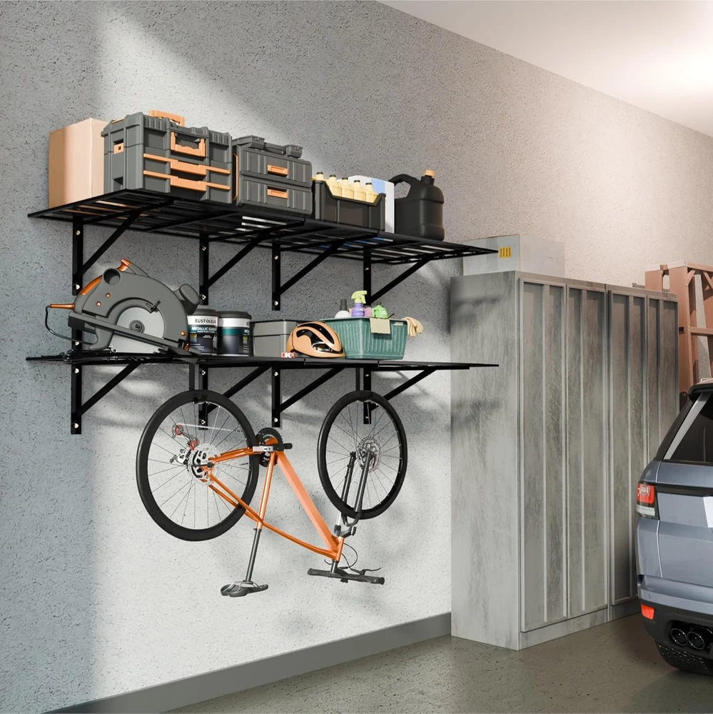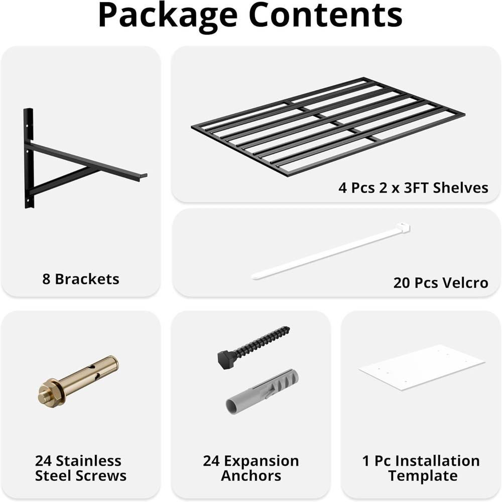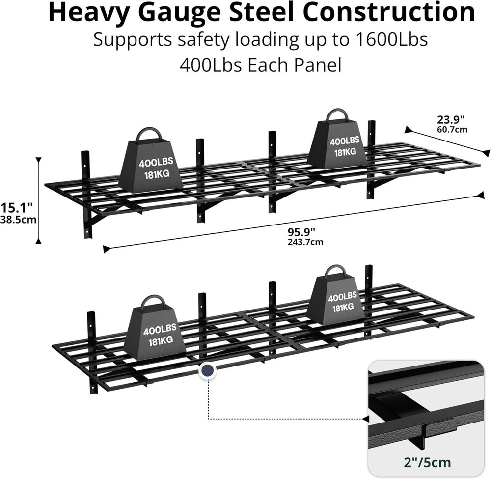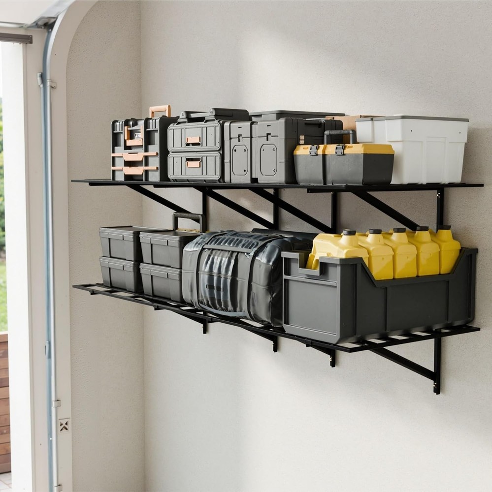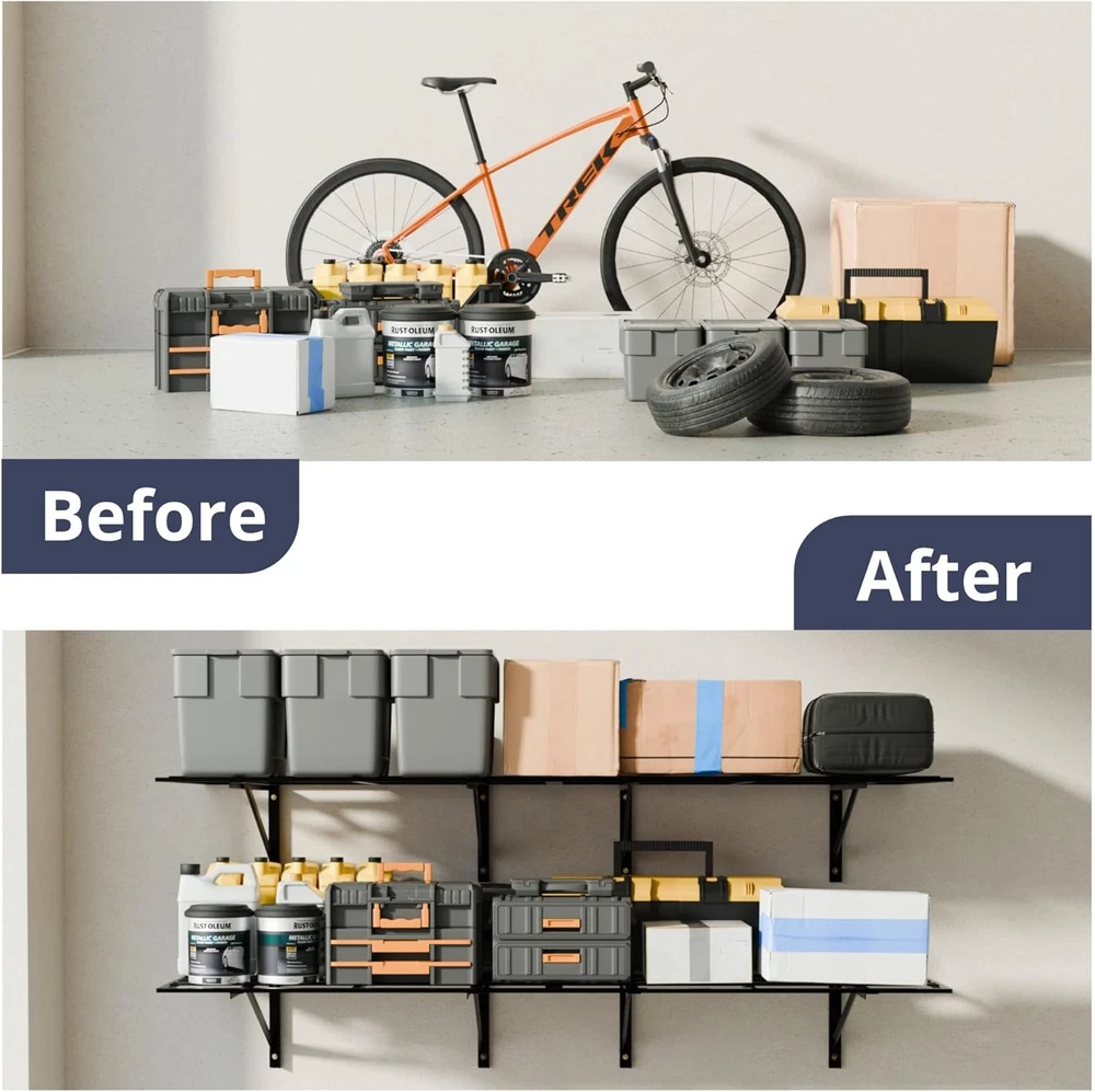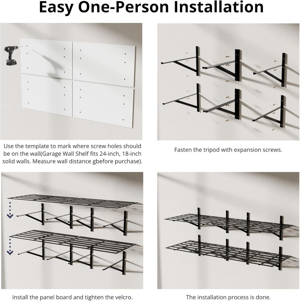 4-Pack 2x3ft Heavy Duty Garage Wall Shelving 1600LB Capacity, Adjustable 24"x72" Steel Storage Rack with Concave-Convex Design - 10-Minute Install for Garage, Basement, Warehouse (Black) Product Description About this item 1600LB Total Weight Capacity (400LB/Shelf): Industrial-grade welded steel frames & 3x thickened bars hold heavy tools, auto parts, or bulky bins. Rigorously tested for 1600LB total load (400LB/shelf) — ideal for garage, warehouse, or retail storage Patented Concave-Convex Anti-Collapse Design: Unique ridged steel plates disperse weight evenly, reduce joint stress, and prevent bending. No weak wires! Ensures stability even with uneven loads like tires or machinery Adjustable Lengths (18" or 24") & Flexible Layouts: Shift shelves left/right via 3-position holes to fit tight spaces, irregular studs (18", 24"), or high ceilings. Mount vertically, side-by-side, or split across rooms 10-Minute One-Person Installation: Pre-drilled holes, numbered hardware, step-by-step guide enable DIY setup. Includes wood/concrete screws for secure mounting — no rattling or wobbling Rust-Resistant & Lifetime Guarantee: Humidity-proof powder-coated steel survives grease, damp basements, or daily abuse. Backed by Cozy Castle’s lifetime warranty — organize smarter, store safer Previous page Next page Previous page Next page