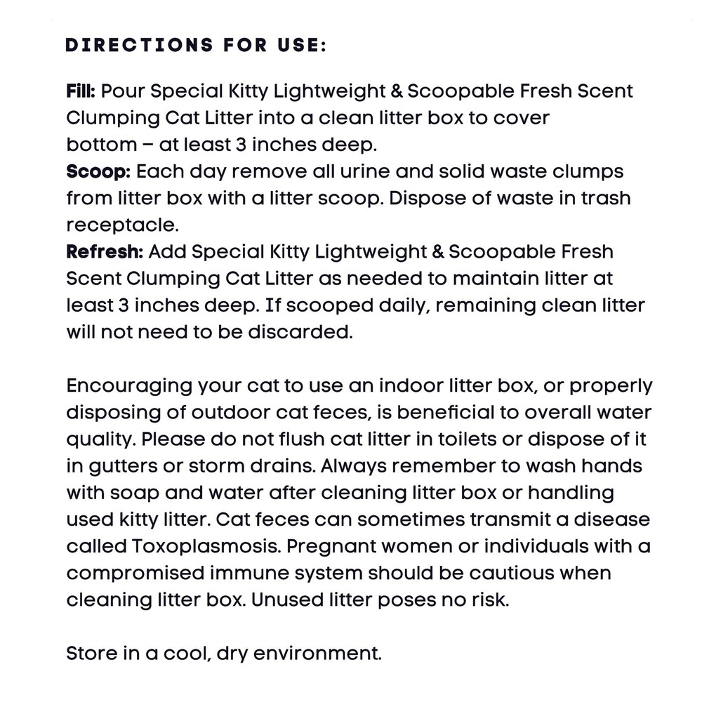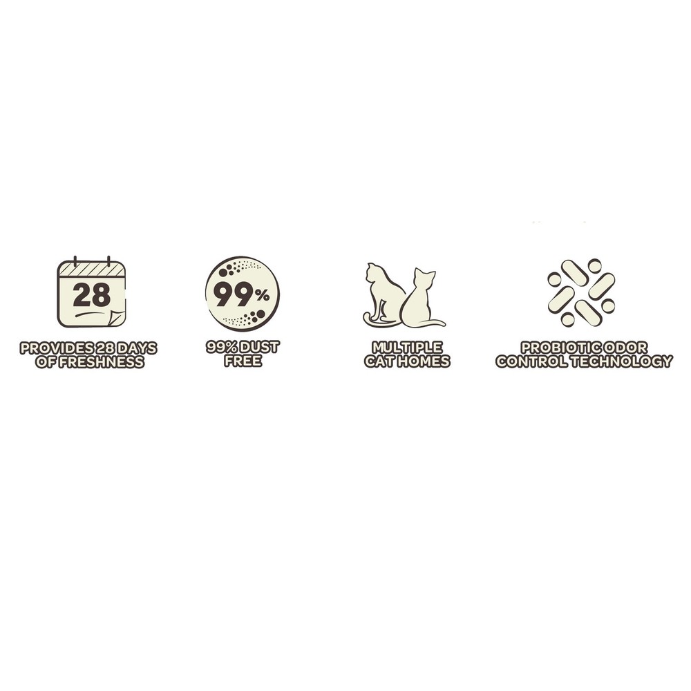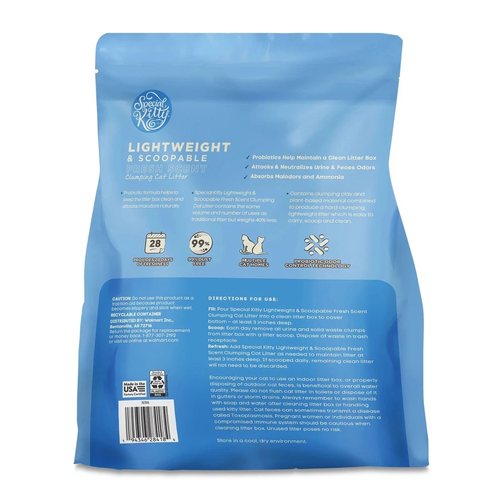 Product details Lightweight and Scoopable Fresh Scent Clumping Cat Litter, 8.5 lb Bag gives you the same number of box fills as heavier litters while weighing 40 percent less, making refills effortless. Fast-forming clumps trap liquids on contact and resist breakage for quick scooping, while a subtle fresh fragrance keeps odors under control. The formula stays 99 percent dust free to help maintain cleaner air and floors, and the resealable stand-up pouch slides neatly onto pantry shelves. Enjoy an easier litter routine with Lightweight and Scoopable Fresh Scent Clumping Cat Litter, 8.5 lb Bag. Lightweight and Scoopable Fresh Scent Clumping Cat Litter, 8.5 lb Bag Provides 28 days of freshness 99% dust free Multiple cat homes Probiotic odor control technology Ammonia control formulation Probiotics neutralize malodors naturally 7-day odor control 8.5 lb bag