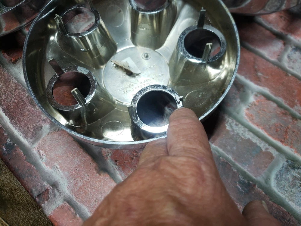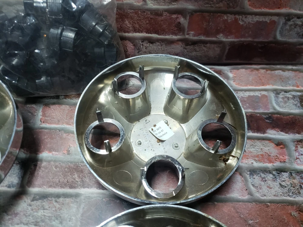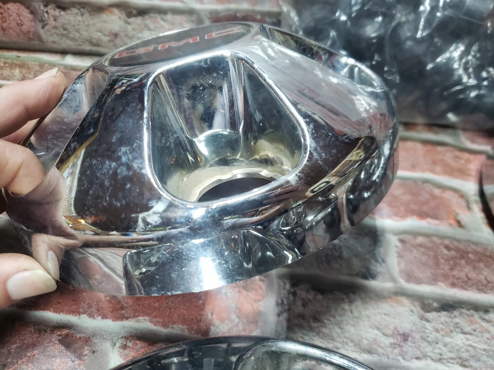 Set of 4 1986-2002 GMC Safari Wheel Center Rim Cap Hub Cover 5 Lug 15697614 OEM. Includes the lug caps. New old stock. One of the tabs is broken. I'm pointing to it in one of the photos. One also has some tarnish or residue on it that might clean up.