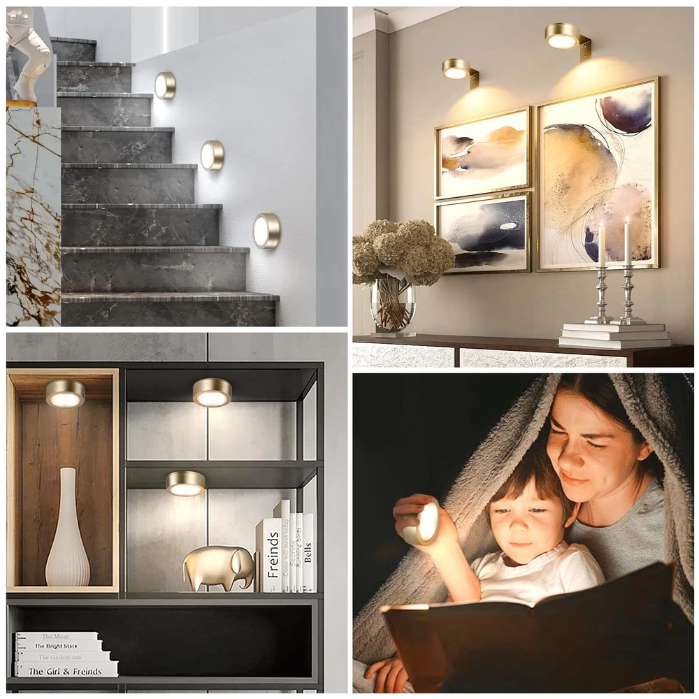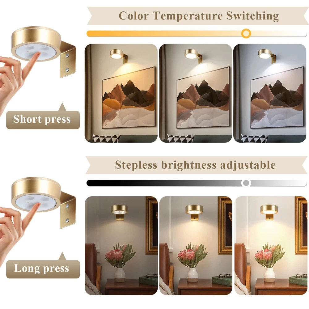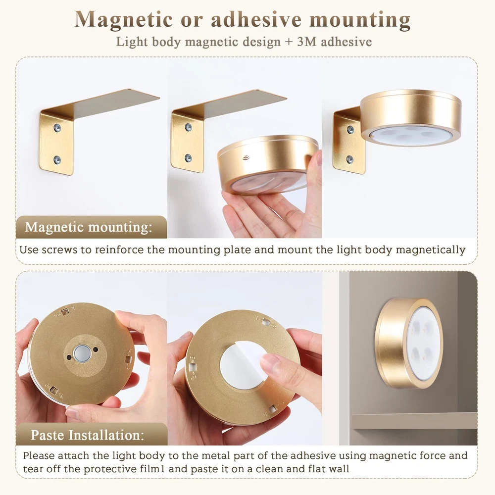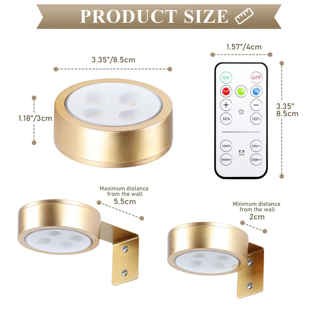 Description Gold Magnetic 4-Pack Battery Operated Picture Lights Product Description: LED Battery Operated Picture Lights Simple design but widely used painting lamp and art display lamp: This wireless art display light for picture frame painting is creative, artistic, simple and personalized. Widely used for picture display, portrait display, painting art lighting, picture frames, library lighting, and accent lighting. This magnetic picture lights can also be used as a flashlight, removable light, portable light, emergency light. Two mounting options for this magnetic picture lighting: 1. with magnetic mount and strong 3M adhesive. Remove the tape on the bottom of the mount. Use the strong adhesive to mount the lamp base on a smooth and clean surface, and then use the magnetic attraction to mount the lamp body. 2. Screws and holes are provided on the lampholder. If the surface of the light fixture you are installing is not smooth and clean, you can use screws to reinforce it. You can use screws to reinforce the installation. art lighting for paintings wireless Product Information: Color temperature: 3000K-4500K-6000K Power: 2.25W Battery requirements: AA battery power supply Material: plastic/acrylic Control mode: press/remote control Endurance: 30-60 hours of continuous lighting (Rechargeable AA batteries recommended) lights for pictures on wall wireless Please note: Before installing with 3M adhesive, please make sure the installation surface is clean, flat and smooth. Otherwise it will affect the performance of the 3M adhesive and cause the fixture to fall off. Please be careful when using screws when installing reinforcement as this will inevitably damage the surface being installed. Accessories: Lamp body × 2 Lamp holder x 2 Mounting plate x 1 Remote control x 1 User manual x 1 【Magnetic Design & Electromagnetic Drive】Gold wireless Picture Light features a magnetic attachment structure that makes it easy to remove and replace batteries. Picture light is powered by 3 AA batteries (batteries not included). Run time 30-60 hours (Rechargeable AA batteries recommended) 【Dimmable & Timer Function】Button control and remote control both can switch the color temperature(3000K-4500K-6000K). Also two ways for dimming this magnetic picture lights for wall. Button control: Stepless(Long press). Remote control: stepless(Button”+”&”-”); You can use the remote control to turn on/off the lights and easily realize dimming function, with four timing functions, and you can set the lights to turn off automatically after 15, 30, 60, or 120 minutes. 【Push button and remote control】Two control methods for this magnetic art lighting for paintings wireless which are button control and remote control. LED picture light also comes with a remote. Eliminated the hassle of button control. You can complete all settings through the remote control: ON/OFF; 3 color temperature switching; brightness adjustment and Timing 【Easy to Install】This LED wall lights comes with a magnetic fixture and strong 3M adhesive. The package comes with all the necessary accessories for installation, you just need to use the expansion screws to fix the iron plate on the wall and then use the magnetic hockey puck light to fix it on the iron frame, it is very easy to use.3M adhesive can be used in cabinets or closets! 【Application&After-Sales Service】Our universal multifunctional wall lamp is small&simple design but modern&widely application. This magnetic wall light is widely used in wall art light on living room, bedroom,decoration room, kitchen, office, garage, good for small or mdeium size pictures paintings frames artworks protraits posters canvas etc.We provide 24 months warranty for wireless picture lights for wall, please feel free to contact us if you have any needs.