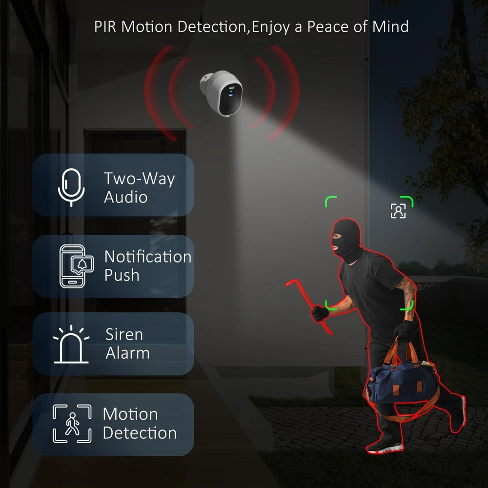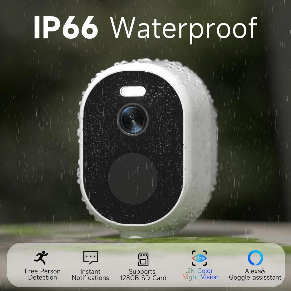 Wire-Free, One-Touch Wireless Setup,Installs Almost Anywhere: This cameras for home security with quick and stable Wireless Connection.And the IP66-rated weatherproof camera allows you to mount the security camera without the hassle of wires. So you can confidently install it outside in the rain or inside in the kids room Enhanced 2K Color Night Vision: Picture Perfect outdoor camera wireless.Night or day, see everything in vivid color and 2K clarity, ensuring no detail is missed even in the darkest conditions. Monitor a larger area with an industry-leading 130° field of view Two-Way Audio Security Cameras Wireless Outdoor: See, hear and speak to people and pets in your home from your smartphone with Tuya’s live view and two-way audio. Stream your live video feed hands-free on compatible with Google Assistant, or Amazon Alexa for complete control over your surveillance. Enables the device to engage live view, arm and disarm your system, and use your voice Deter Intruders: RICHCHOHK Security Camera alerts you instantly when motion is detected. Motion Detection Zones and custom settings allow you to adjust the sensitivity of detection or turn it off completely. And you can also use the built-in siren to deter potential intruders Secure Local or Cloud Storage: Get secure cloud recording as well as person, package, pet, and vehicle detection with Tuya App (subscription required), or insert a microSD card (up to 128GB, sold separately) to record videos locally.Capture every moment with recordings up to 120 seconds long! Get instant alerts for low battery and offline status, ensuring you never miss a crucial video Never miss a moment with our advanced security camera! Enjoy 15-120 seconds of event recording, plus instant offline and low battery alerts, ensuring you're always informed and protected. Capture critical moments with ease and confidence with our cutting-edge security camera! Experience seamless capturing and sharing with our smart security camera's intuitive app interface. Record videos and take snapshots directly to your phone, making it effortless to save and share memorable moments anytime, anywhere with this wireless security camera!