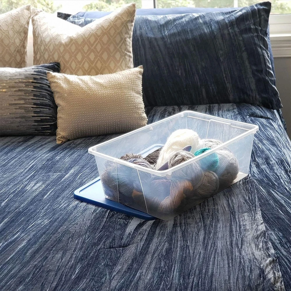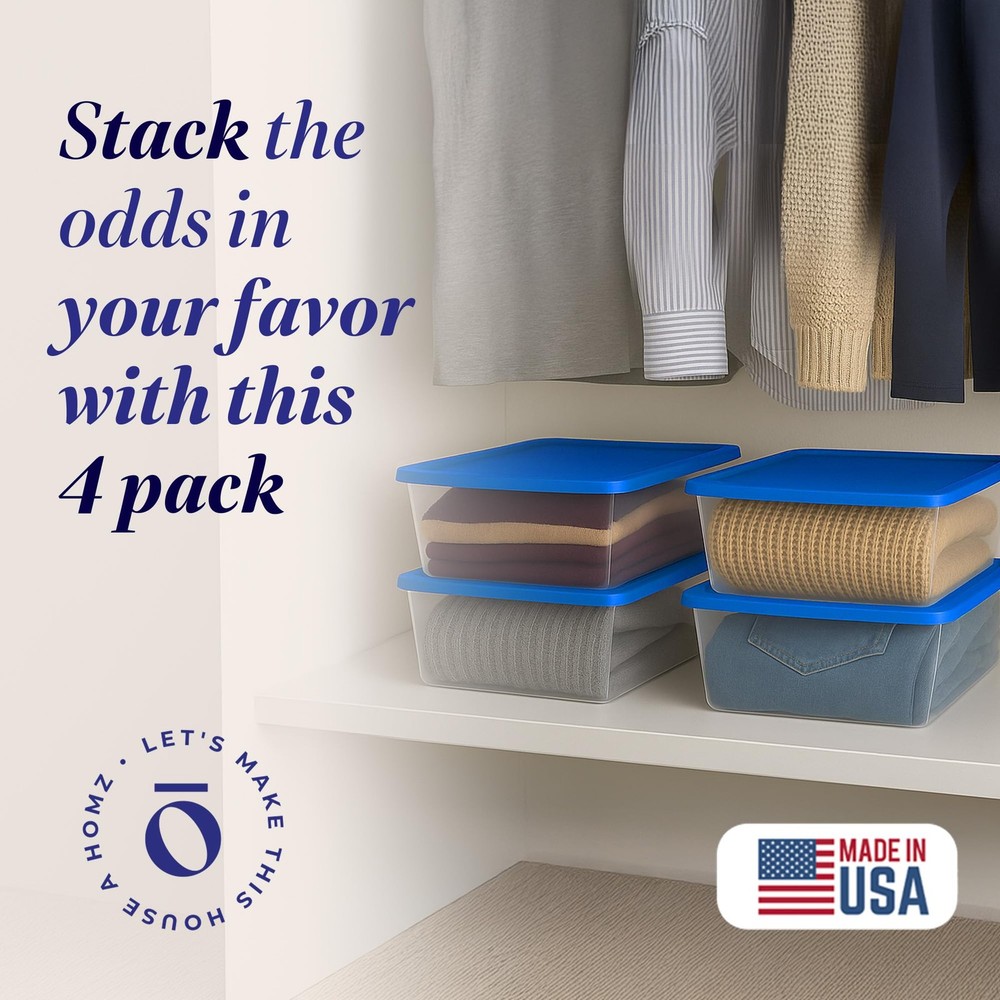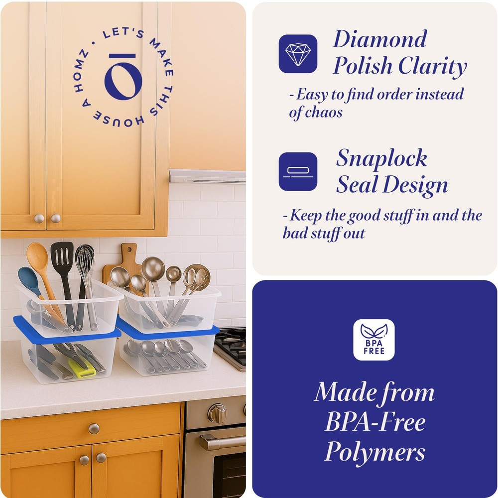 Sized for the Small: Keep your small items stored and organized in these small plastic totes for storage. Like the popular kid at school, each 12-quart flat storage bin will fit in wherever it goes. Big on Strength: These flat totes are made from sturdy transparent plastic and feature snap-on lids. Each box measures 16.25" L x 11" W x 5.63" H, providing plenty of space for your items. We'll Make It Fit: Too much for one small container? Don't worry, this set has flat bins enough to cancel the clutter. You can even stack the totes to maximize your storage space even more! From Trash to Treasure: Life in plastic is fantastic when the plastic is made from 90% recycled materials. We know the earth is important to you, so our totes are good for your items and the planet. for Your Home: From organization to storage, we have the container that you are looking for. Allow us to make your house a .