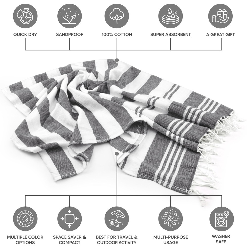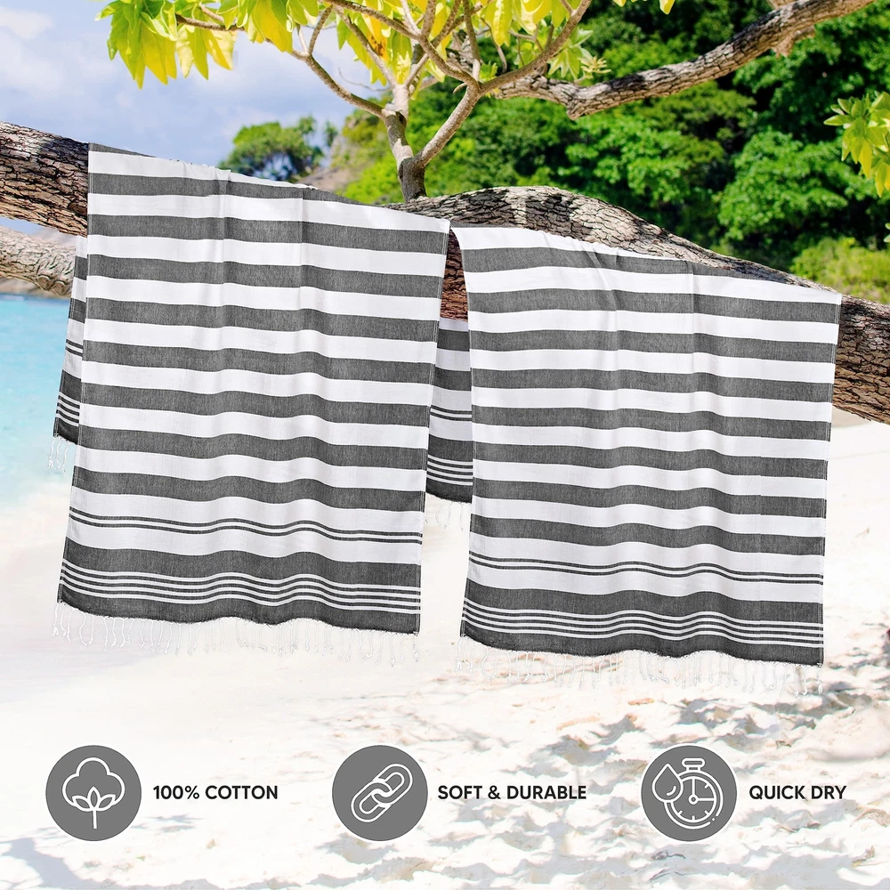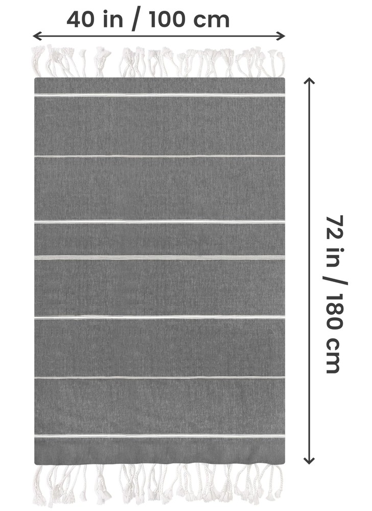 4 Pack Turkish Beach Towel, 40 by 72 Inches, 100% Cotton, Oversized Sand Free Lightweight Quick Dry, Prewashed for Soft Feel, Large Turkish Peshtemal Towel for Travel, Grey Pack of 4 - The set of 4 Turkish Stripe Beach Towels measuring 40 x 72 inches each. They are super convenient to use and provide maximum absorbency. Luxurious Quality - Crafted with 100% premium cotton fabric, the large beach towel is designed to soak up more water and is quick to dry. Our lavish towels will leave you with a fresh feeling all day. Stylish, Soft & Compact - Streamline your summer with our quick dry beach towels, as they make an elegant addition to any setting. The towels are acutely soft in touch, super handy and portable. Immensly Practical - The sand free beach towel is highly functional, rolls up neatly to fit in your bag or closet. Perfectly suitable for bathroom use, beach, spa, pool, gym, yoga, travel, camping and other versatile preferences. Care Guide - It is recommended to machine wash the towel before use and line dry for best results. Turkish Beach Towel (40 x 72 Inches) - 100% Cotton Oversized Sand Free Lightweight Quick-Dry Turkish Towel, Prewashed for Soft Feel, Large Peshtemal Towel for Travel Shipping We offer FREE shipping on all orders! We ship within Three business days of payment, usually sooner. We use a selection of shipping services such as UPS, FedEx, USPS etc. We only ship to the lower 48 states, no APO/FPO addresses or PO Boxes allowed. Local pickups and combined shipping options are not provided at this time. Return You can return a product for up to 30 days from the date you purchased it. Any product you return must be in the same condition you received it and in the original packaging. Please keep the receipt. Payment We accept payment by any of the following methods: PayPal Please pay as soon as possible after winning an auction, as that will allow us to post your item to you sooner! Feedback Customer satisfaction is very important to us. If you have any problem with your order, please contact us and we will do our best to make you satisfied. Contact Us If you have any queries, please contact us via ebay. We usually respond within 24 hours on weekdays. Please visit our eBay store to check out other items for sale! Thank you for shopping at our store.