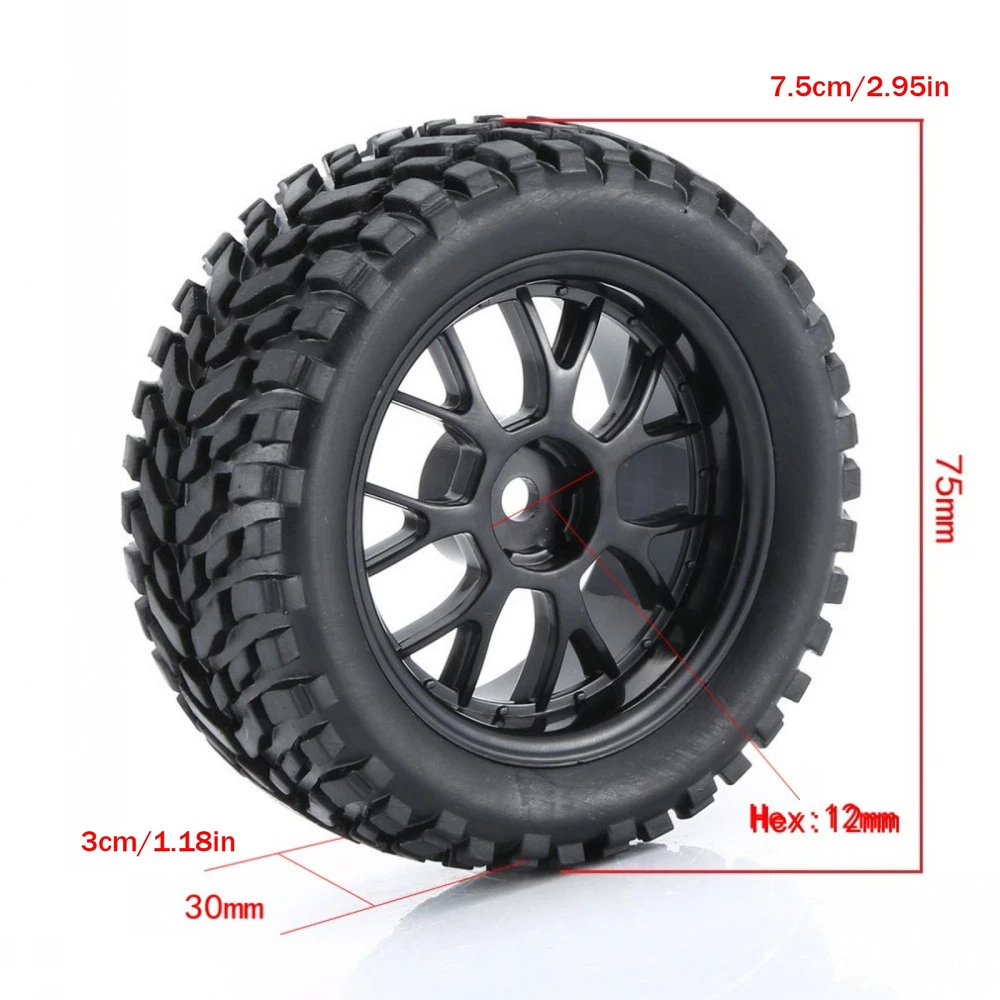 Product Description Feature: 1, High-speed off-road vehicle wheels and tires monster truck tire wheel 2, 75mm widened anti-rollover 3, Made by high-quality rubber and plastics materials, which is more durable and sturdy, practical, and environmentally friendly. 4, Its surface has an anti-skid effect, which can provide a strong ability of road holding and durability and can ensure stable and flexible driving. Suitable for WLtoys 144001 124018 124019 1/14 1/18 1/16 off-road car and Remo 1631 HSP Tamiya RC Car Specification: Tire material: Rubber Wheel material: ABS Tire diameter: 75mm /2.95inch Tire width: 30mm /1.18inch Wheel diameter: 50mm /1.97inch Wheel hub width: 26mm /1.02inch Hex: 12mm Colour: Black Weight: 154g Package List: 4 Pcs RC Wheels Tires Note: RC Car not included! Shipping Returns Contact Us Payment 1. Items sent from US warehouse. 2. Receiving time = Processing time + Shipping time. 3. Processing Time: Around 1-2 business Days. 4. Shipping Time: 3-5 business day. It may have a little delay during some holiday (such as Christmas), any problem, please feel free to contact. Always believe we can figure things out with communication, if it comes to return, the pacakge must be intact and the same as you receive. If you have any questions, please feel free to email our service specialists 24 Hours a Day, 7 Days a Week. We will reply you ASAP. Return/refund is accepted within 30 days after the buyer receives the item. NO exchange will be accepted after 30 days from the date when the item is received. Please contact us first before returning your product!!! If you have any questions, our Customer Service staffs welcome you to email us. We strive to answer all questions and resolve any problems as quickly as possible. We care about our valued customers, and will always try to help you. So if you have any problems, You can contact us 7*24, we will reply at the first time. We accept all verified payments from ebay. Orders will be shipped after receiving cleared payment. Shipping 1. Items sent from US warehouse. 2. Receiving time = Processing time + Shipping time. 3. Processing Time: Around 1-2 business Days. 4. Shipping Time: 3-5 business day. It may have a little delay during some holiday (such as Christmas), any problem, please feel free to contact. Returns Always believe we can figure things out with communication, if it comes to return, the pacakge must be intact and the same as you receive. If you have any questions, please feel free to email our service specialists 24 Hours a Day, 7 Days a Week. We will reply you ASAP. Return/refund is accepted within 30 days after the buyer receives the item. NO exchange will be accepted after 30 days from the date when the item is received. Please contact us first before returning your product!!! Contact Us If you have any questions, our Customer Service staffs welcome you to email us. We strive to answer all questions and resolve any problems as quickly as possible. We care about our valued customers, and will always try to help you. So if you have any problems, You can contact us 7*24, we will reply at the first time. Payment We accept all verified payments from ebay. Orders will be shipped after receiving cleared payment. You may also like Brushed 60A ESC Waterproof Speed Control 2S-3S LiPo for 1/10 RC Cars Boat 18.89 USD 28-36.5mm 1.5mm Thick Flat Sapphire Watch Glass Crystal Replacement Repair Parts 8.59 USD 19.99 USD 10Pack Clear Battery Storage Case Protective Box Organizer for GoPro Hero 10 9 b 9.78 USD 19.99 USD High Quality Ebony Gold Plated Classical Guitar Chords Tuners 3R 3L Machine Head 23.89 USD 100PCS stem extenders/extensions for repairing Extending watch crown stems 12.78 USD 105Pcs Servo Plug Male Female JST JR Connector Crimp Pin Wire for RC Car Boat 13.89 USD powered by