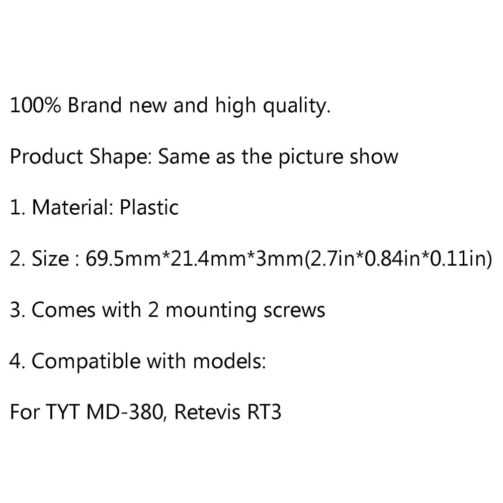 You may also like 1x Wood Grain HG-M84W 4 Pin Noise Cancelling CB Microphone For Cobra Uniden CA 22.79 USD Free shipping RAD2000 360°Laser Electronic Dog Car Mobile Speed Radar Speed Measuring Detector 28.79 USD Free shipping Reverse Camera Parking Rear View Cams CCD Backup Fit for Toyota RAV4 2009 - 2012 15.79 USD Free shipping RH519 Antenna SMA Female Dual Band VHF UHF 144/430Mhz For Baofeng UV82 UV5R 12.79 USD Free shipping Dynamic Moving Guide Line Rear View Reverse Camera Car Trajectory Backup Camera 21.79 USD Free shipping 2PCS SCI R3-11 Panel Mount Chassis Fuse Holder For 5x20mm Glass Fuses 10A 250V 9.79 USD Free shipping 60A MPPT Bluetooth APP Solar Charge Controller Charger For 12V-60V Battery 38.79 USD Free shipping Bluetooth Learning Remote Control For Smart TV Box Wireless Bluetooth UE 9.79 USD Free shipping GA-800 Active Loop Antenna Shortwave Antenna 10KHz-159MHz HF Portable for Radios 129.79 USD Free shipping Car Battery Eliminator Accessories For Hytera PD780 PD700 Radio Walkie Talkie 14.79 USD Free shipping Raspberry Pi 5 Multi-Layer Acrylic Shell Transparent Protective Case Cooling Fan 13.99 USD Free shipping 1x Soft Leather Case For YAESU VX-6R VX-7R VX-7E Two-Way Radio Walkie Talkie 13.79 USD Free shipping The Latest Upgraded 10Khz-180Mhz Donut Broadband Antenna Low Impedance Converter 26.79 USD Free shipping RH519 Antenna SMA Male Dual Band VHF UHF 144/430Mhz For Baofeng UV3R LT6100 12.79 USD Free shipping Industrial 8-Channel Ethernet Relay Module Modbus RTU/TCP Protocol Poe Ethernet 85.79 USD Free shipping 1Pc AL-800 High Gain Dual Band Extendable Antenna SMA-Male For Icom Yaesu Radio 14.79 USD Free shipping SAFE & SECURE SHOPPING 100% SATISFACTION GUARANTEED FAST SHIPPING Store Categories Store Categories Other eBay Motors Computers/Tablets & Networking Business & Industrial Consumer Electronics Health & Beauty Home & Garden Sporting Goods Pet Supplies Toys & Hobbies Bike Camera Musical Instruments Cell Pad Accessories PWC You may also like Solar Photovoltaic Charge Controller 40A 12V Solar Panel Battery Controller Blue 12.79 USD Free shipping 69800mAh Car Jump Starter Booster Jumper Box Portable Power Bank Battery Charger 46.79 USD Free shipping 12V to 24V 5A 120W DC-DC Boost Step Up Power Converter Voltage Regulator YU 23.79 USD Free shipping PD780-326 Orange Round PTT IP65 Waterproof For Hytera PD780/780G/580/788/782/785 27.79 USD Free shipping 8 Keys For Volvo Heavy Equipment Construction Ignition Key Set With Laser Key 13.79 USD Free shipping 10X Flexible Gooseneck Makeup Mirror with LED Light Bathroom Suction Cup 7" US 18.79 USD Free shipping 4Pcs Belt Clip For TYT MD-380 Retevis RT3 Two Way Radio Black Product Description 100% Brand new and high quality. Product Shape: Same as the picture show 1. Material: Plastic 2. Size : 69.5mm*21.4mm*3mm 3. Comes with 2 mounting screws 4. Compatible with models: For TYT MD-380, Retevis RT3 Package Included: 4Pcs About Us Shipping Terms Contact Us Payment About Us Founded in 2012, VIPJQ have professional development and sales, and are involved in various products, providing customers with various high-quality products. Since its establishment, VIPJQ has always adhered to the service concept of "customer first" and the management concept of "pursuit of quality", and is committed to providing customers with high-quality original designs. We commit to provide you the best innovative, quality products & professional services with competitive prices. We value every customer, and we look forward to providing solutions for your business needs to help your business achieve its goals, please contact us immediately! We are all about you! Shipping US Buyers Parcel will ship via USPS/DHL/FedEx from our United States warehouse Shipping time The item usually will be dispatched within 3 days after you ordered. And it usually takes 3-10 working days to delivery depends on buyers' address or other majeure on the way. Service We stand behind everything that we sell and will do everything possible to assure you are satisfied Terms When you receive your purchase if you are not 100% satisfied, please sent me ebay message and we will do our best to meet your expectations. If you still want to return your purchase, simply ship the item(s) back to us and we will refund your original purchase price and the original shipping charge. We must be notified of the intent to return your item within 30 days of receiving the item. How to return 1. Please ask us for return address . 2. Shipping back the package . 3. Send us the return tracking number. 4. Refund full to you when we receive the package. 5. Please leave positive feedback and 5-star rating, it helps us do better for you. Contact Us We can be contacted at any time through eBay messages if you have any questions, comments or product requests. We will respond to you within 24 hours and do our best to help you out! Please give us a chance to resolve the issue before leaving us a feedback. Payment 1. We Accept Visa, Master, Amex, Google Pay,Discover, Paypal, etc, many payment ways. 2. Item will be shipped immediately on the same or next business day of receiving your payment. Copyright © 2022 Tongtool 3-Pack For Apple Watch 8 7 6 SE Full Screen Protector iWatch 38/42 40/44/45mm 3.87 USD Free shipping For Samsung Galaxy S22 Ultra S21 Clear Case Magnetic Mag Safe Plating Cover US 3.89 USD Free shipping For Apple Watch Ultra 2 Series 8/7/6/5/4/SE 45/44/42/38mm Case Screen Protector 2.74 USD Free shipping For Samsung Galaxy S22 S21 Ultra + Tempered Glass Camera Lens Screen Protector 7.87 USD Free shipping