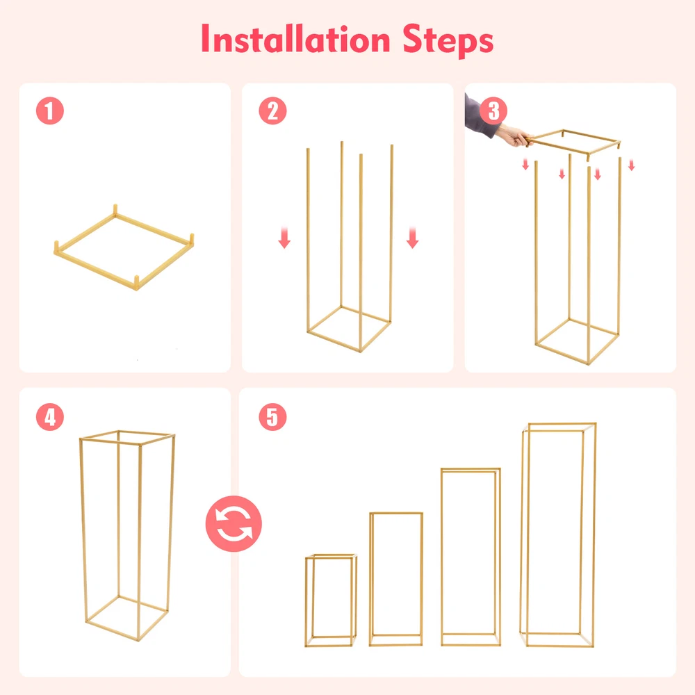 Type: Metal Flower Stand Material: Steel, Plastic Mounting Type: Desktop Placement, Freestanding Number of Items: 4 shipping notice: Can't not ship to Puerto Rico,Alaska/Hawaii Style: Modern Brand: Unbranded gtin13: Does not apply Process: High-temperature Baking Paint Process Theme: Art Deco Assembly Required: yes Shape: Rectangular UPC: Does not apply MPN: Does not apply Occasion: All Occasions Square Tube Diameter: 10mm/0.3inch Set Includes: N/A Color: Gold