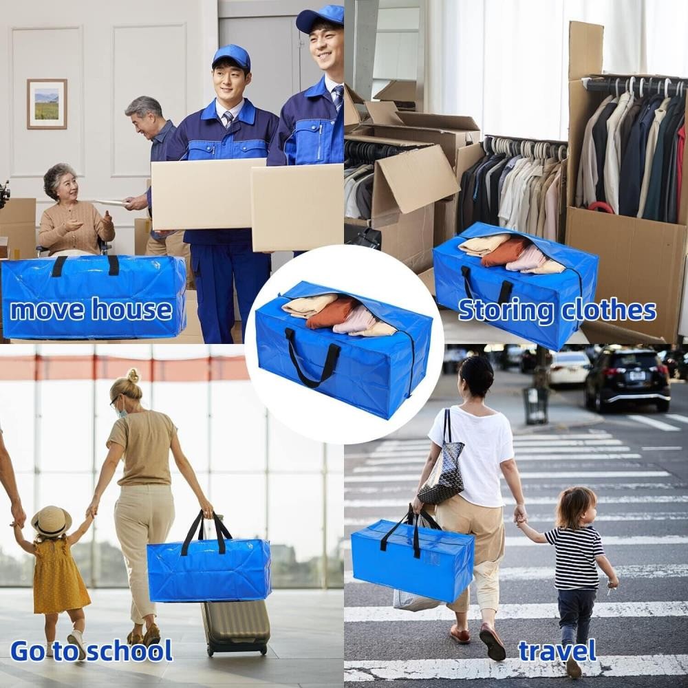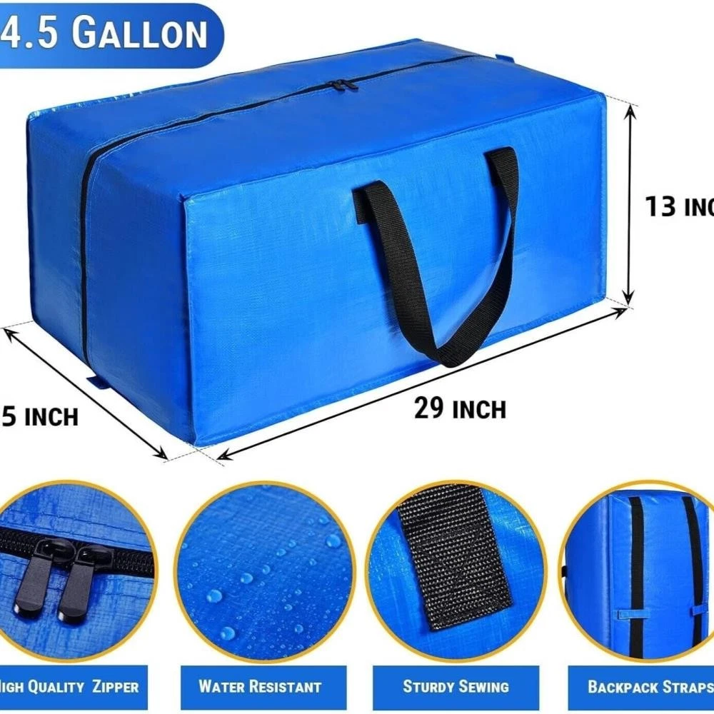 Key Features: ��� EXTRA LARGE CAPACITY: The 24.5 gallon moving bags with zipper, Size 29" X 15''X 13" H, blue packing bags with handles can hold plenty of clothes. Made by 180gsm PP material, thicker than others’ 120gsm or 150gsm, foldable to a small size when not use. ��� HEAVY DUTY HANDLES: The extra large moving bags feature wide and thick handles with multiple layers of reinforcement and strong nylon thread stitching, along with top quality zippers, largely enhanced the load-bearing possibility, this blue bags with handles can safety hold up to 80lbs. ��� CONVENIENT BACKPACK STRAPS: Designed the blue moving bags with handles and backpack straps, Upgraded shoulder strap allows for easy carrying on your shoulders, stylish and save effort, you can use it for moving to college dorm, new house freely, or as traveling backpack. ��� LARGE OPENING WITH ZIPPERS: Features a high-quality dual zippers closure that opens all the way down side, provides the heavy duty moving bags a LARGE OPENING when to pack and unpack. ��� VERSATILE MOVING & STORAGE: Alternative to moving boxes medium and large or plastic storage bins, the heavy duty storage bags is flexible for clothing storage, purses, shoes, extra beddings, blanket, comforters, pillows, wardrobe boxes, home organization, Christmas holiday decorations; moving to new house/department, college students dorm room essentials. Specifications: 1.Color: Blue 2.Size: 29*15*13 3.Material: PP 4.Special Feature: Foldable, Large Capacity, Handle 5.Load Capacity: 80 Pounds 6.Number of Items: 4