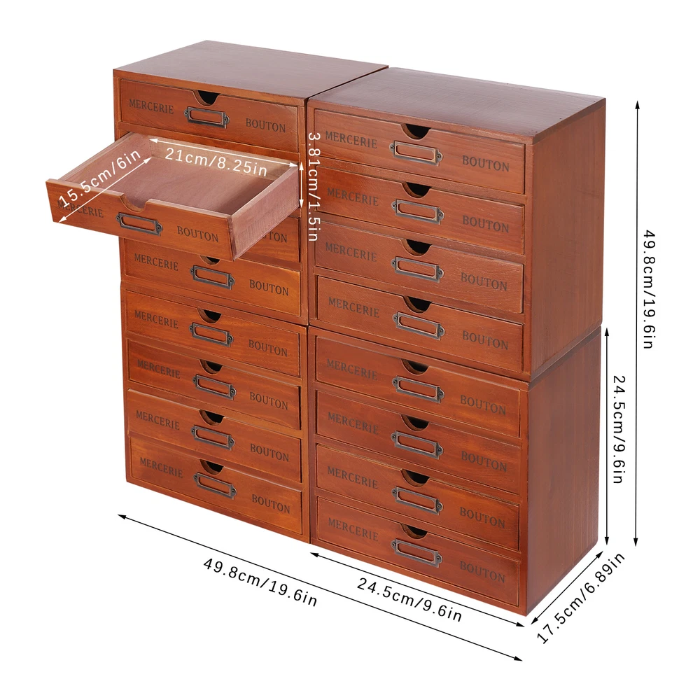 Specifications Style: Retro Color: Brown Material: Pine Wood, Iron Process: Spray Painting Shape: Rectangular Assembly Required: No Number of Drawers: 16 Number of Items: 4 Mount Type: Tabletop Each Drawer Max. Load-bearing Capacity: 1kg/2.2 lbs Total Max. Load-bearing Capacity: 16kg/35.27lbs Each Drawer Size: 21*15.5*3.81cm/8.25*6*1.5inch Each 4-tier Drawer Organizer Size: 24.5*17.5*24.5cm/9.6*7*9.6inch Overall Size of 4 Stacked Drawer Organizers: 49.8*17.5*49.8cm/19.6*6.89*19.6inch Package Size: 57*41*32cm/22.44*16.14*12.6inch Gross Weight: 10kg/22.05lbs Net Weight: 8.8kg/19.4lbs Package Included 4* Drawer Organizers 4Pcs Retro Drawer Organizers, Wooden Desktop Organizer, Wooden Storage Box Brown Description This drawer organizer set is a four-piece set, including 16 drawers. It is designed to make full use of space and achieves fine classification storage so that it will make your life and work more orderly. The retro style shows an antique charm, which can express a refined sense of fashion. This product has a small footprint and lots of storage space, making your life more organized and tidy, get it now. Key Features High-quality Material: The drawer organizer set is made of pine wood with a painting spraying process, which has good corr osion resistance, is sturdy and durable, and can be used for the long term. Vintage Appearance: The pleasing brown color, vintage metal label holder, rectangular structure, and smooth lines give it a retro style, adding beauty and vintage elements to your room. It plays a unique decorative role while using, bringing an old-world charm into your new-world home. Set of 4: Our package includes 4 pieces of organizers, including a total of 16 large-capacity drawers, which are enough to easily store jewelry, cosmetics, documents, and other small items, making your desktop cleaner . You can use these wooden storage boxes as a set or separately for different areas in your home. ' ' Excellent Load-bearing Capacity: Thanks to its thickened material and rectangular structure, each drawer can hold about 2.2 lbs of items, and this product can hold about 35.27 lbs in total, so you can use it with confidence. Space-saving: The size of a single drawer is 8.25*6*1.5inch , which occupies a small area and the multi-tier design uses vertical space rationally, so you get more space to store items without taking up too much desk spac e. Moreover, they are stackable for your convenience. Convenient to Use: Hollow-out handle on each drawer makes it easier to pull out and close the drawer, which not only provides convenience but also enhances the aesthetics of the entire product. Ready to Use: It does not need assembly, so you can directly use it after receiving and cleaning it, greatly saving time and effort. Easy to Clean: With a smooth surface and detachable drawers, it is very easy to clean with a damp cloth (not included). Ideal Gift: With a delicate outlook and practical storage function, it is a wonderful housewarming, wedding, or festival gift for your families, friends, or colleagues. Protective Package: Foam can effectively reduce the normal impact and ensure that it is fully delivered to you to the greatest extent. Details Iron Label Holders: They allow you to write the labels (not included) for each drawer to categorize, helping you quickly find desired items. Smooth Edges: Smooth and burr-free edges no t only increase the beauty of the product but also improve the safety of use. Application This product can be used in living rooms, bedrooms, study rooms, offices, dormitories, schools, and other places. It can be used to store cosmetics, files, books, letters, papers, magazines, tea bags, sugar packets, necklaces, earrings, bracelets, rings, perfumes, lipsticks, household medications, herbs, nutrition-related capsules, and other items. Specifications Style: Retro Color: Brown Material: Pine Wood, Iron Process: Spray Painting Shape: Rectangular Assembly Required: No Number of Drawers: 16 Number of Items: 4 Mount Type: Tabletop Each Drawer Max. Load-bearing Capacity: 1kg/ 2.2 lbs Total Max. Load-bearing Capacity: 16kg/35.27lbs Each Drawer Size: 21*15.5*3.81cm/8.25*6*1.5inch Each 4-tier Drawer Organizer Size: 24.5*17.5*24.5cm/9.6*7*9.6inch Overall Size of 4 Stacked Drawer Organizers: 49.8*17.5*49.8cm/ 19.6 *6.89* 19.6 inch Package Size: 57*41*32cm/ 22.44 * 16.14 * 12.6 inch Gross Weight: 10kg/ 22.05 lbs Net Weight: 8.8kg/ 19.4 lbs Package Included 4* Drawer Organizers Notes The material of the product is pine wood, so the surface may have some flaws, which is a normal phenomenon. Please check the quantity carefully after receiving the product. Please note that this product does not include other items shown in the picture. Please do not place it in a damp place or near an ignition source. Please allow the slight color difference caused by the shooting light and 1-3cm error due to manual measurement, and make sure you do not mind before you order. Payment Delivery details Terms of sales About us Contact us Payment We accept ebay payment 。 Fees such as import duties, taxes are not included in the item price or shipping costs. These charges are the buyer's responsibility. Delivery details Shipping: 2-9 working days to: USA Terms of sales We maintain high standards of excellence and strive for hundred percent customer satisfaction. Feedback is very important to us. We hope that you contact us immediately before you give neutral or negative feedback, so that we can address your concerns. It is impossible to address issues if we do not know about them! About us Your satis faction is our ultimate goal. We work hard to earn your trust and future business. Our certified technicians have tested each item before shipping. The unit comes with 1 year limited warranty on all manufacturing defects. a) If you receive a defective item, you may return it or ask for a discount. Please contact us within 14 days after you receive the package. b) What you returned must be intact and i