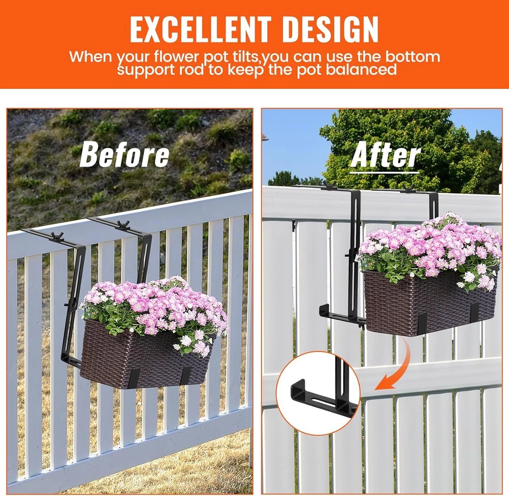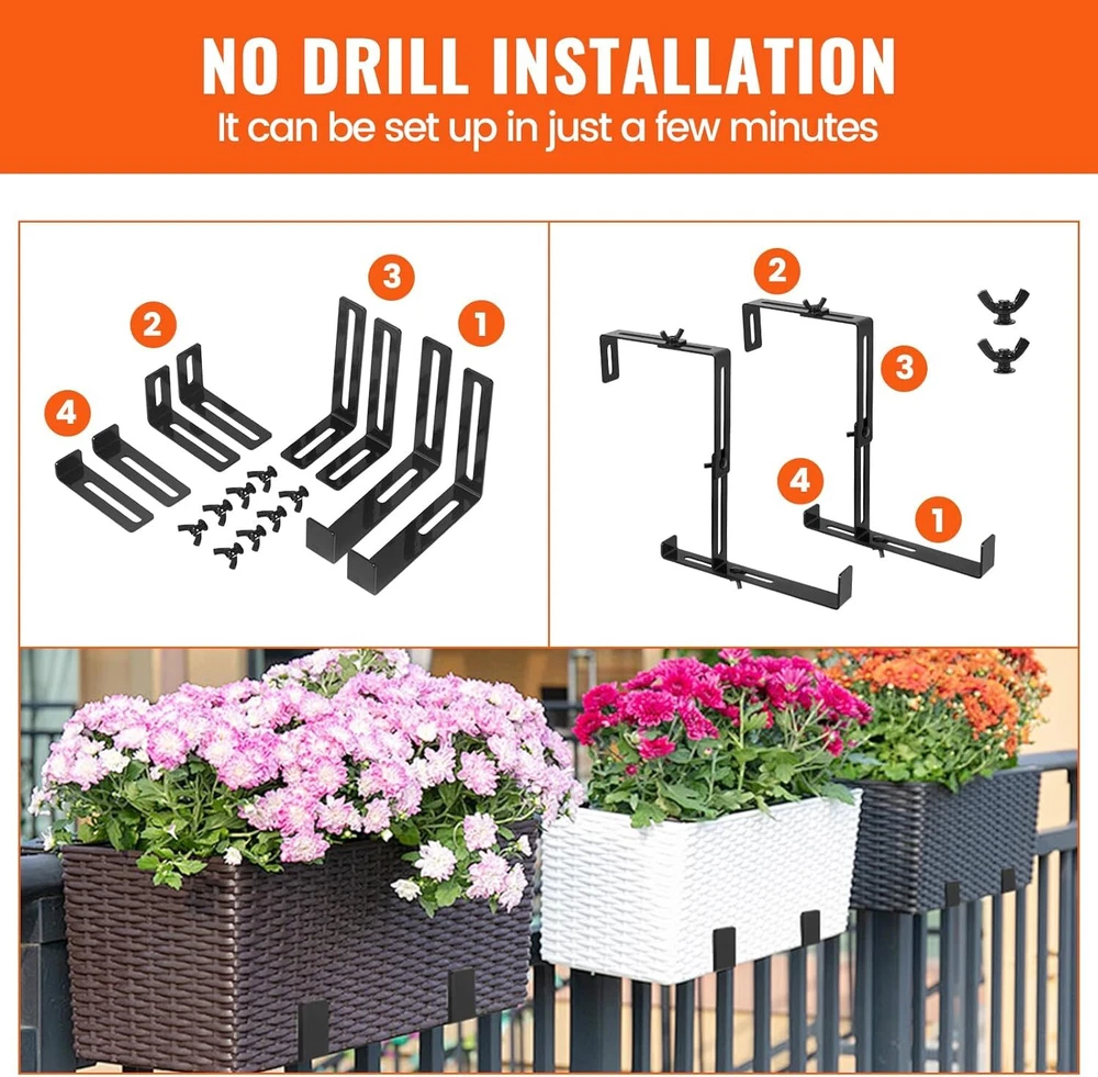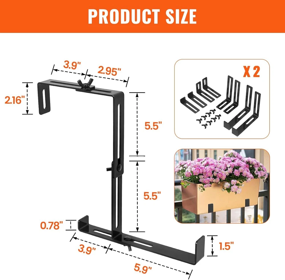 4Pcs Steel Window Box Brackets Adjustable Planter Box Brackets for Railings Details: 【Adjustable Planter Bracket】 The set of 4 window box brackets feature an adjustable top and middle design. The top width can be freely adjusted to accommodate your railing width, ranging from 3 to 8.3 inches, while the middle height can be adjusted from 5.5 to 9.8 inches, allowing you to customize the size to meet your specific needs. Enjoy the freedom to personalize your space with ease! 【Sturdy & Durable】 Made of high-quality steel with a 3mm/0.12in thickness and coated with a protective powder finish to prevent fading and corrosion. Featuring non-rusting, enduring carbon steel screws, guaranteed to provide great support for your planters. The maximum load capacity is up to 90 lbs. 【Excellent Design】 Are you still worried about the flower pots being too heavy or the railings being too thin and tilting? To prevent this issue, we've added a flexible support bar at the bottom. This component allows you to adjust it to your specific usage requirements, ensuring optimal positioning of your pot. 【No Drill Installation】 Say goodbye to drilling holes or damaging surfaces. These no-drill planter box brackets are easy to install without the need for any tools, saving you time and effort. You can set it up in minutes and enjoy its stability for years to come. 【Wide Application】 Our flower box brackets are ideal for indoor and outdoor use, and suitable for places where hanging flower pots are required, such as courtyard walls, balconies, terraces, railings, etc. Enjoy the freedom to hang your plant or flower pots wherever you'd like! Specifications: Material: Carbon Steel Quantity: 4 Pcs Color: Black Thickness: 3mm/0.12in Adjustable Top Width Range: 3 to 8.3 inches Adjustable Middle Height Range: 5.5 to 9.8 inches Net Weight: 4.4lb Package Included: 16 x Brackets 16 x screws 16 x nuts VICBAS 4 Pcs Adjustable Planter Window Box Brackets Sturdy & Durable, Simple Installation. Enhance the beauty of your outdoor space with the LFGUD 4 Pcs Window Box Brackets. These adjustable planter box brackets are designed to securely hold flower boxes, making it easier than ever to create a stunning display of vibrant blooms. The top width can be freely adjusted to accommodate your railing width, ranging from 3 to 8.3 inches, while the middle height can be adjusted from 5.5 to 9.8 inches Made of high-quality steel with a 3mm/0.12in thickness and coated with a protective powder finish to prevent fading and corrosion. The adjustable design allows you to easily customize the sizing to fit your specific needs, ensuring a perfect fit every time. To prevent this issue, we've added a flexible support bar at the bottom. This component allows you to adjust it to your specific usage requirements, ensuring optimal positioning of your pot. These no-drill planter box brackets are easy to install without the need for any tools, saving you time and effort. You can set it up in minutes and enjoy its stability for years to come. 16 x Brackets 16 x screws 16 x nuts Our flower box brackets are ideal for indoor and outdoor use, and suitable for places where hanging flower pots are required, such as courtyard walls, balconies, terraces, railings, etc. Enjoy the freedom to hang your plant or flower pots wherever you'd like! FAST SHIPPING WARRANTY EASY RETURNS CONTACT US FAST SHIPPING We only ship to US mainland 48 states and worldwide via ebay international shipping program. We don't offer direct international shipping. Consult us if you live in Hawaii, Alaska or Virgin Islands. Also we don't ship to any APO/FPO/PO BOX address. We offer FedEx Ground or Home delivery in optional which can make it faster, charge additional shipping fee. Delivery is any day from 1-5 business days (Monday through Friday, excluding weekends and holidays) WARRANTY This item is covered by our 12 months unlimited mileage warranty. Any customer may use the same outlets to facilitate a return or warranty claim. Any item must be returned within 30 days of the original purchase for refund; item(s) retaining a warranty may be returned beyond 30 days but within the remaining warranty period. Returns that are not subject to warranty may accrue a restocking fee and should be returned at the customers cost. We reserves the right to request proof of purchase and mechanical failure in the event of any warranty claim; any returns or claims that violate Ebay's Online Return policies will be reported. We holds no responsibility or liability for additional repairs, damages (punitive or non-punitive), loss of time, or any other extraneous circumstances created by a purchase made from said party. EASY RETURNS We understand that sometimes you need to make a return or an exchange. All we ask is you send it back in the same condition it was received - new and un-used. If the product you receive is not the one you ordered, please take photos of any visible of visual reference and contact us directly; photos must be CLEAR and VISIBLE. Logistical claims must be filed within 30 days of received the product; exchanges in these cases will be handled promptly and at?no cost to the customer. In order to process a return or exchange, please call us or send us a message through eBay and we will be happy to assist you immediately. However,any return that is NOT defective or NOT received in error, is the responsibility of the customer. We DO NOT cover any shipping costs and/or additional fees associated with the transaction. CONTACT US We are open Monday to Friday 8am to 5pm Mountain Standard Time, and Saturday 9am to 1pm MST. Our friendly staff are available during these hours. Please feel free to call us, or send us a message via eBay. We aim for complete customer satisfaction and repeat business; we will be more than happy to help you feel 100% comfortable with your purchase.