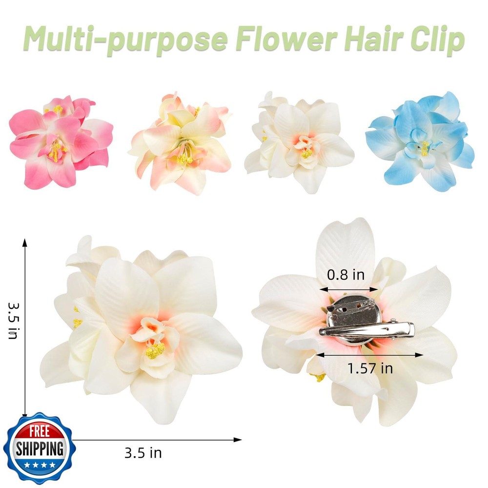 4Pcs Hawaiian Flower Hair Clips for Women, 3.5 Inches Artificial Tropical Hair Clip Hibiscus Claw Clip Beach Vacation Party Boho Hair Accessories for Women Girls Features Super Cute & Vibrant - Hawaiian flower hair clips are colorful and eye-catching, adding a fun, tropical touch to your hair and making you look cute and attractive. With 4 different colors, Hawaiian hair accessories will complement any outfit Easy to Wear & Secure - Lightweight and comfortable, handmade flower clips for hair feature an alligator clasp that’s simple to put on and take off, while securely holding your hair without causing damage. Hibiscus hair clips can also be used as button clips for hats or clothing, adding a charming touch to accessories like bikinis, hats, bags, and more Wide Application - Flower claw clips are perfect for a variety of occasions like Hawaiian parties, beach vacations, poolside events, cruises, photo shoots, or daily wear. Floral hair accessories are a must-have for summer fun Durable & High-Quality -Crafted from high-quality materials to ensure long-lasting use and vibrant color, flower hair pins are designed to withstand wear without fading Great Gift Idea - Charming summer flower clips make a perfect gift for birthdays, holidays, or any occasion. Ideal for women and girls who love fun, stylish accessories, they are sure to delight anyone who enjoys adding a tropical or beachy vibe to their look. Perfect for friends, family, or as a thoughtful treat for yourself Shipping Free & Fast Shipping: We offer free shipping to most of the USA with a normal delivery time of 3-7 days. However, due to the current situation, additional delivery time (up to 3 weeks) may be required for some items. Alternative Carriers: We may use alternative carriers (e.g., USPS, FedEx, UPS) to ensure your package arrives safely and on time. Due to the use of multiple carriers, we are unable to provide a tracking number automatically. Handling Time: Orders are processed and shipped within 1-2 business days of receiving cleared payment. Shipping Restrictions: Shipping to Alaska, Hawaii, Puerto Rico, Guam, and other US territories may incur shipping charges or delivery restrictions. Please contact us before ordering, or your order can be refunded/cancelled. State Restrictions: Certain items may not be shipped to California due to state regulations. Contact for Tracking Updates: If you require tracking updates or have any concerns about the delivery of your order, please feel free to contact us, and we will be happy to assist you. Return Policy 30-Day Hassle-Free Returns: If you are not completely satisfied with your purchase, you can return the item for free within 30 days of receiving it for a full refund or exchange. Easy Return Process: Contact us, and we will provide you with a prepaid return shipping label and detailed instructions. No Restocking Fee: There are no restocking fees for returns. However, the buyer is responsible for return shipping costs if the return is not due to a seller's error. Refund Processing: Refunds will be processed within 1 business day of receiving the returned item in its original condition. Feedback Your feedback is extremely important to us. We strive to provide the best products and customer service possible. If you are satisfied with your purchase, please take a moment to leave us a positive review. If you have any concerns or issues with your order, please contact us before leaving negative feedback. We are committed to resolving any problems and ensuring your satisfaction. Contact Us If you have any questions or concerns, please feel free to reach out to our customer support team. You can contact us through the eBay messaging system. We are available Monday to Friday, 9:00 am to 5:00 pm EST, and we will do our best to respond to your inquiry within 24 hours. Thank you for supporting our small family business!