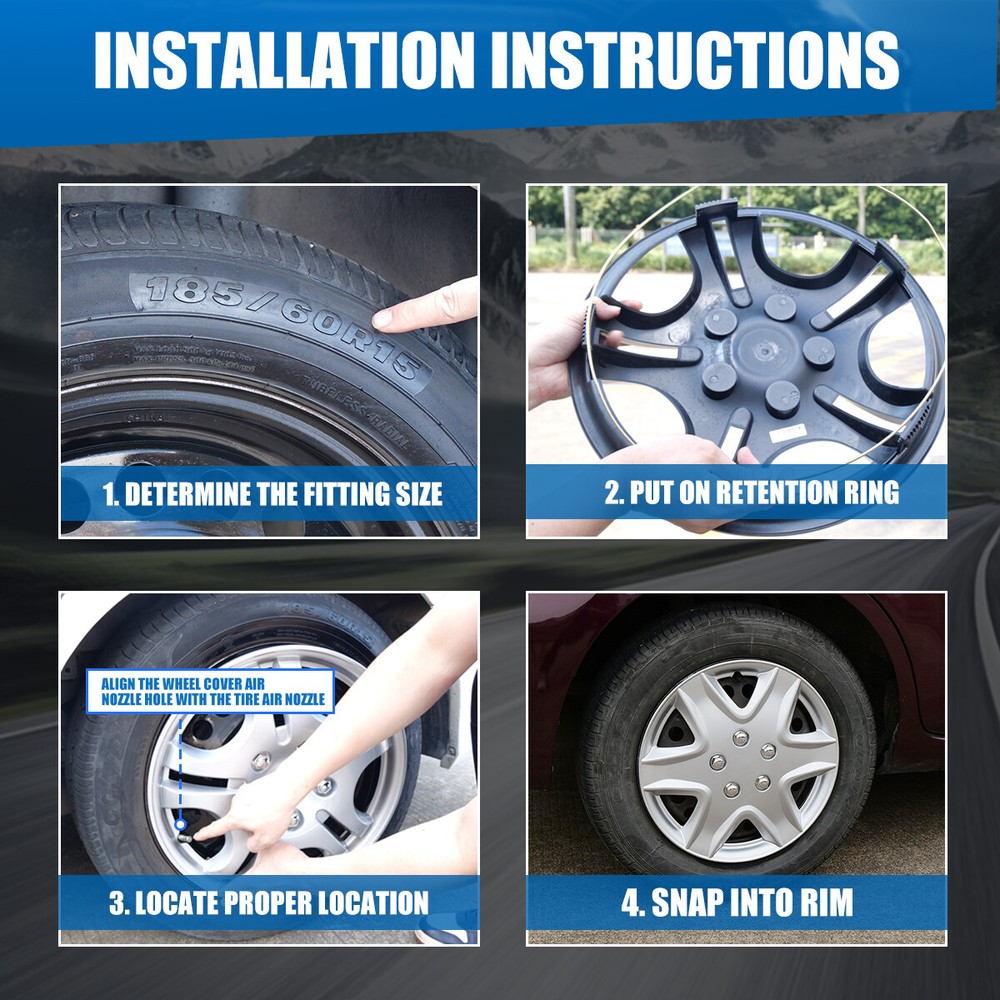 4Pcs/Set 15" Wheel Skins Snap On Rim Covers Hub Caps Universal Fitment Feature: π Please Ensure to Check your Tire/Wheel Size Before Purchase! Designed for (P15) 15" Stock Steel Wheels and will not fit over alloy wheels π For Replacement with Fast & Easy Snap-on Installation - Made from Premium ABS Material β Lab & Road Tested for Performance and Ultimate Durability π Adjustable Retention Rings assures Firm Grip Gives Support to the Hubcaps Making Sure They Stay in Place. Locate the Curve on the Retention Ring and Match to the Tire Air Valve to Install π Installation Instructions & Video Available - Please refer to the Video and images available as well as detailed instructions below for assistance π Wolfx Wheel covers fit most models of vehicle brands including Acura, Chevrolet, Dodge, Ford, Honda, Hyundai, Kia, Mazda, Mitsubishi, Nissan, Subaru, Toyota, Volkswagen and more Specification: Quantity: 4 PCS Material: ABS Color: Glossy & Silver Lacquer Wheel Size: 15 inch Finish: Glossy Placement on Vehicle: Front/Left/Rear/Right Package Includes: 4* Wheel Cover Hubcaps Payment Delivery details Terms of sales About us Contact us Payment π We accept PayPal (Recommended), credit card, VISA, Google Pay & Discover etc. π Please submit your payment within 7 days after your purchase. π If not, eBay will automatically open an Unpaid Item Dispute on our behalf if the item(s) are not paid within 7 days. Delivery details π Please double check your delivery address and contact information. π All items will be shipped within 1 business days after payment received. π Tracking numbers will be easily accessible ASAP they are created and processed. Terms of sales π Free 60 days Return, we will cover the return post fee. π If a defective product was received, please do not hesitate to message us via eBay message. π We will response in 24 hours in business to resolve the problem π We stand behind our products. Items can be returned for exchange or full refund within 60 days from the date you receive. About us π Wolfstorm has a huge warehouse and office located in the United States. π All US domestic 48 states customers are able to benefit from the FREE SHIPPING services. π Our experienced, professional customer service representatives offers prompt and courteous service. π Best quality products, outstanding services and professional experience keep our customers. Contact us π Please feel free to contact us if you have any problems. π Emails will be replied within 24 hours in working days. π After hours emails will be replied on the next business day.