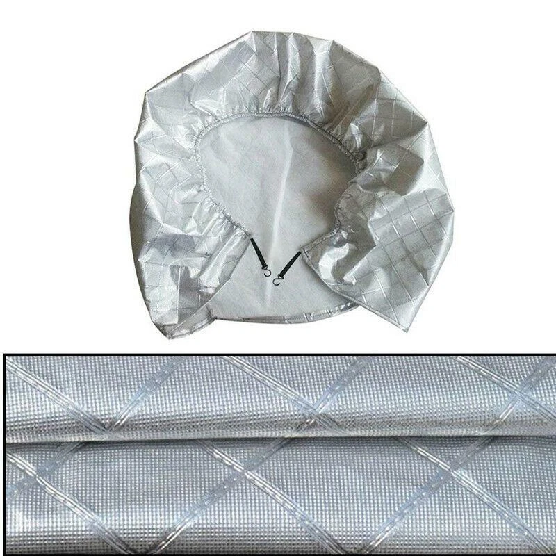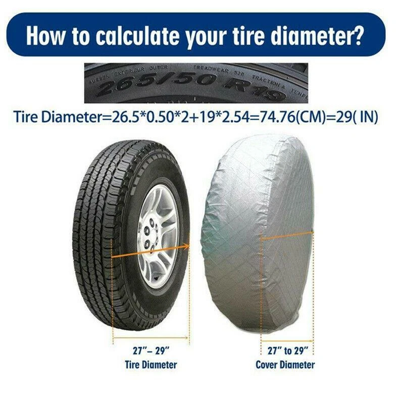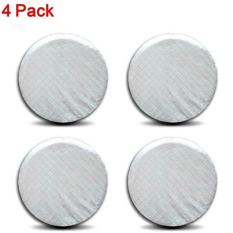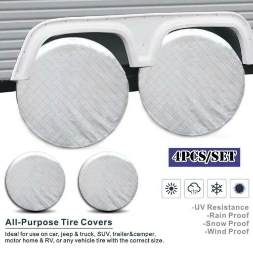 4Pcs Waterproof Wheel Tire Cover For 26" to 27'' Dia RV Trailer Camper Car Truck Features: Application Fits 26" to 27" tire diameters.It has a wide scope of application. Ideal for use on RV, trailers, campers, cars , trucks and so on. Easy Installation It is easy to install, remove and clean;no tools required. Fold and Hook Design Folds up compact for easy storage. Fast and easy slip-on design.Hook design is not easy to be blown away by the wind ensures more secure fit. Durable Waterproof Aluminum Material This tire cover is made of waterproof aluminum material, thick cotton wool lining, durable. It’s Protect the tires and wheels from sun damage, dirt,rust, corrosion and all types of weather when your vehicle is parked. Keep your tires free of scratches, in order to make your tires life more durable. Because tires left exposed to the sun and other environmental hazards will deteriorate much faster than you might think and could potentially lead to on-road blowouts as well as costly replacement. Specification: Material:Aluminum film material+ Cotton Wool Lining+2 plastic hooks Size: 26" to 27" tire diameters Package Included: 4PCS Aluminum Film wheel covers Note: Please do not overexert tear your aluminum film tire covers be sure treat it carefully Please allow 2-3 cm size difference.for some Construction vehicles, climbing cars, tractors this tire cover may not applicable eBay Cross Border Trade powered by ChannelEffect