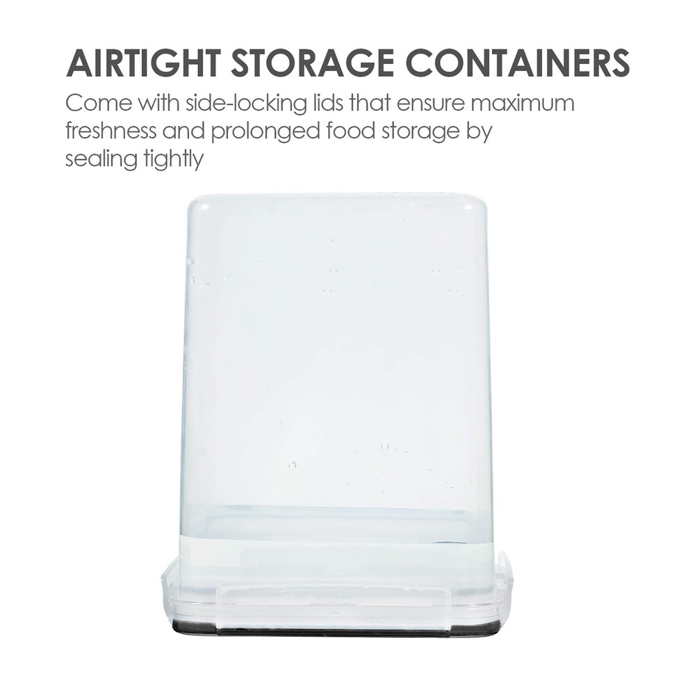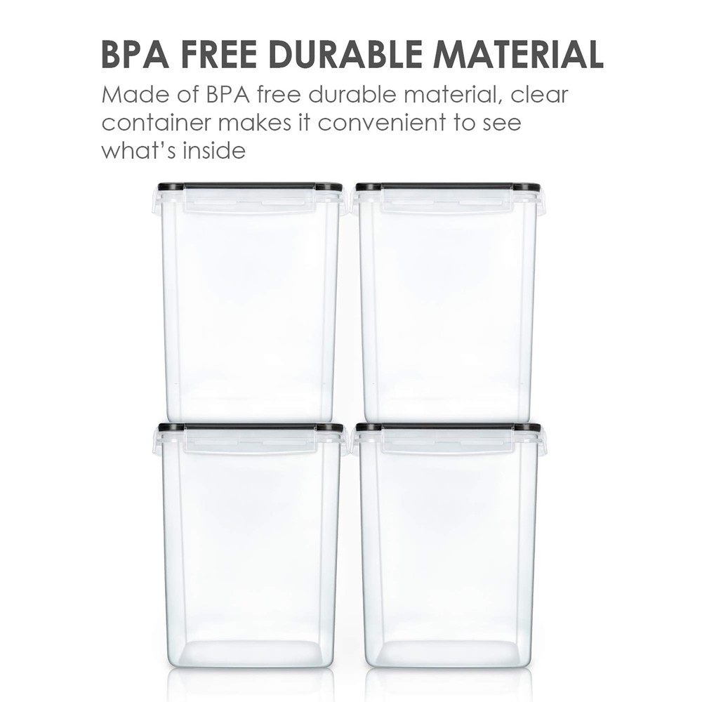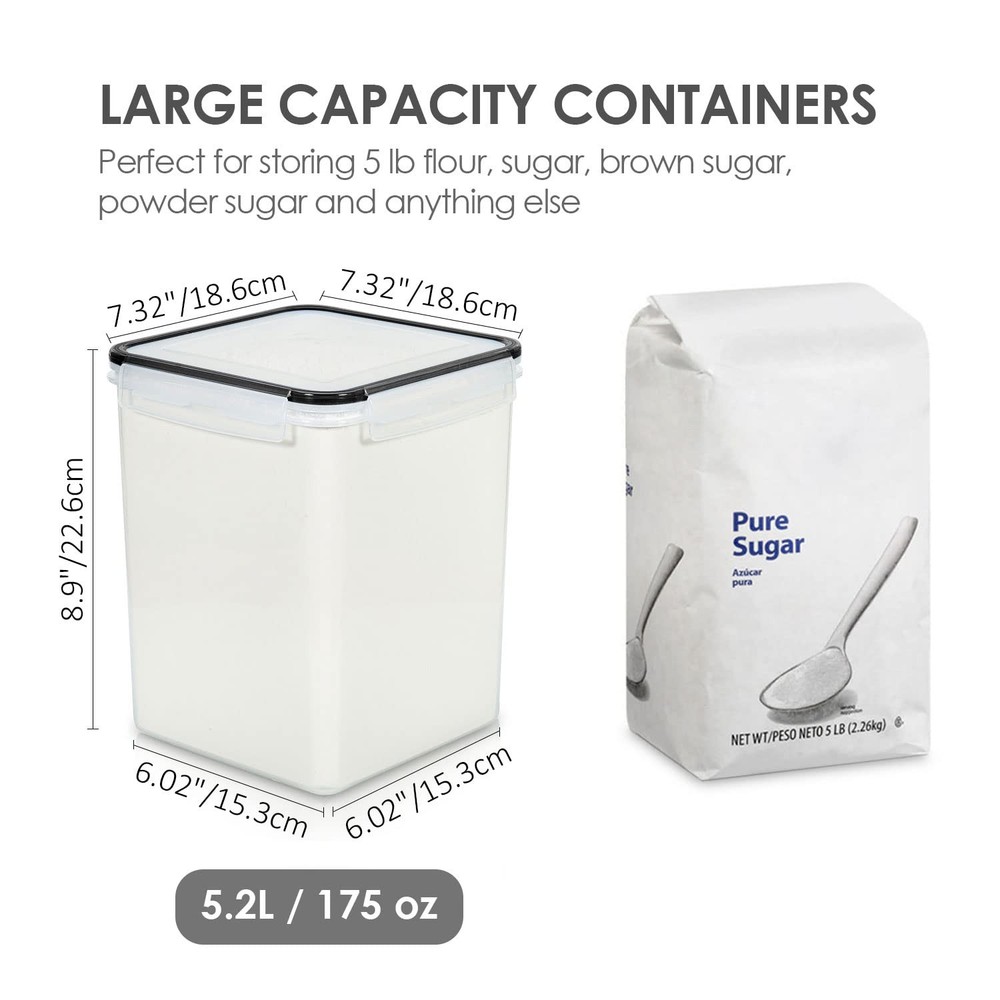 Make a Huge Difference in Pantry Organization ---- If you already got tired of messy flour and sugar bags, then don't hesitate to choose our large food storage containers. These flour containers will make everything looks neat and in order. Come with 4 premium food storage canisters, 4 measuring cups, 24 chalkboard Labels, this container set will also be an ideal gift for any family. Perfect for Storing Dry Food ---- The size of each container is 7.5 x 7.5 x 9.1 inch ( 5.2L / 175 oz) , with the large capacity, these kitchen storage containers are perfect for many kinds of dry food and baking supplies, such as flour, sugar, rice, grain, chips, cereals, nuts, beans, snacks, pasta, coffee and tea. Plus wide enough openings to reach in with measuring cup. Made from High-Plastic ---- These pantry storage containers are made from high-BPA free plastic, which has decent quality. Containers are fairly sturdy and nice looking, which are worth every cent you paid for them. The clear plastic let you see what is in the container, you can get what you want easily without opening every container. Seal Securely ---- airtight food storage containers come with Side-locking lids that ensure maximum freshness and prolonged food storage by sealing tightly. They will protect your food from air and water, so you don't need to worry about your favorite foods turning stale anymore! Please ensure that the lid is lined up properly in order to close them. Stackable Design ---- With the stackable design, these plastic storage containers will make more efficient use of every inch of your home kitchen. Whether you have a large or small pantry, these durable containers will help you organize your kitchen and pantry better. Easy to clean and dishwasher safe, please hand wash the lid.