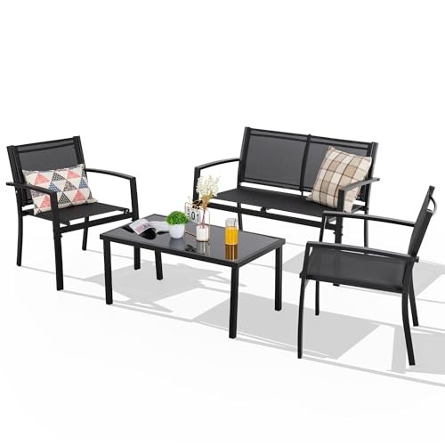 Return Policy Fast Delivery Trusted seller 4 Pieces Patio Furniture Set All Weather Textile Fabric Outdoor Conversation Set, with Glass Coffee Table, Loveseat, 2 Single Chairs for Home, Garden, Lawn, Porch(Solid Black) Product Description Comfortable Textile Material: The back and seat of the chair are made of textile materials with many meshes. It is one of the selected materials for outdoor furniture. This quality material is very breathable and you will enjoy it even in the summer. When it’s dirty, just wipe it with a wet or dry cloth. Sturdy and Durable: The frame of the whole set is made of Powder-coated steel tubes. According to the principle of structural mechanics, the unique support structure of the set can provide stronger and stable support for you. This kind of steel tube is resistant to deformation and aging, for long service life. And the Powder-coated can reduce the erosion of the frame by rain. Modern and Simplicity Design: The appearance of the 4 pieces patio furniture set is designed by a professional furniture team. The fashionable style and exquisite workmanship can suitable for patio, garden, porch, Lawn, living room, poolside. To prolong its service life, please put it under a cover in rainy days. Easy to Install and Move: The installation method of the set is simple and direct, with the attached installation instructions. The curved back of the chair allows you to lift it up. With this design, you can move the set easily. Besides, it prevents you from leaving scratches on the floor when you move the chair. Package Include: The set includes a glass table, a double chair and two single chairs. It will provide convenience and leisure. We trust you will enjoy it in all circumstances. In addition, cushions and throw pillows in the pictures are not included. Shipping Returns Payment Shipping Shipping is FREE to all addresses other than APO/PO boxes in the lower 48 states. All our stock ships from US-based warehouses. Shipped via USPS or UPS (depending on location and package weight) Unless stated otherwise, all orders will ship within 24-72 hours of your payment being processed. Check our feedback to see the great reviews of FAST shipping we offer. Returns Seller does not accept returns Payment We currently accept payment via eBay managed payments only. Once payment is cleared, we will dispatch your shipment within 1-3 business days. Please refer to the "Shipping" tab for more information regarding shipping speed to your destination.