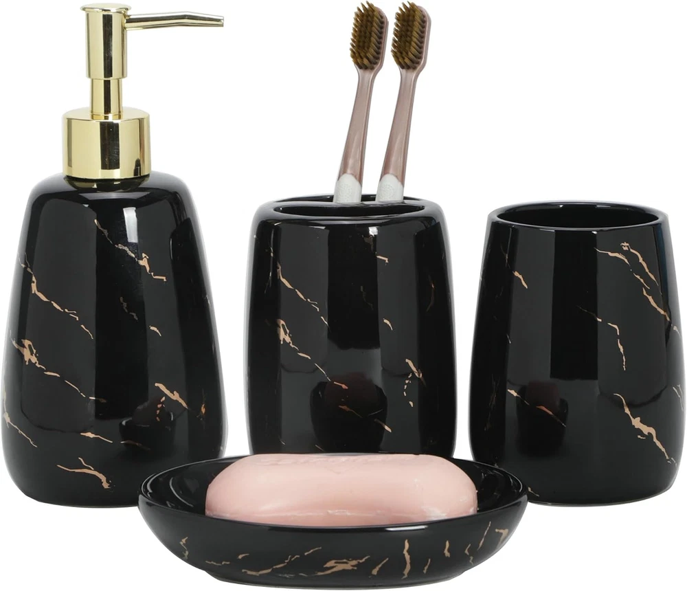 100% Ceramic Complete Bathroom Accessories Set -- 4 pieces bathroom soap dispenser set includes a dispenser pump, a toothbrush holder, a tumbler, a dish. Perfect for storing your toiletries and keep your bathroom counter fully organized neatly. Classic Design -- Unique marble look design. Outfit your new bathroom or upgrade your current bathroom accessories set with its exquisite design, giving your bathroom a touch of elegant style. Premium Materials -- All pieces of bathroom sink set made of high-quality ceramic, perfect for daily uses, simply rinse and wipe with a soft cloth. Ideal for Gift -- This set is a wonderful housewarming present. Perfectly gift for your friend, family, business partner. The 4 piece kit is both useful and will beautify the home - the best choice! 100% Customer Service -- We are committed to presenting the best quality materials and satisfaction services to our customers. If you have any issue with the contemporary bathroom accessories set, and Fully refund or Free replace. We are small family business, all our products desinged and produced by ourself. We have our own brand. We are trying to make our products in best quality with best price for customers. Please feel free to if there is any requirements. Thank you for your support on our small business. God bless you and your family.