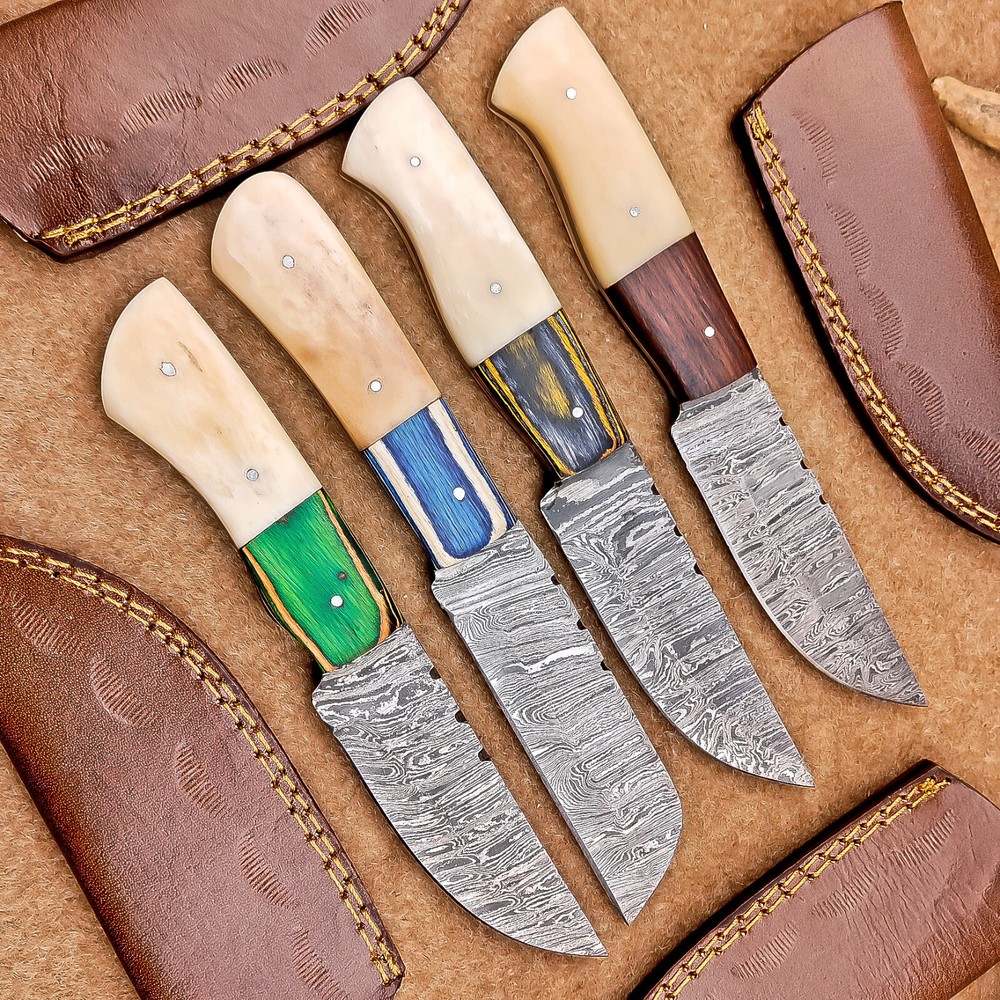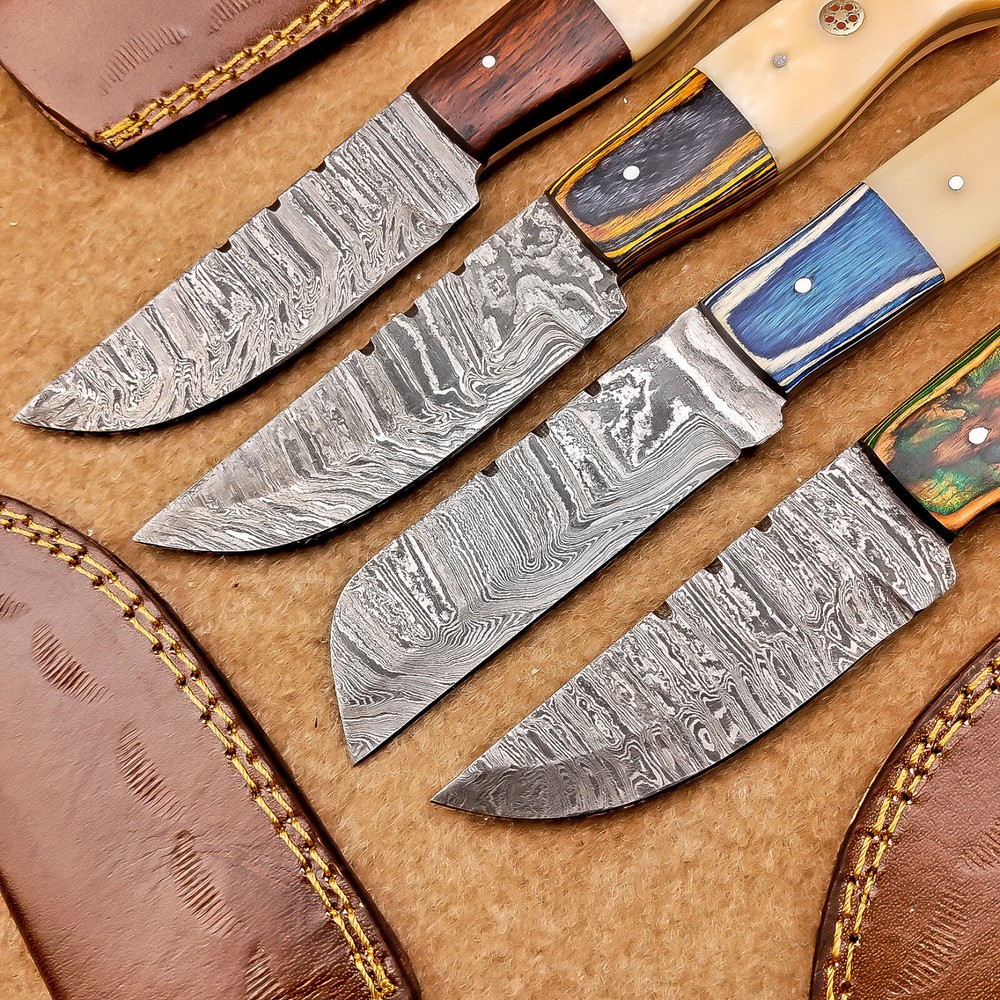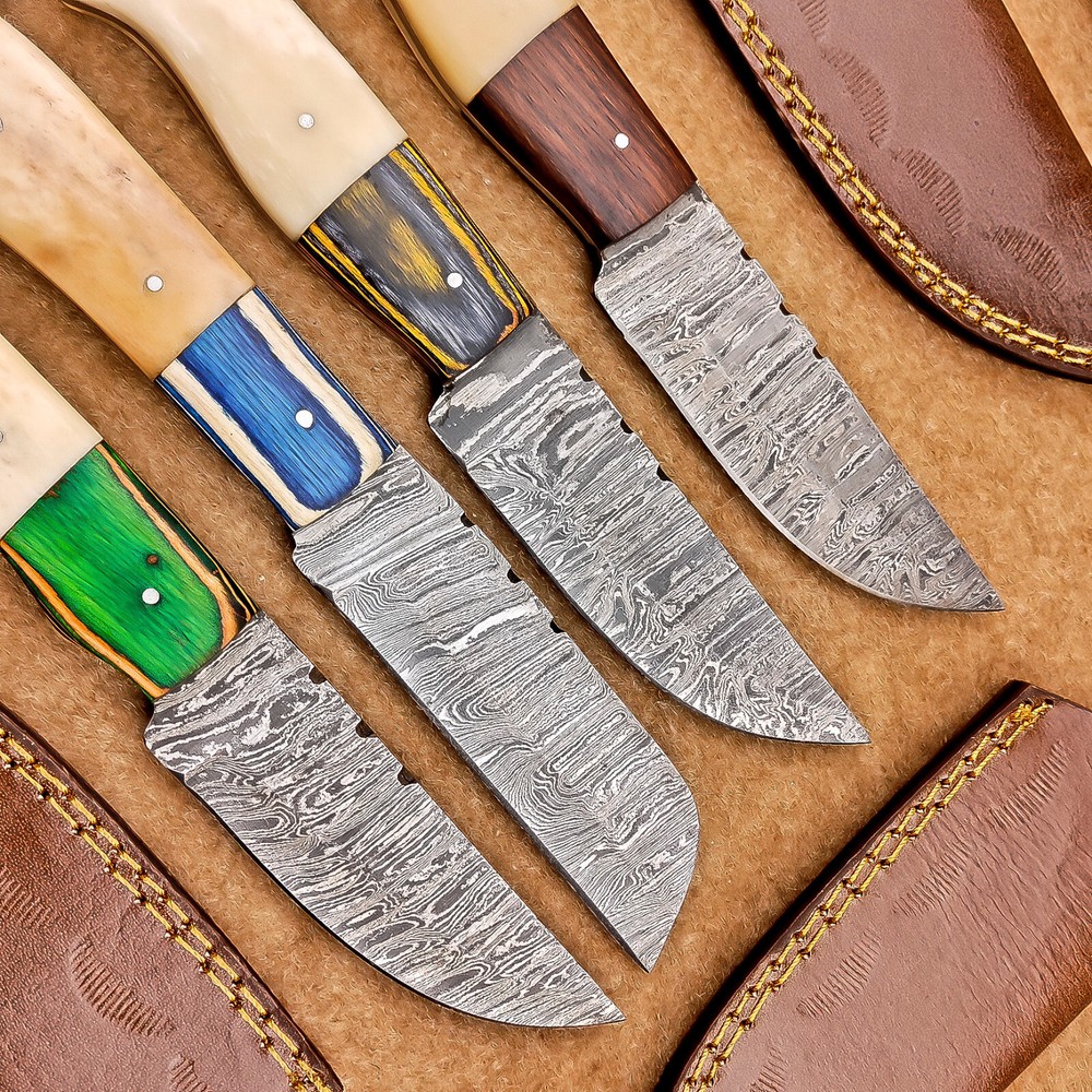 4-Piece Damascus Skinner Knife Set with 8" Blades, Bone Handles & Leather Sheaths